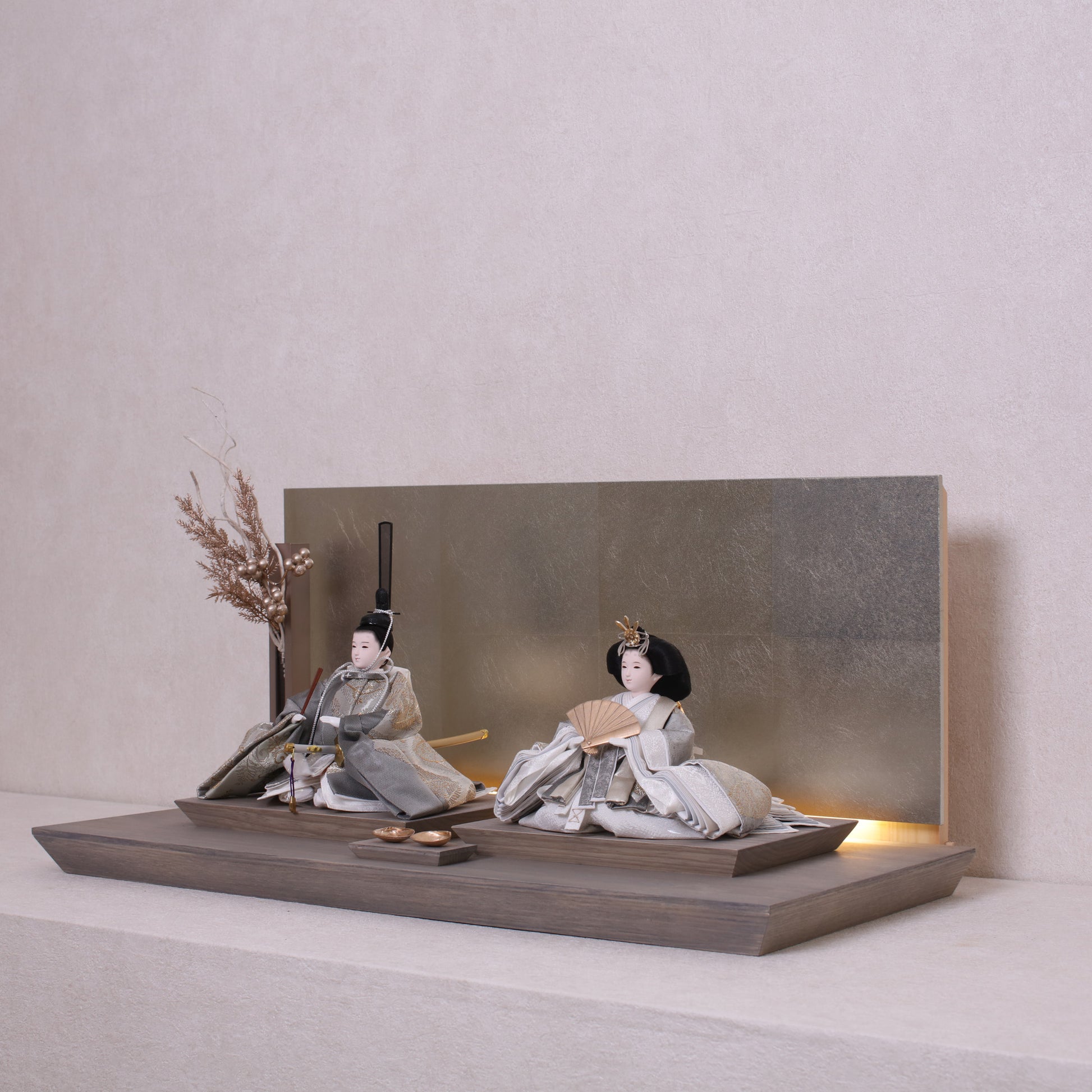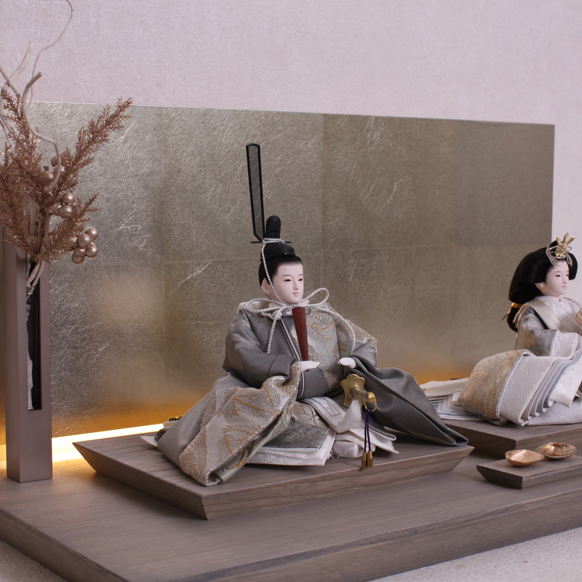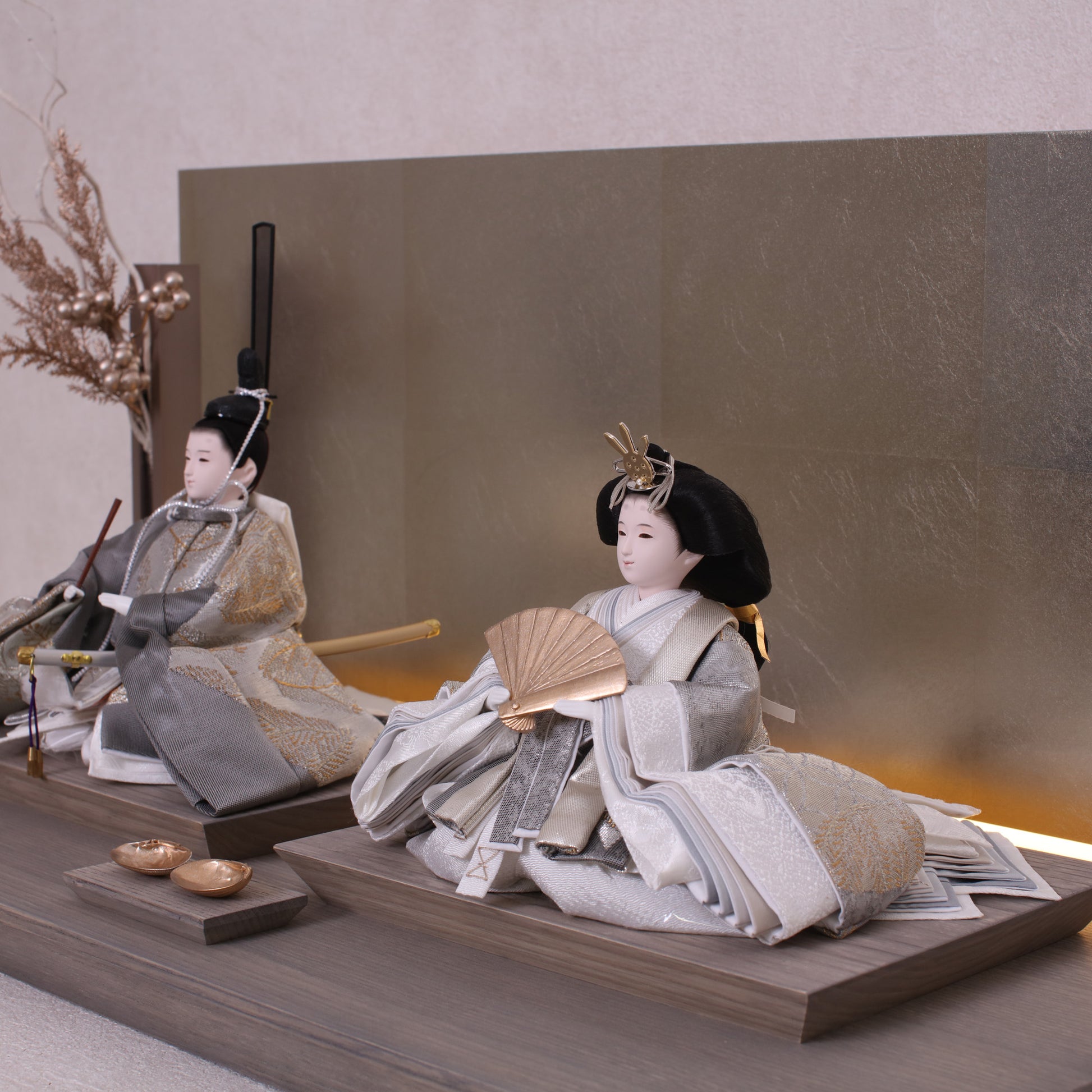 箔押しのお屏風は光を受けて輝き、お雛様の姿をそっと映し出します。
