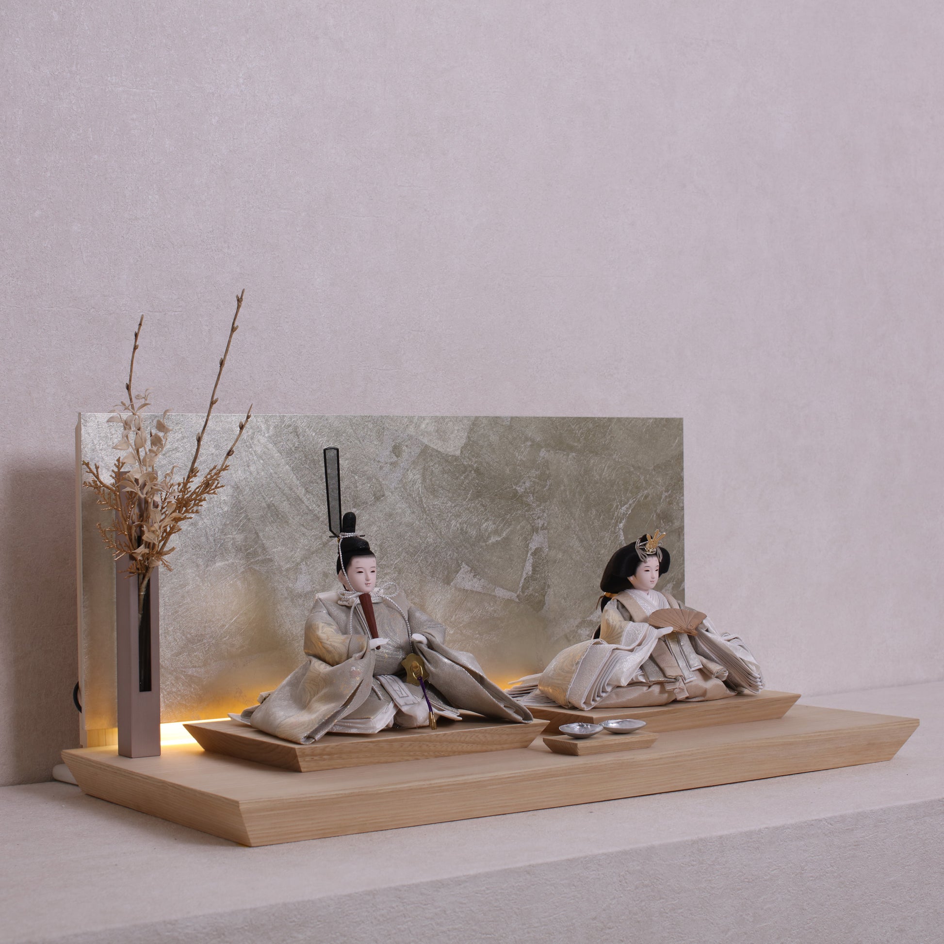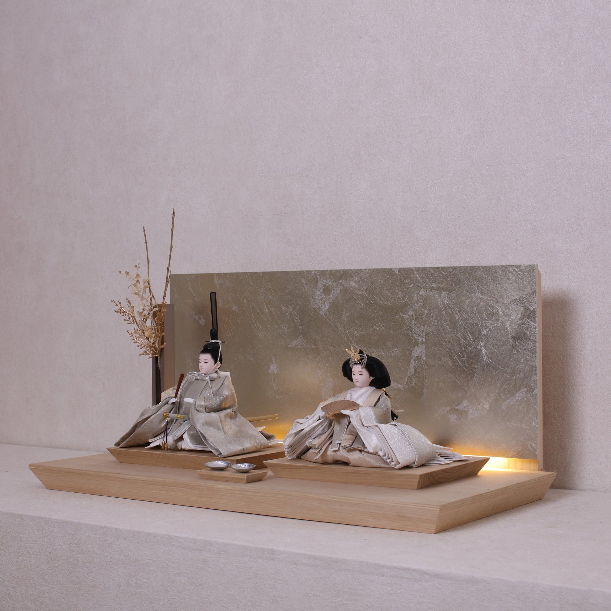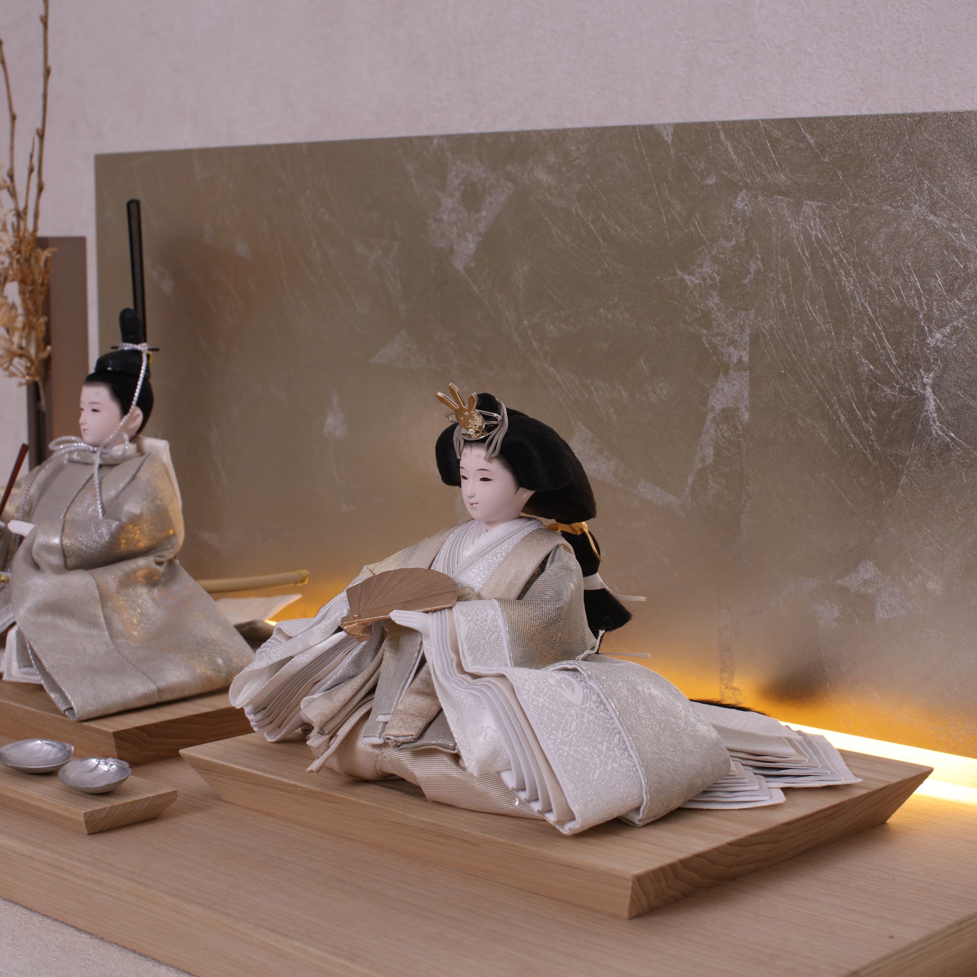お屏風の下からは柔らかなライトがともり、実物と映る姿が重なって飾り全体がいっそう華やかで、美しい世界が生まれます。