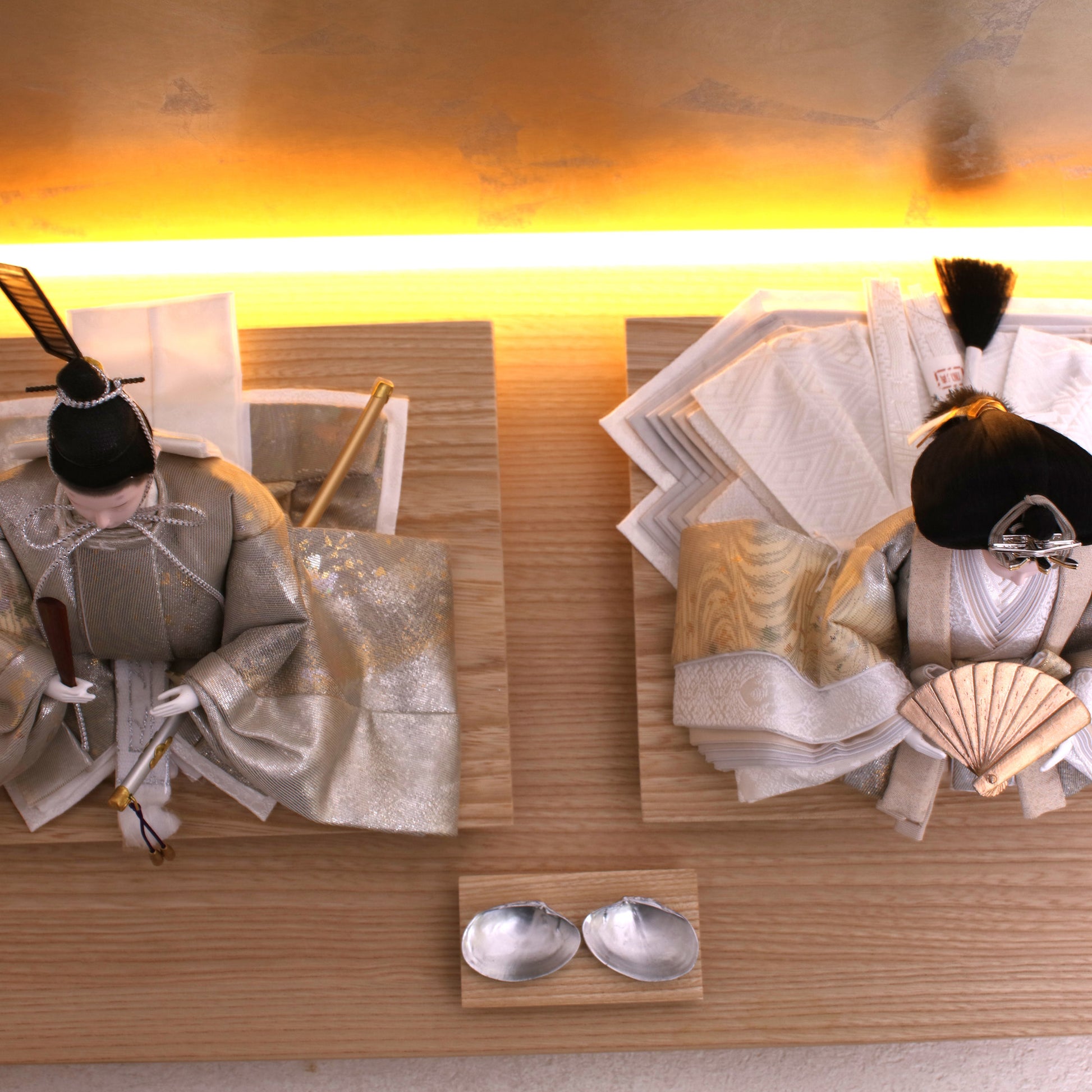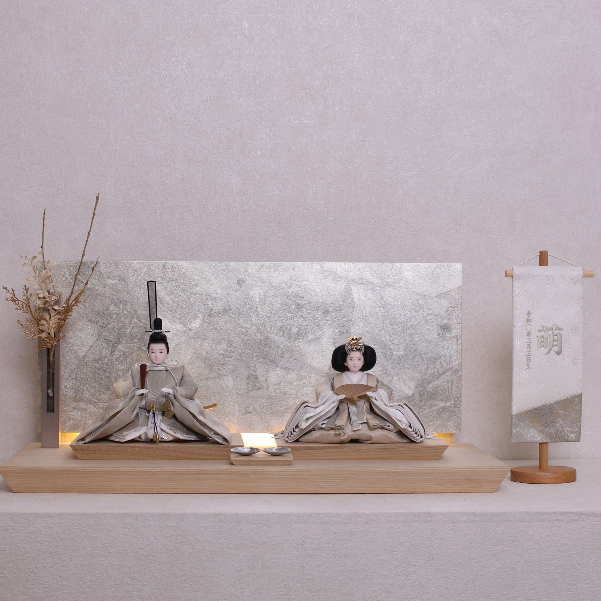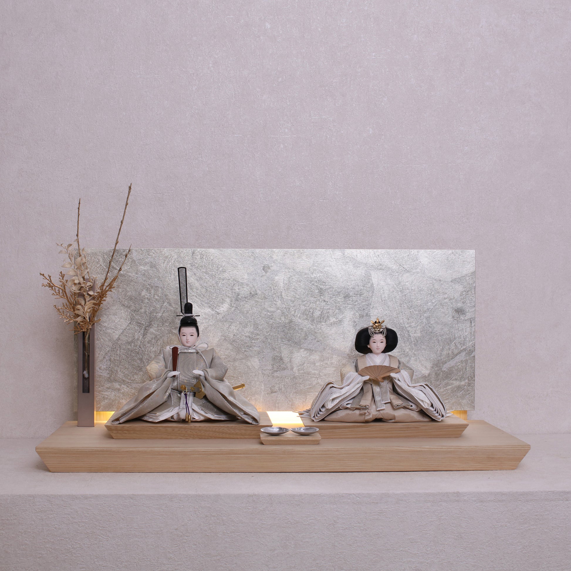 お屏風の下からは柔らかなライトがともり、実物と映る姿が重なって飾り全体がいっそう華やかで、美しい世界が生まれます。