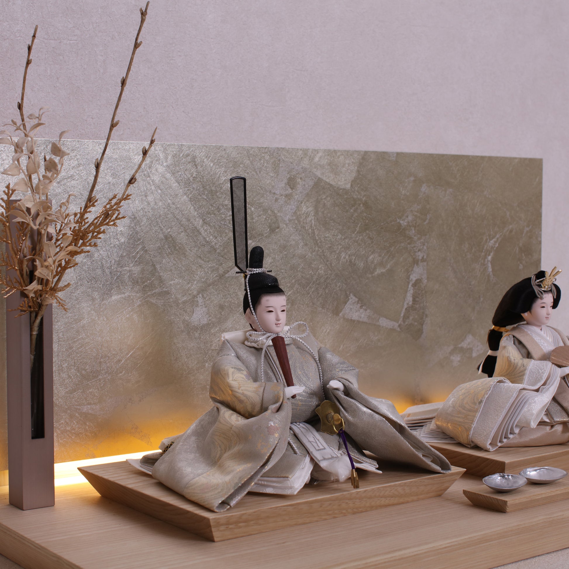 箔押しのお屏風は光を受けて輝き、お雛様の姿をそっと映し出します。