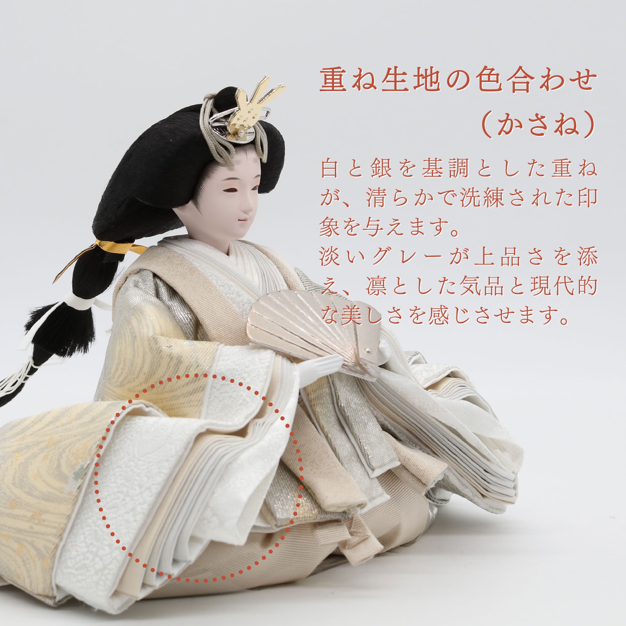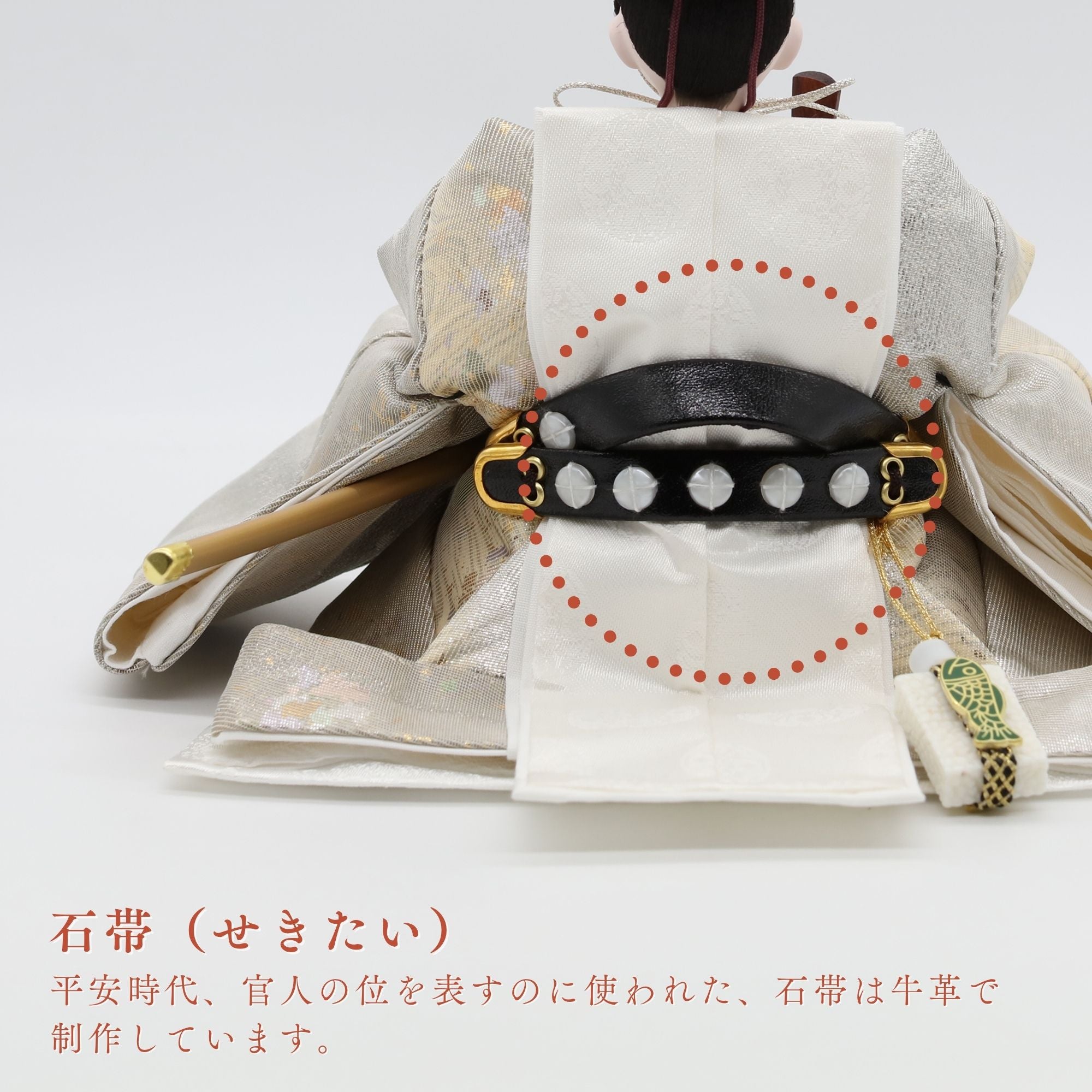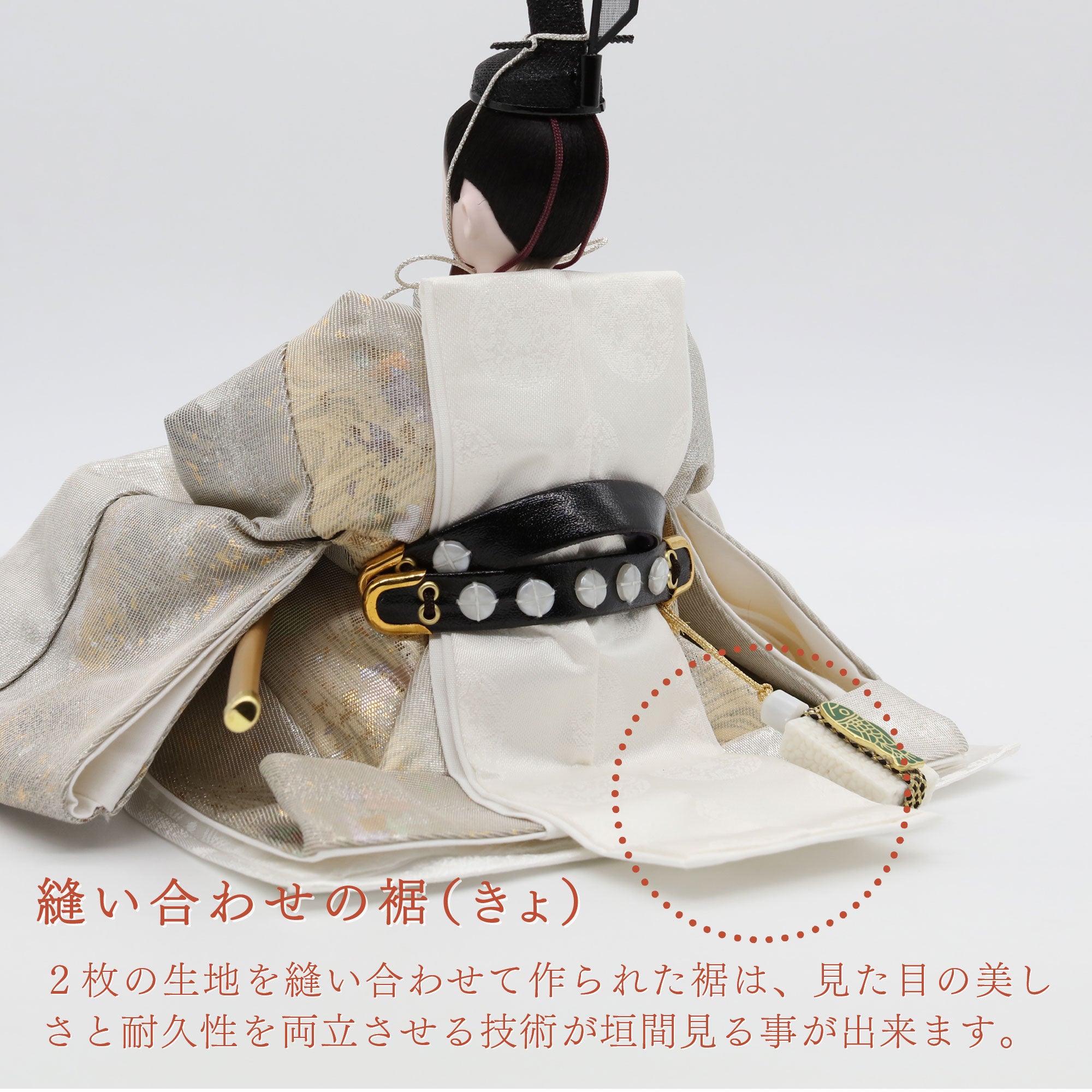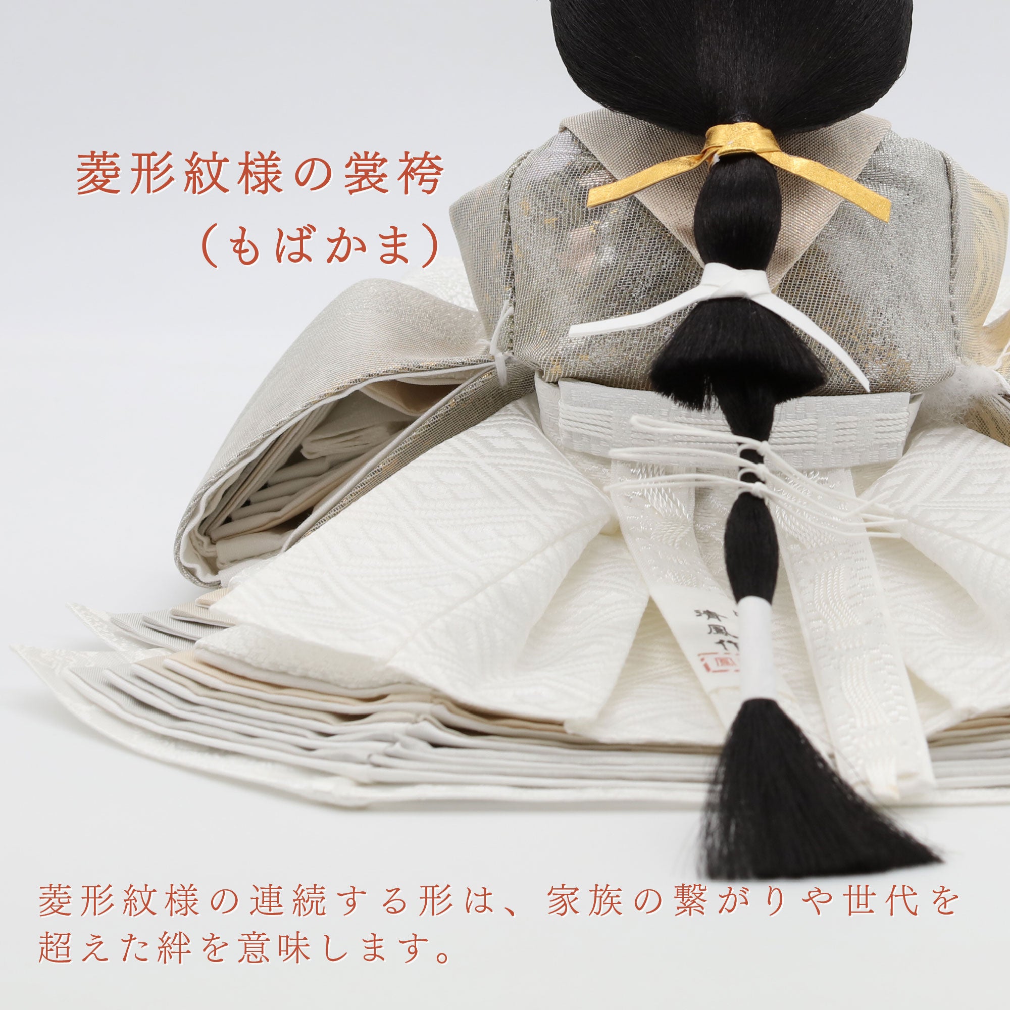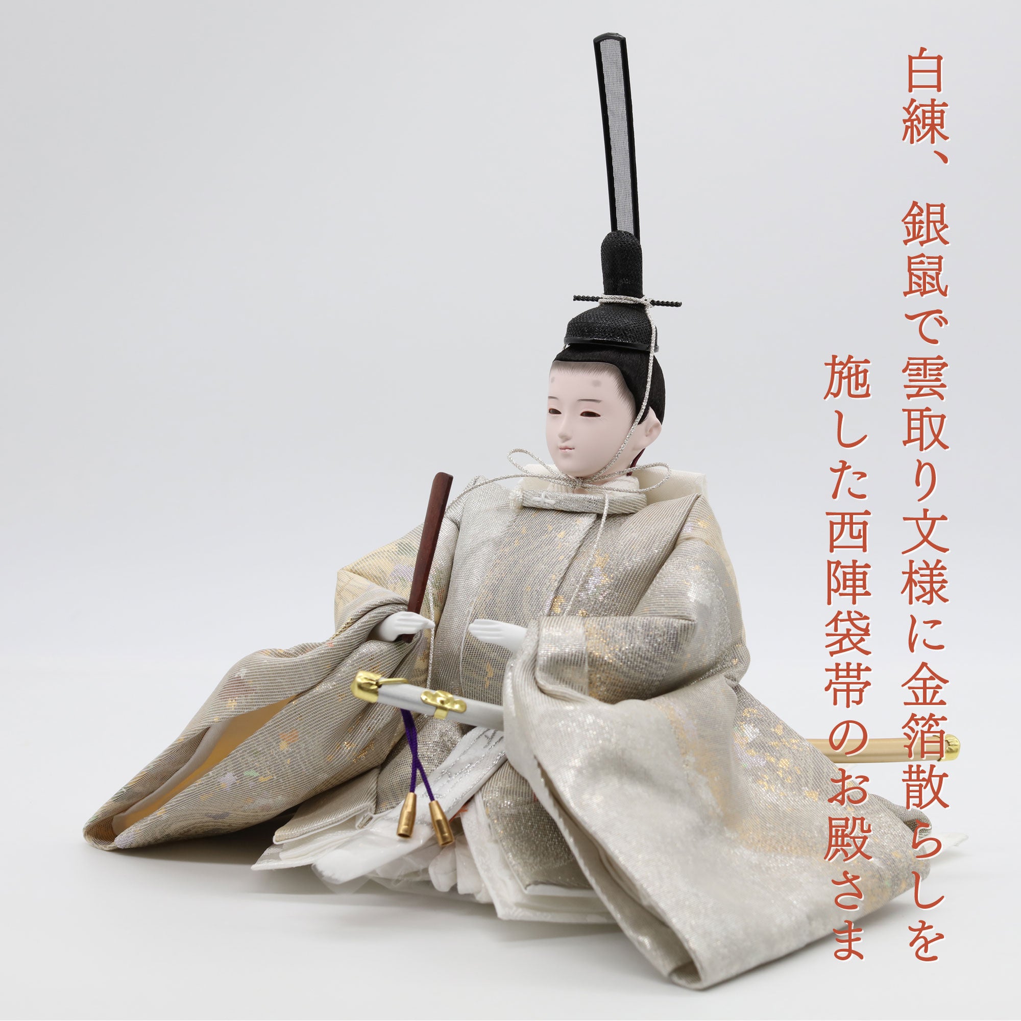 白練、銀鼠の雲取り文様に金箔散らしを施した西陣袋帯の殿。光を受けるたびに華やかに輝き、赤ちゃんの健康と家庭の繁栄を象徴します。