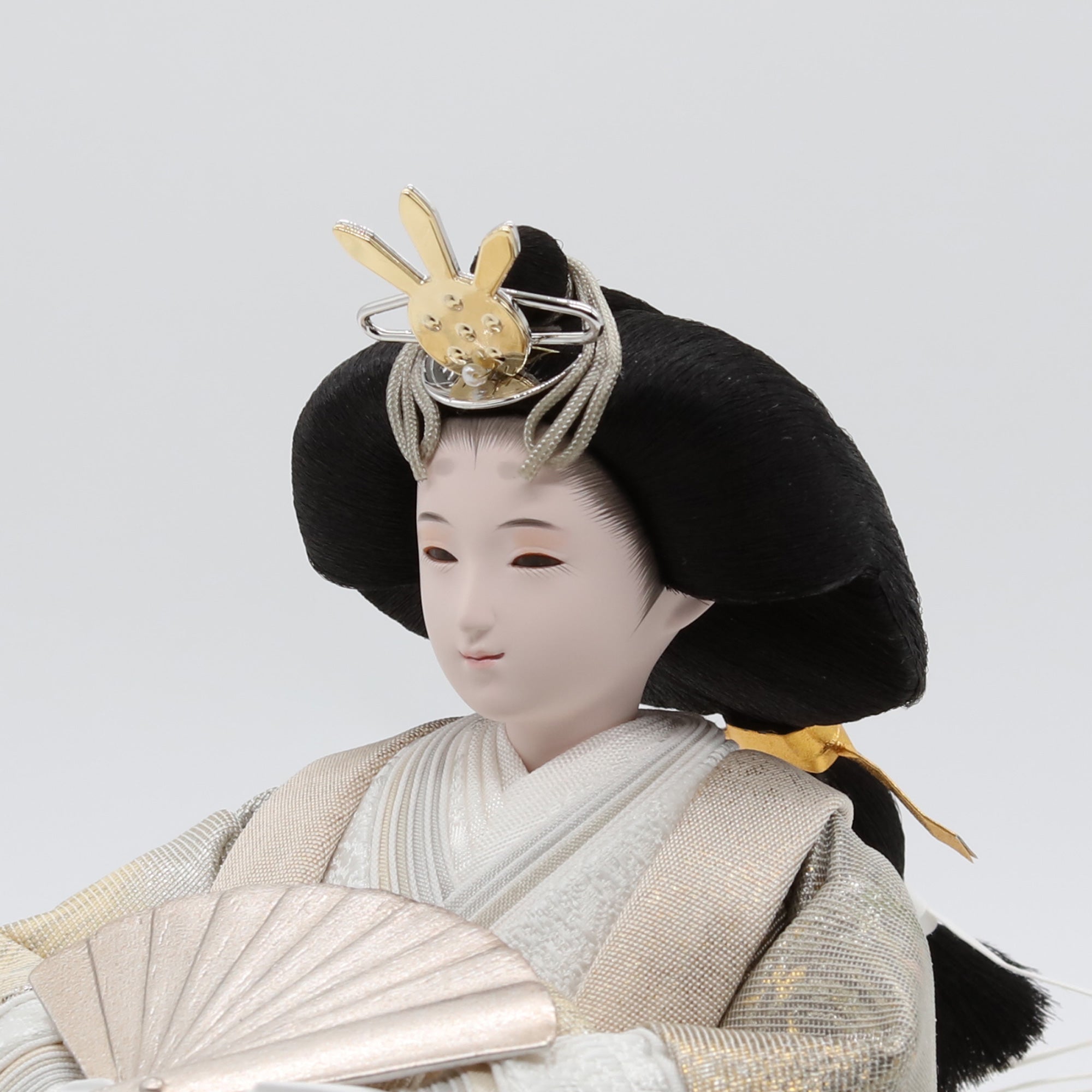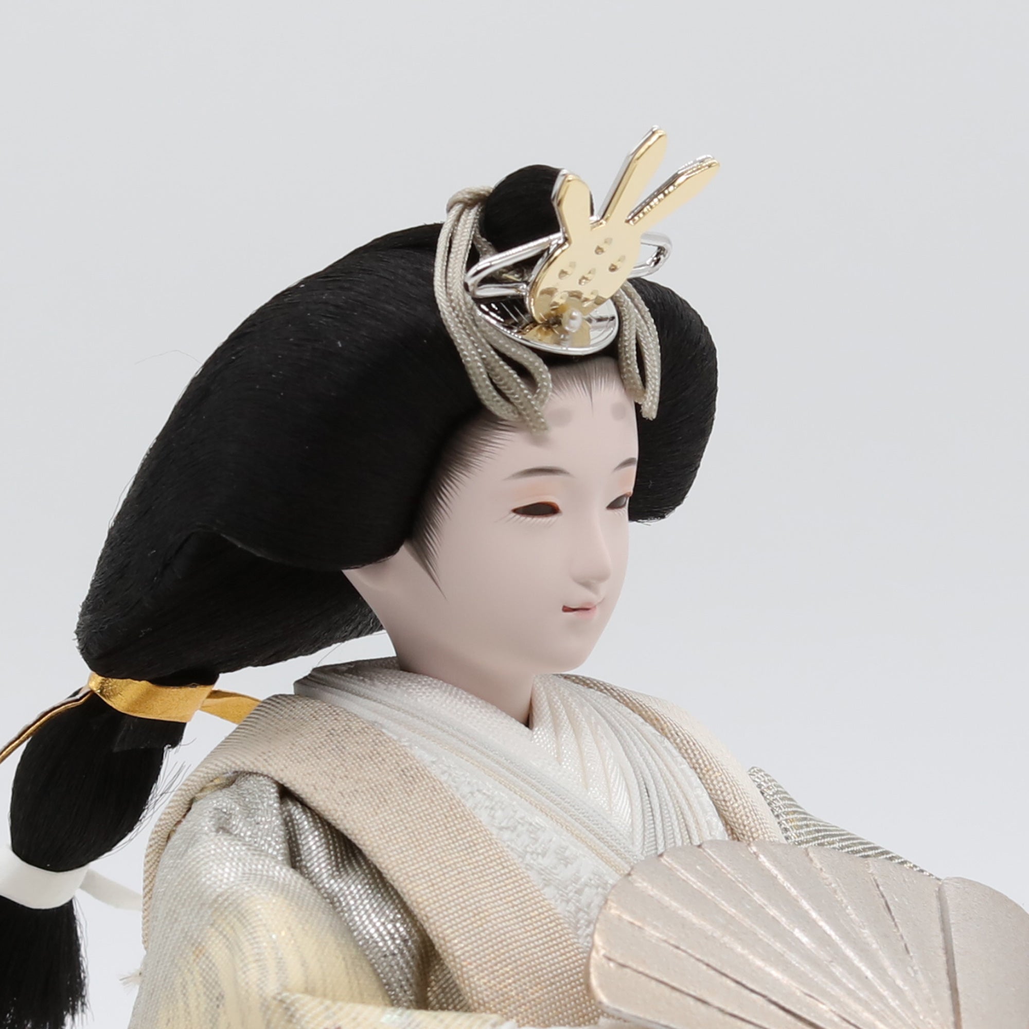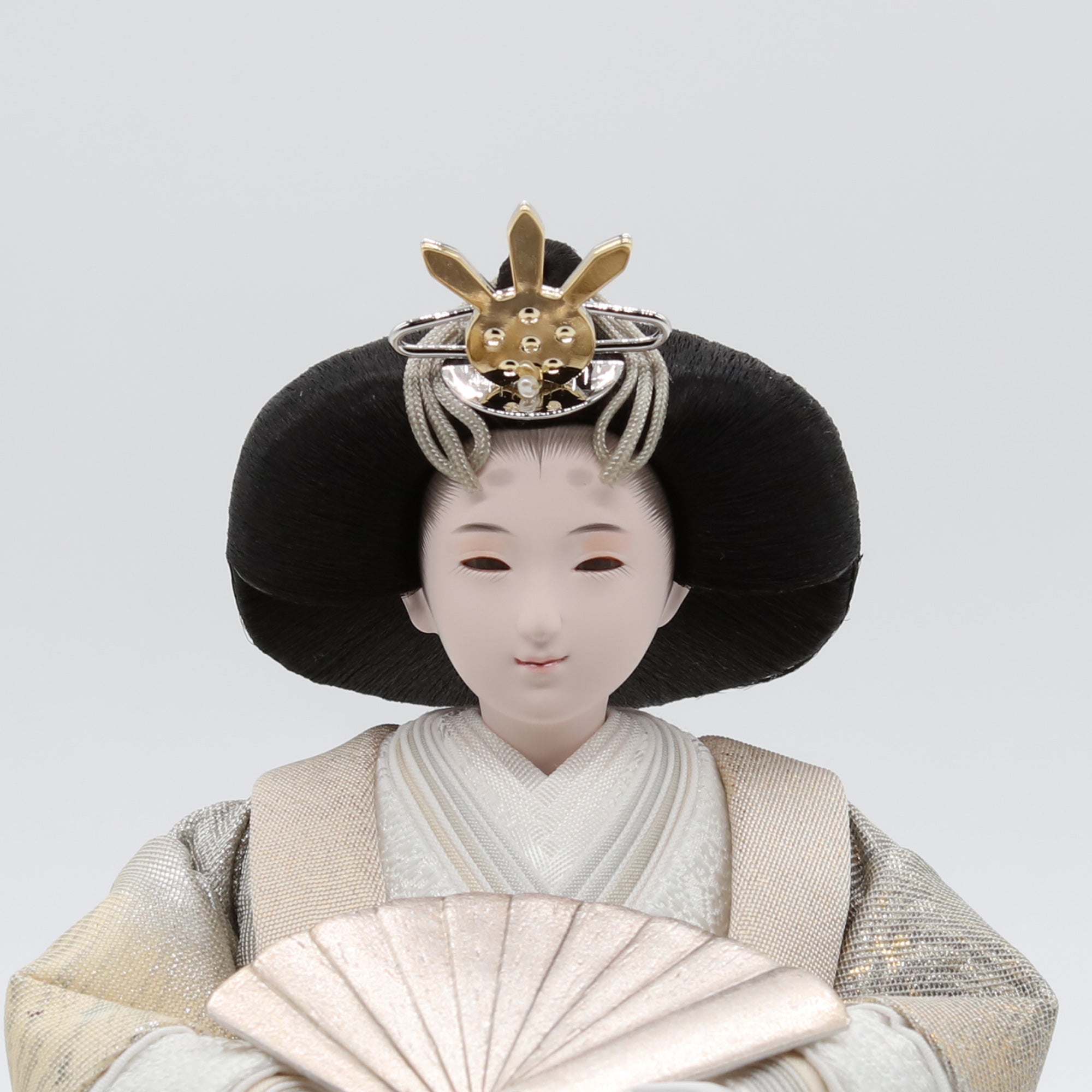 熊倉基安の作品「sumire」は、パールのような上品な輝きと、優雅さを演出しています。洗練された表情と品格ある佇まいが、空間全体を格調高く彩ります。「お人形は顔がいのち」と言われるように、熊倉基安の技術と感性が一体となった逸品で、伝統を大切にしながらも新しい美しさを追求するその姿勢が、ひときわの魅力を放っています。