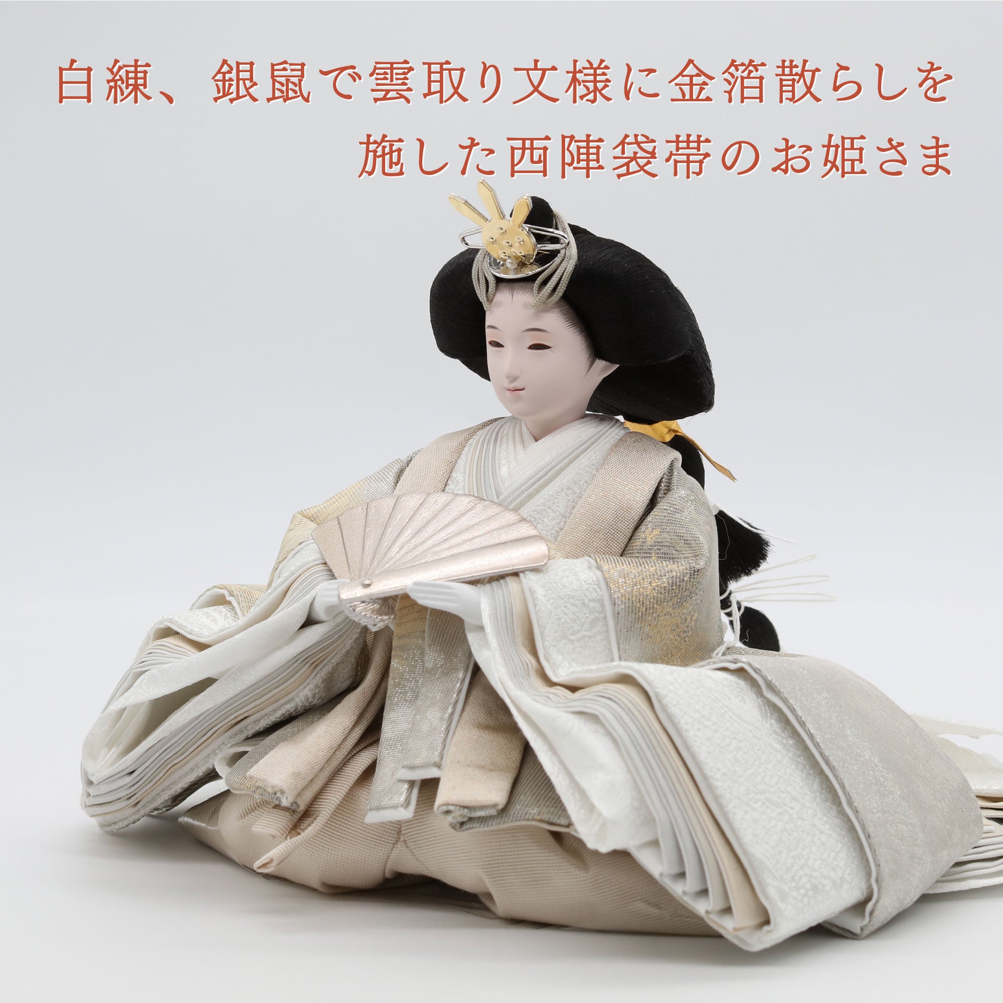 白練、銀鼠で雲取り文様に金箔散らしを施した西陣袋帯のお姫さま