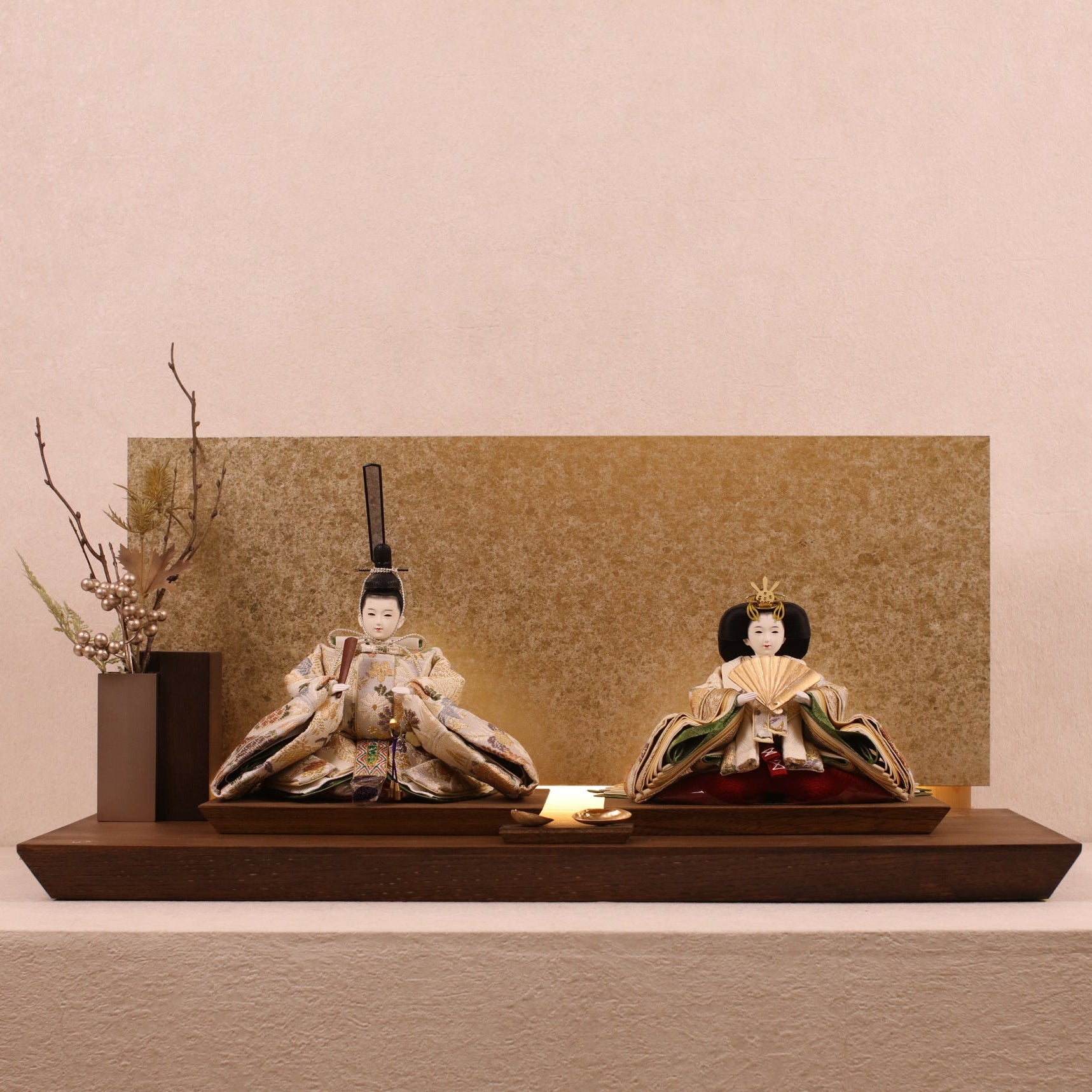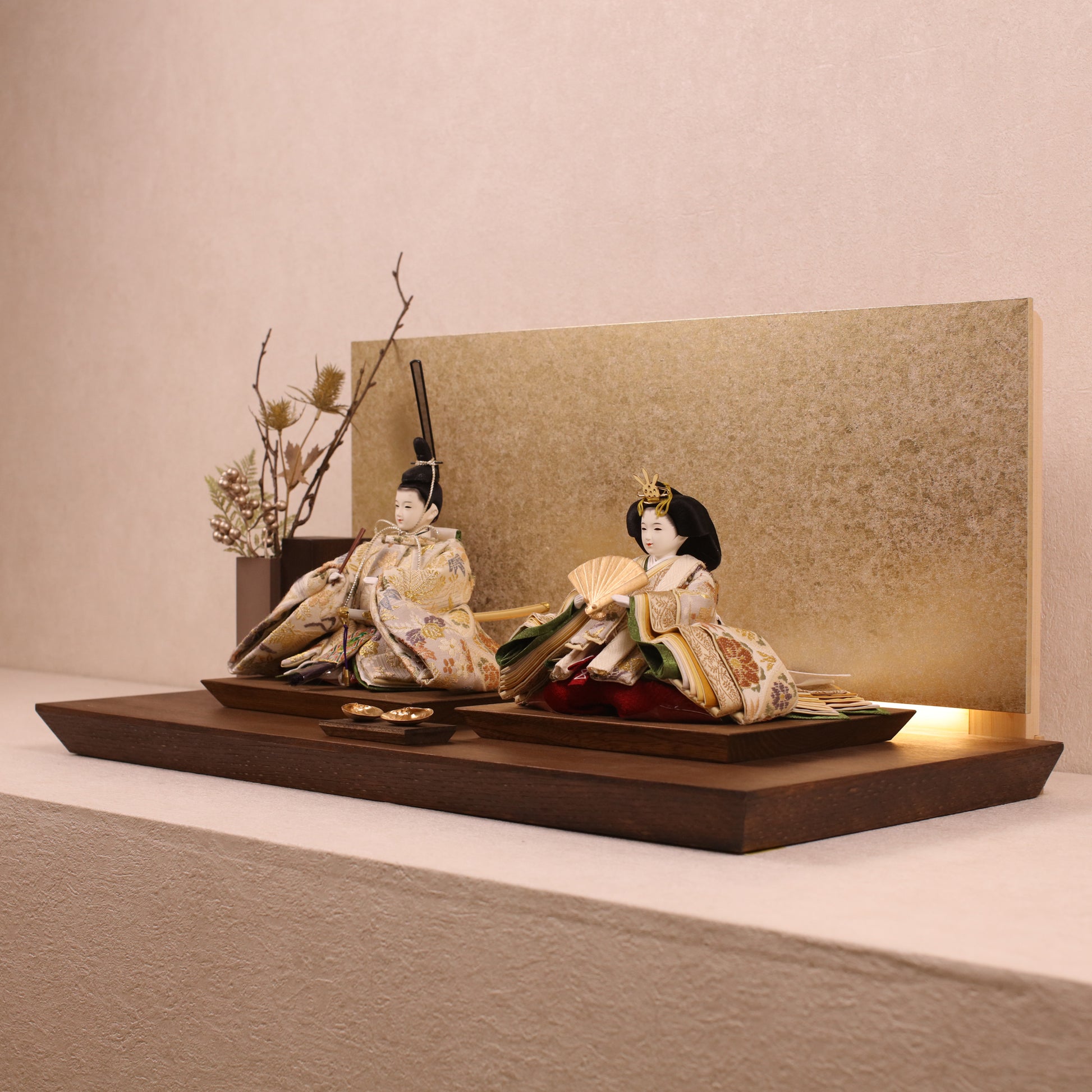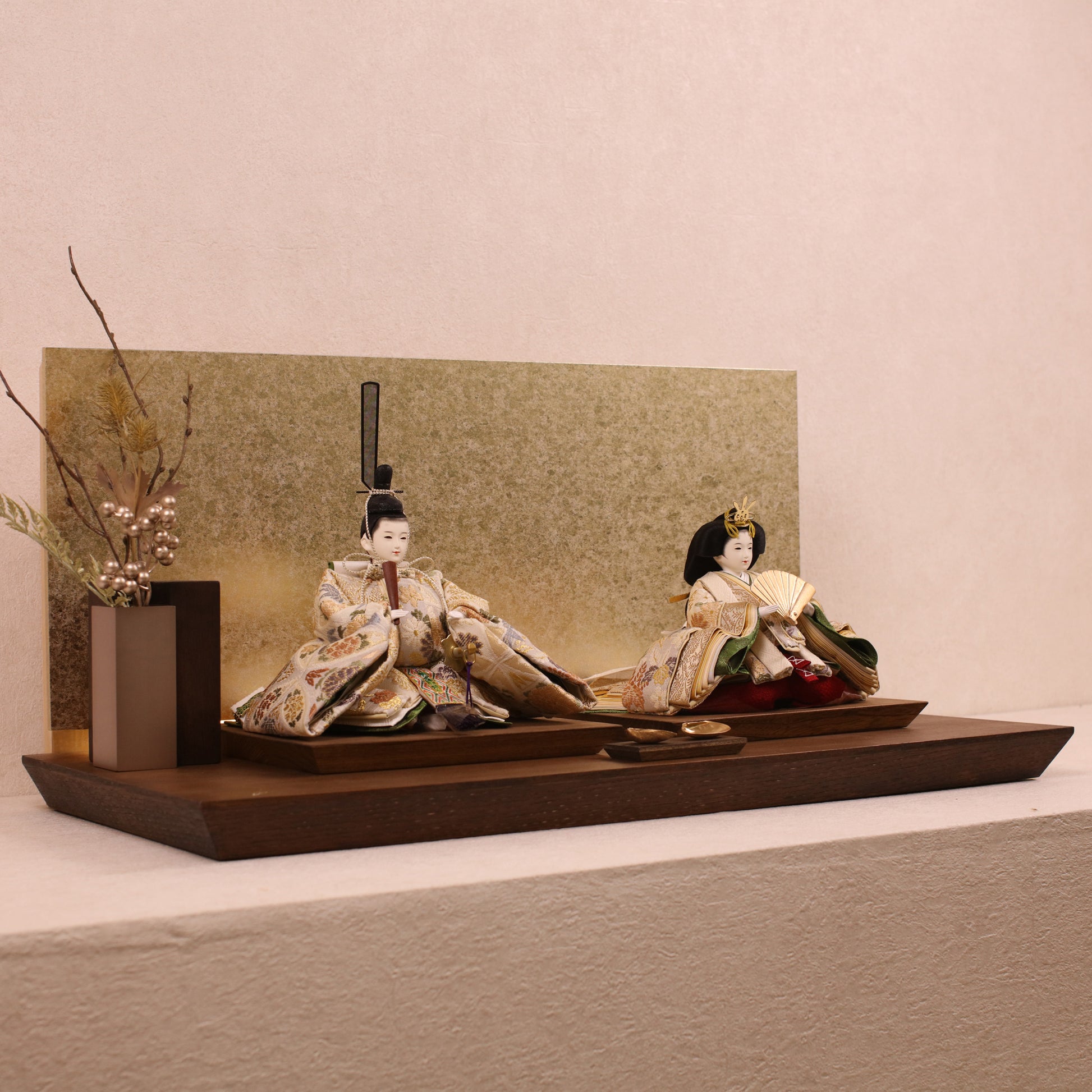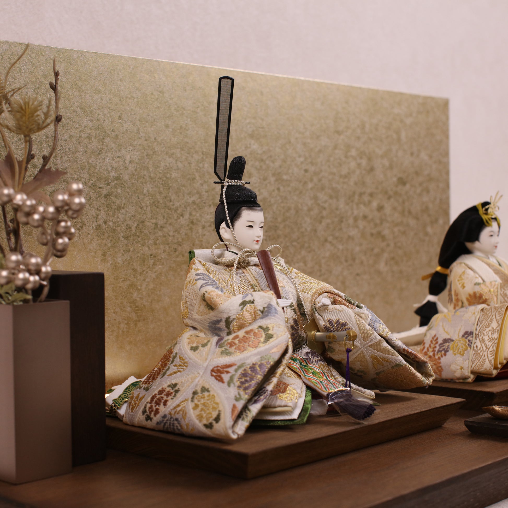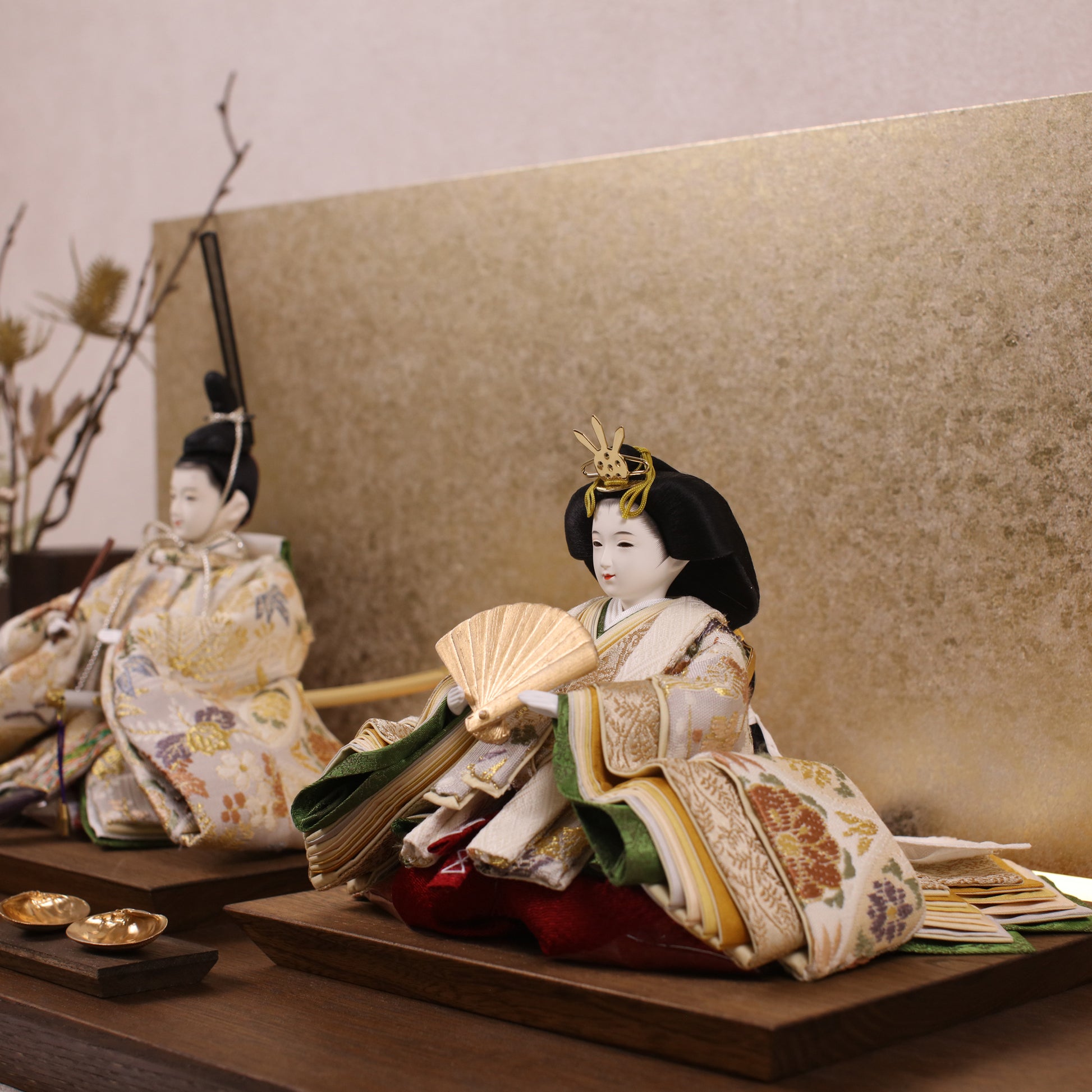箔押しのお屏風は光を受けて輝き、お雛様の姿をそっと映し出します。