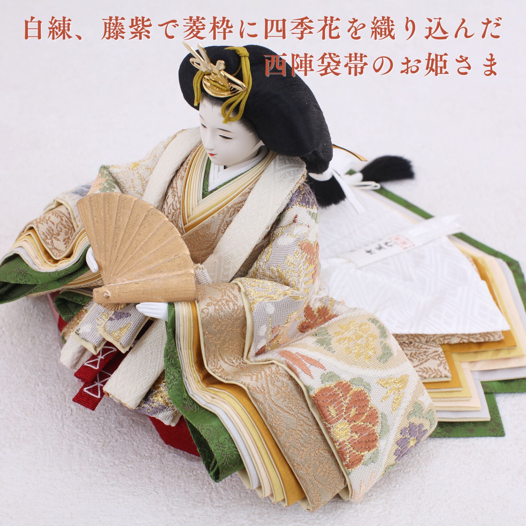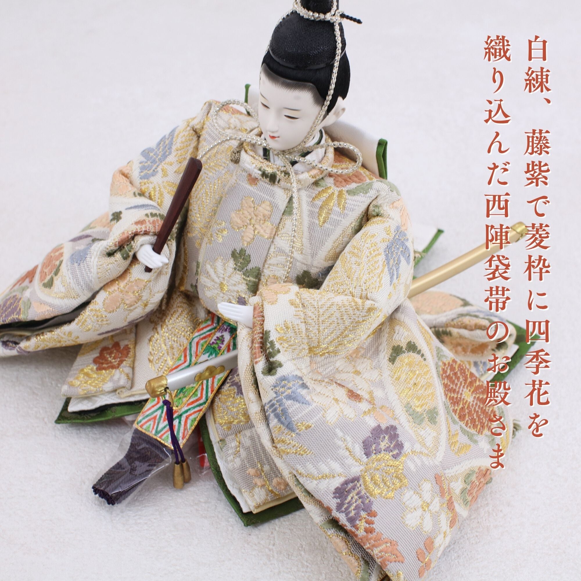 白練、藤紫で菱枠に四季花を織り込んだ西陣袋帯のお姫さま
