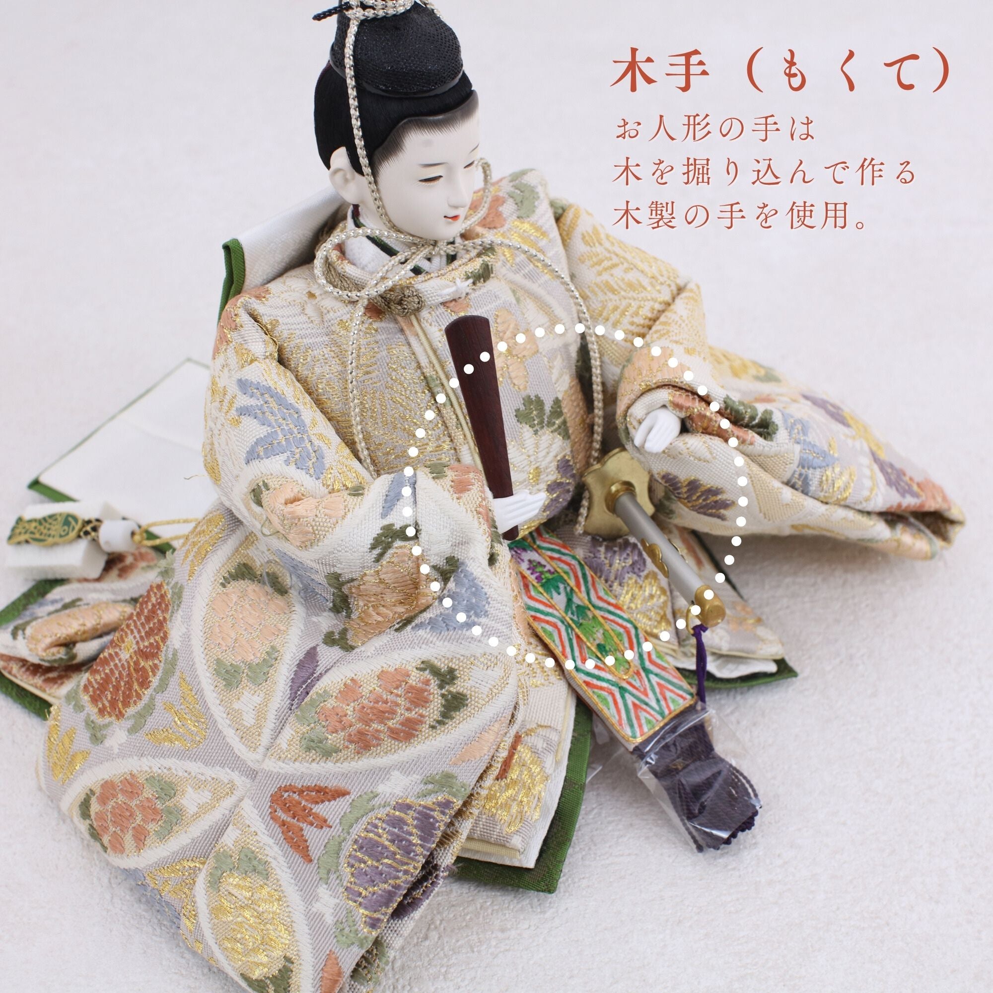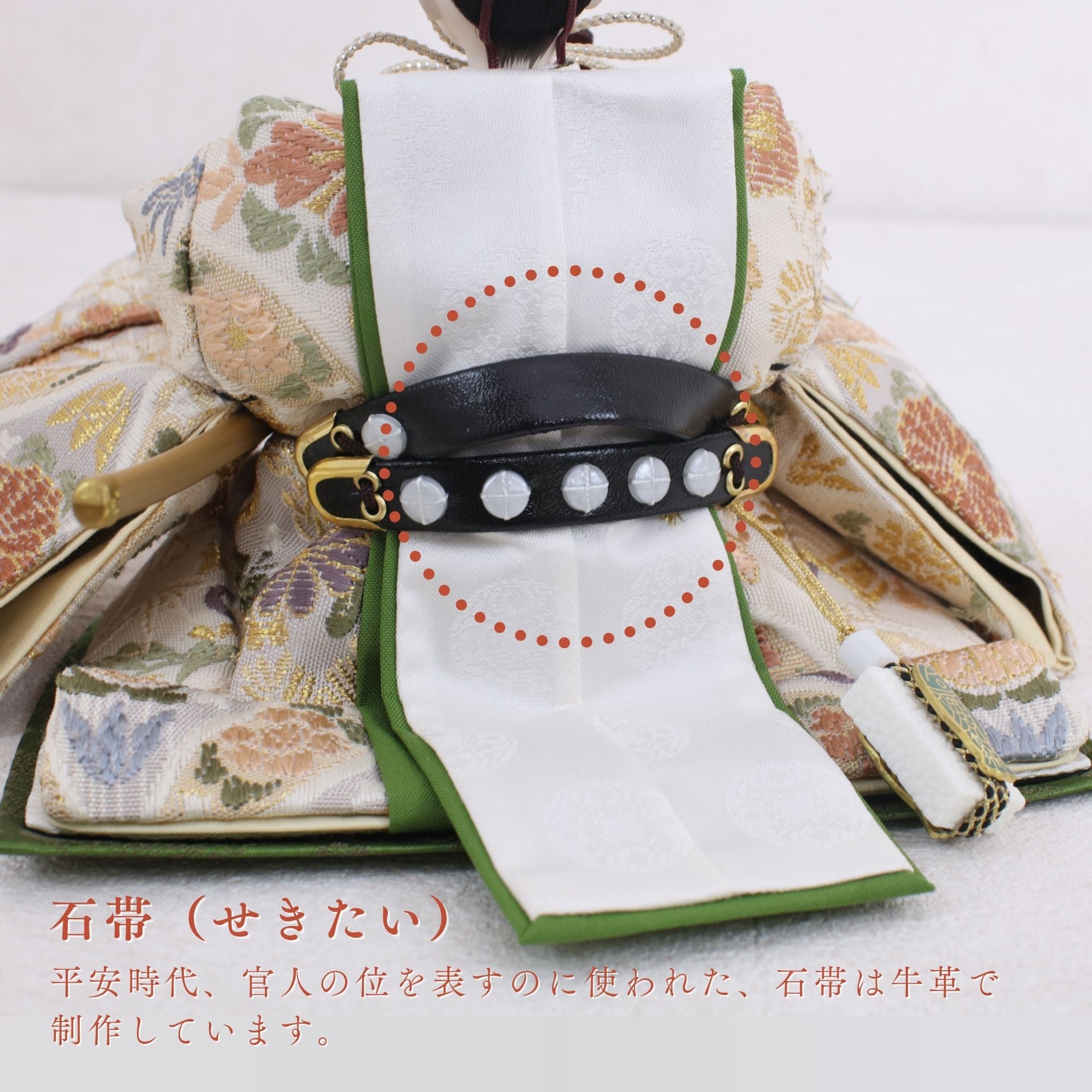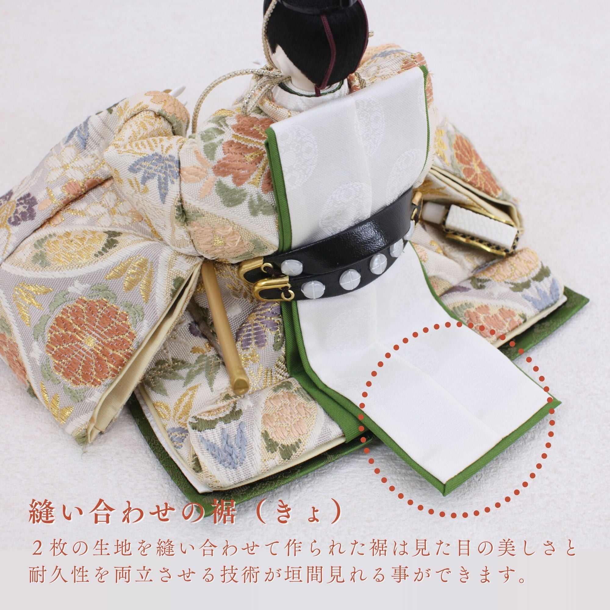 国産の分(せん)は、美しい木目と温もりある質感が魅力の天然木です。耐久性に優れ、経年とともに味わいを醸し出します。台座や屏風などに使用することで、自然素材ならではの落ち着いた風合いと上質感を演出し、雛人形全体をより品格ある印象に仕上げます。