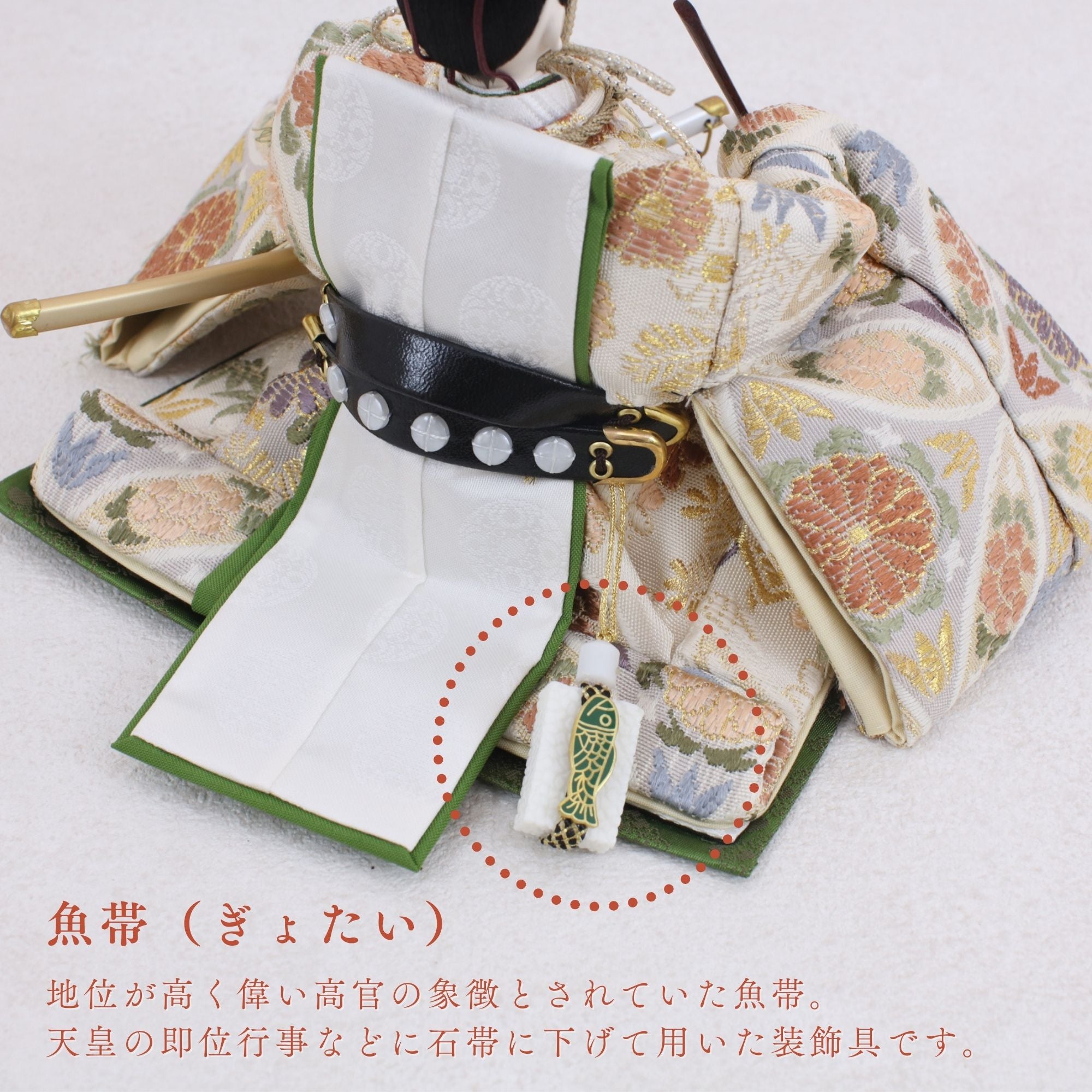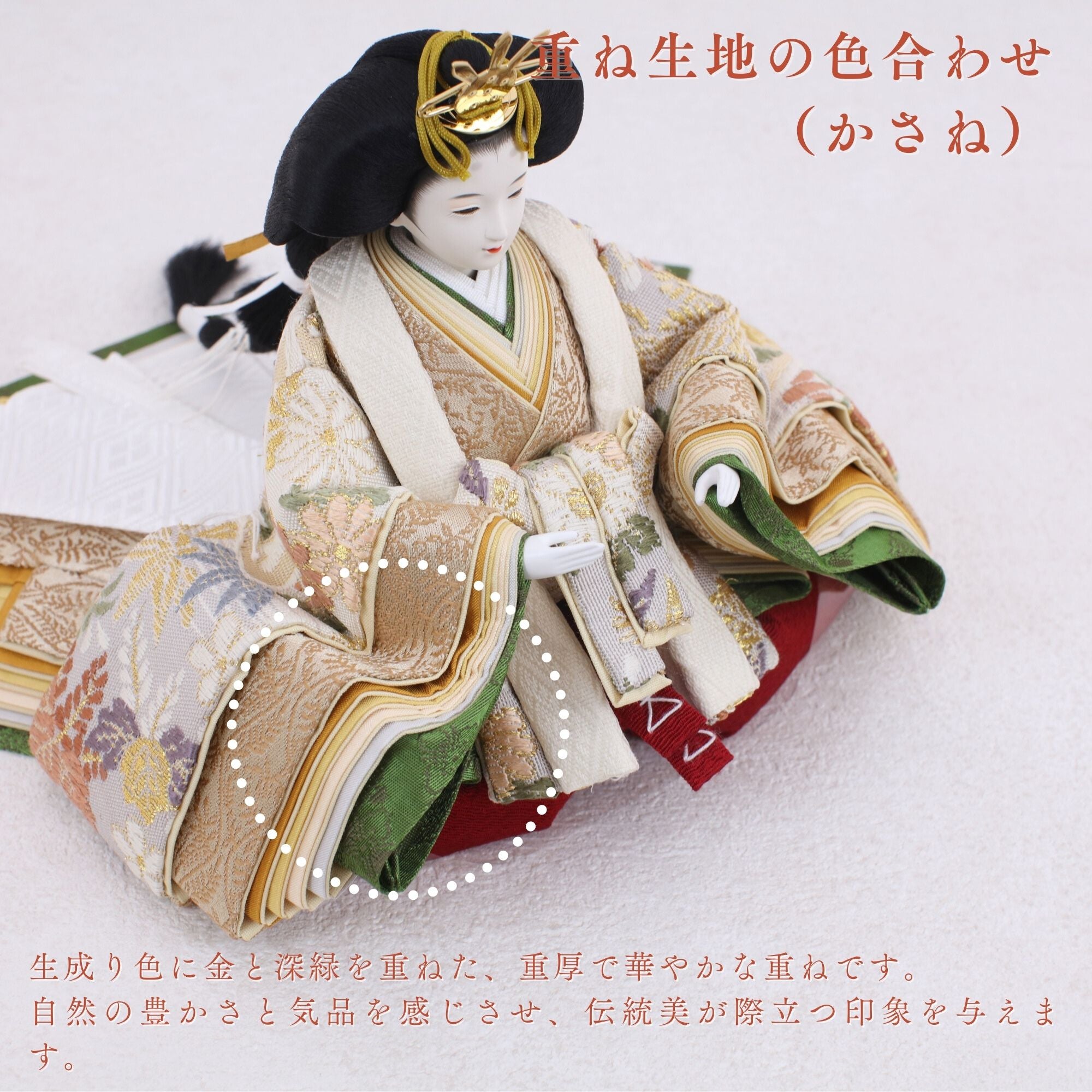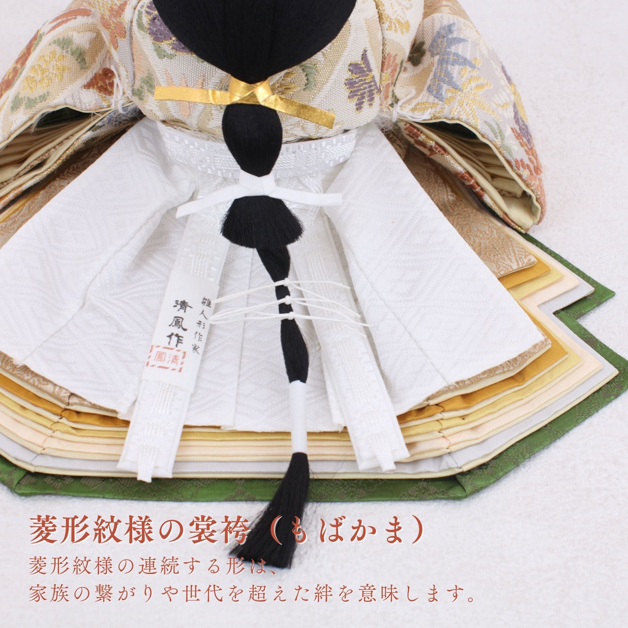国産の分(せん)は、美しい木目と温もりある質感が魅力の天然木です。耐久性に優れ、経年とともに味わいを醸し出します。台座や屏風などに使用することで、自然素材ならではの落ち着いた風合いと上質感を演出し、雛人形全体をより品格ある印象に仕上げます。