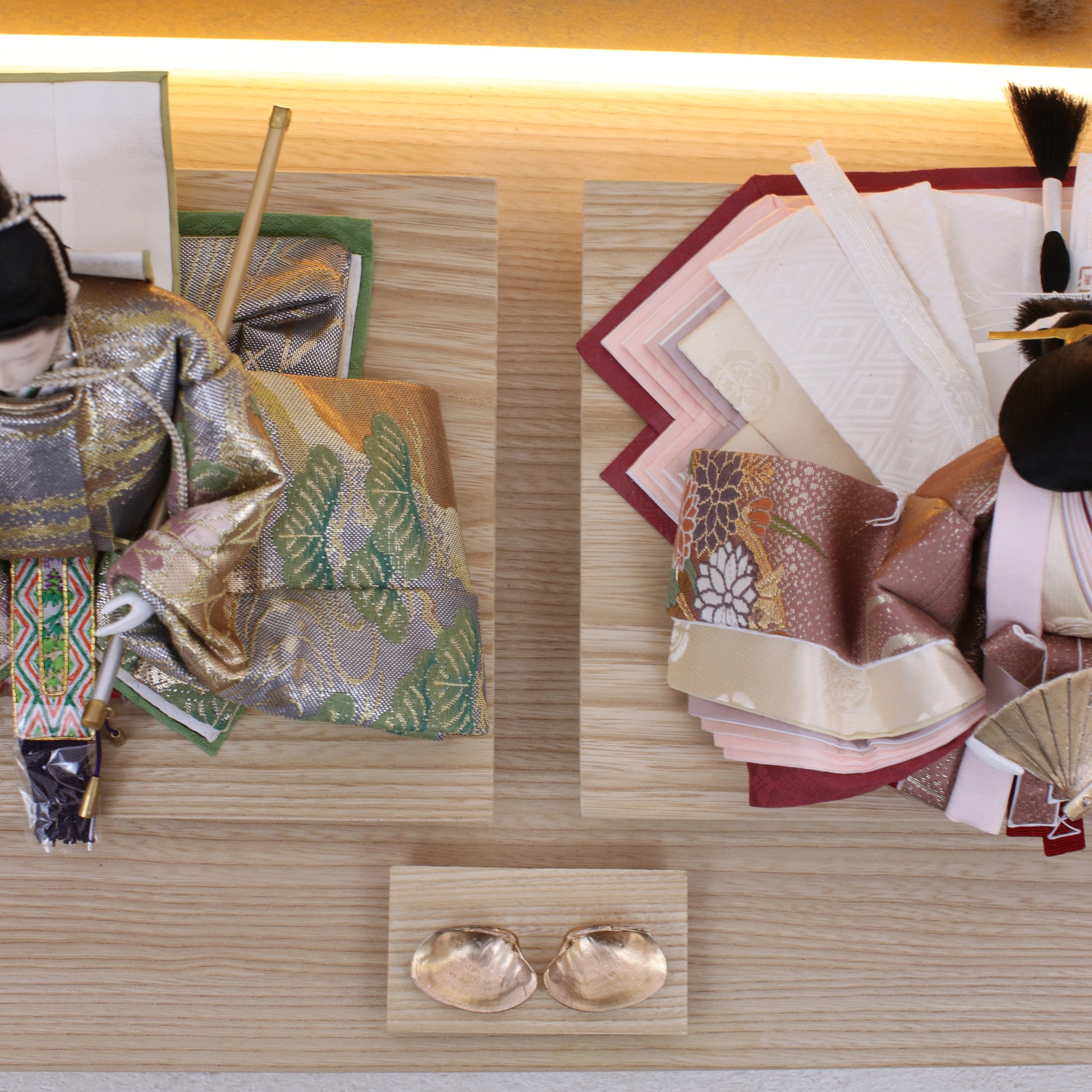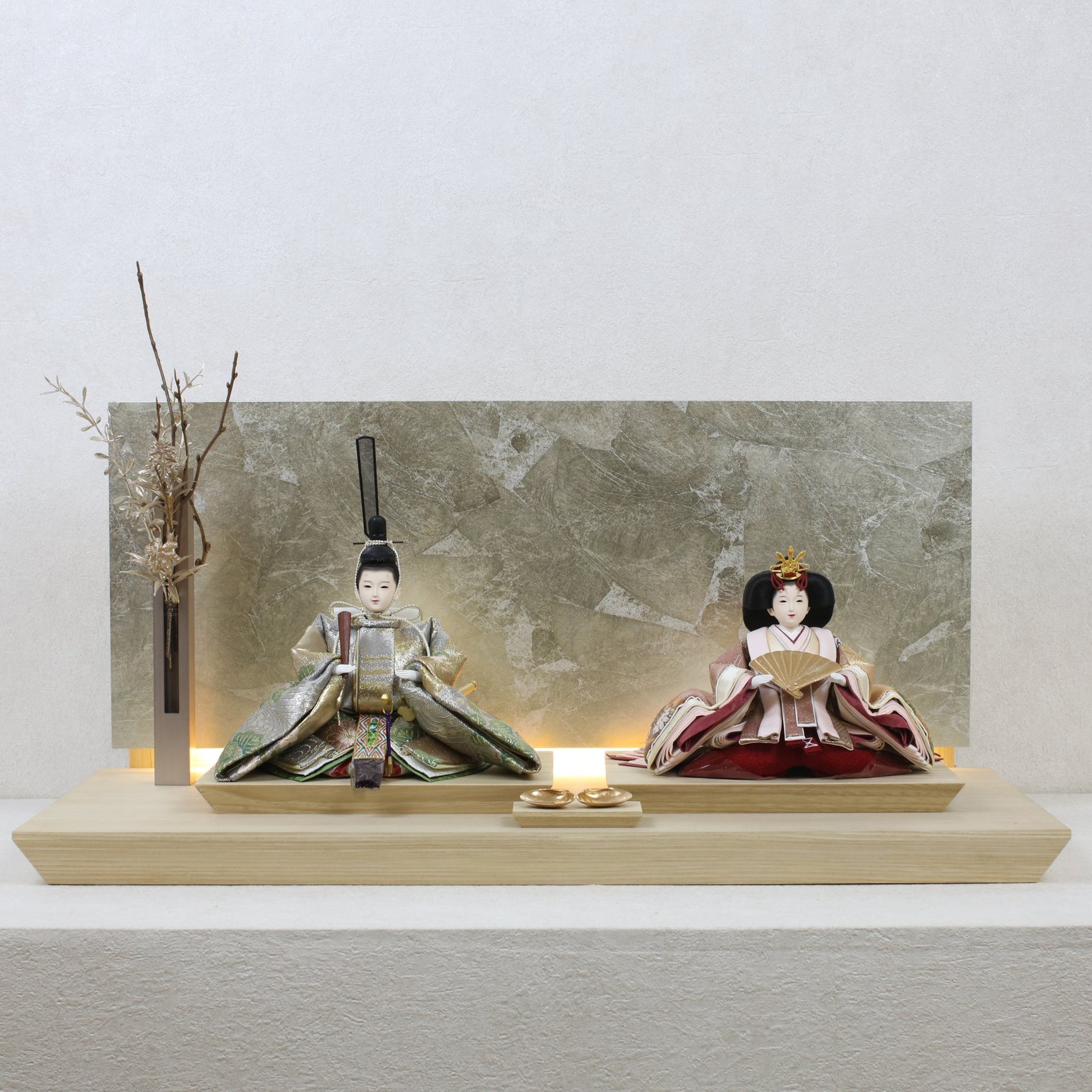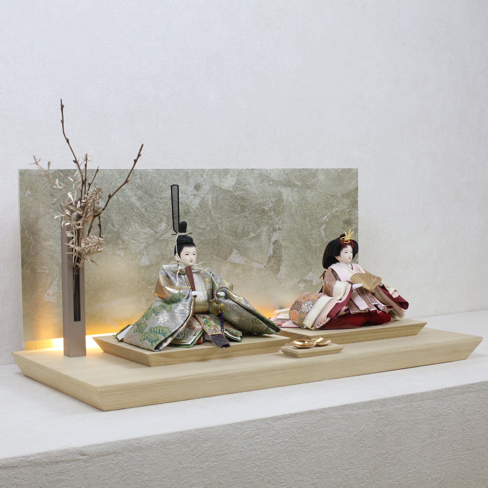 お屏風の下からは柔らかなライトがともり、実物と映る姿が重なって飾り全体がいっそう華やかで、美しい世界が生まれます。