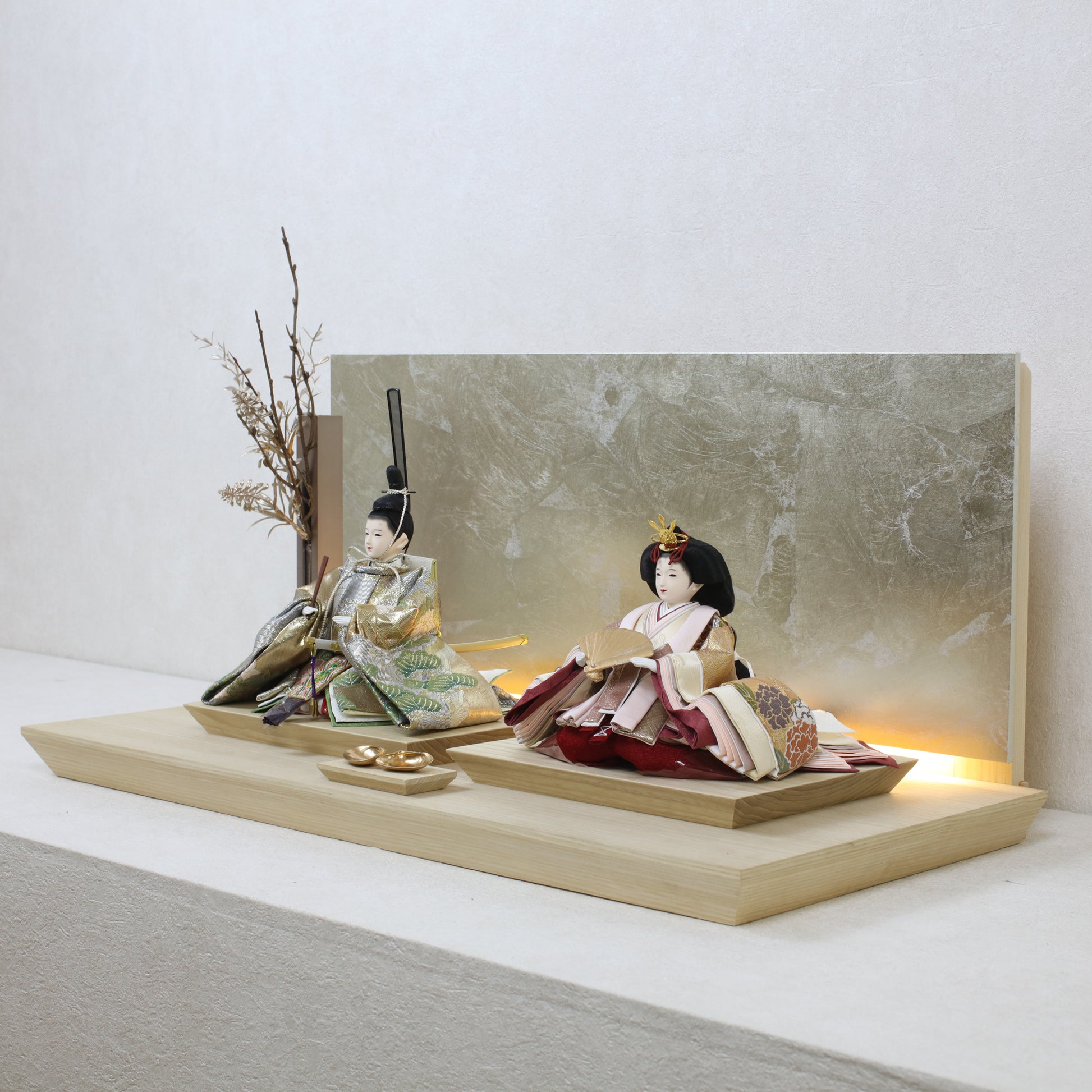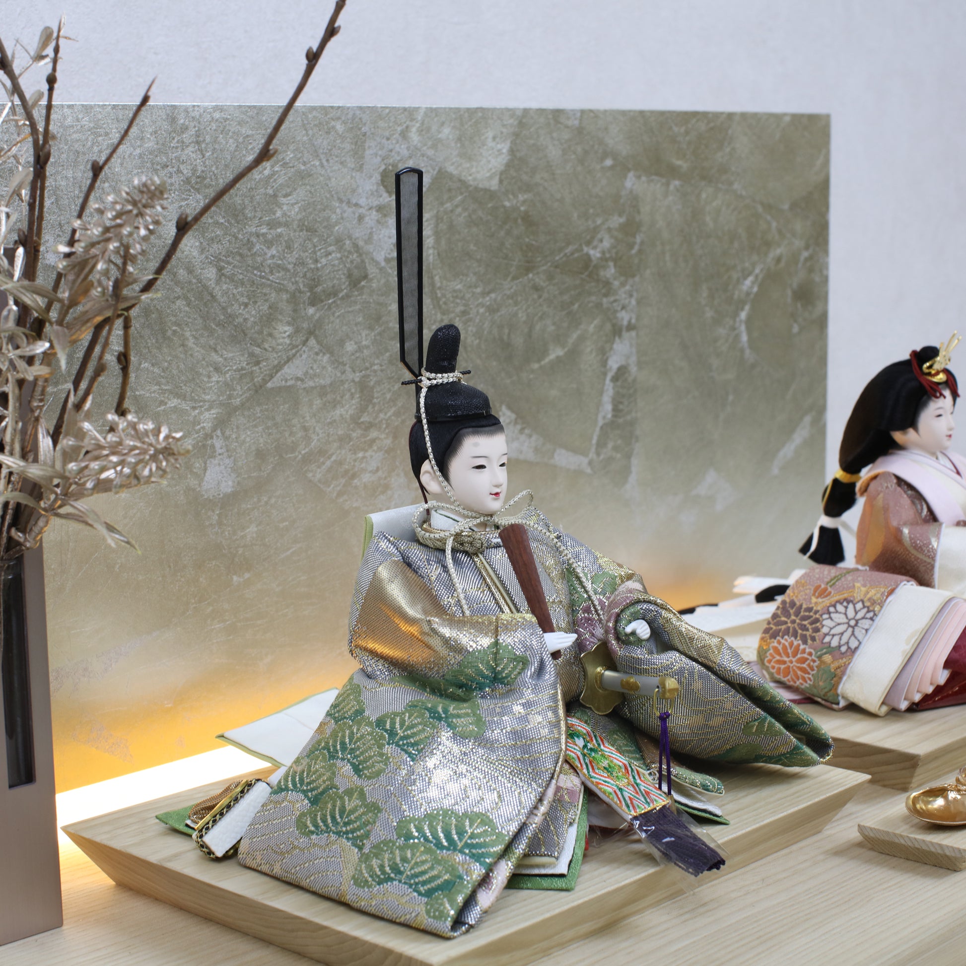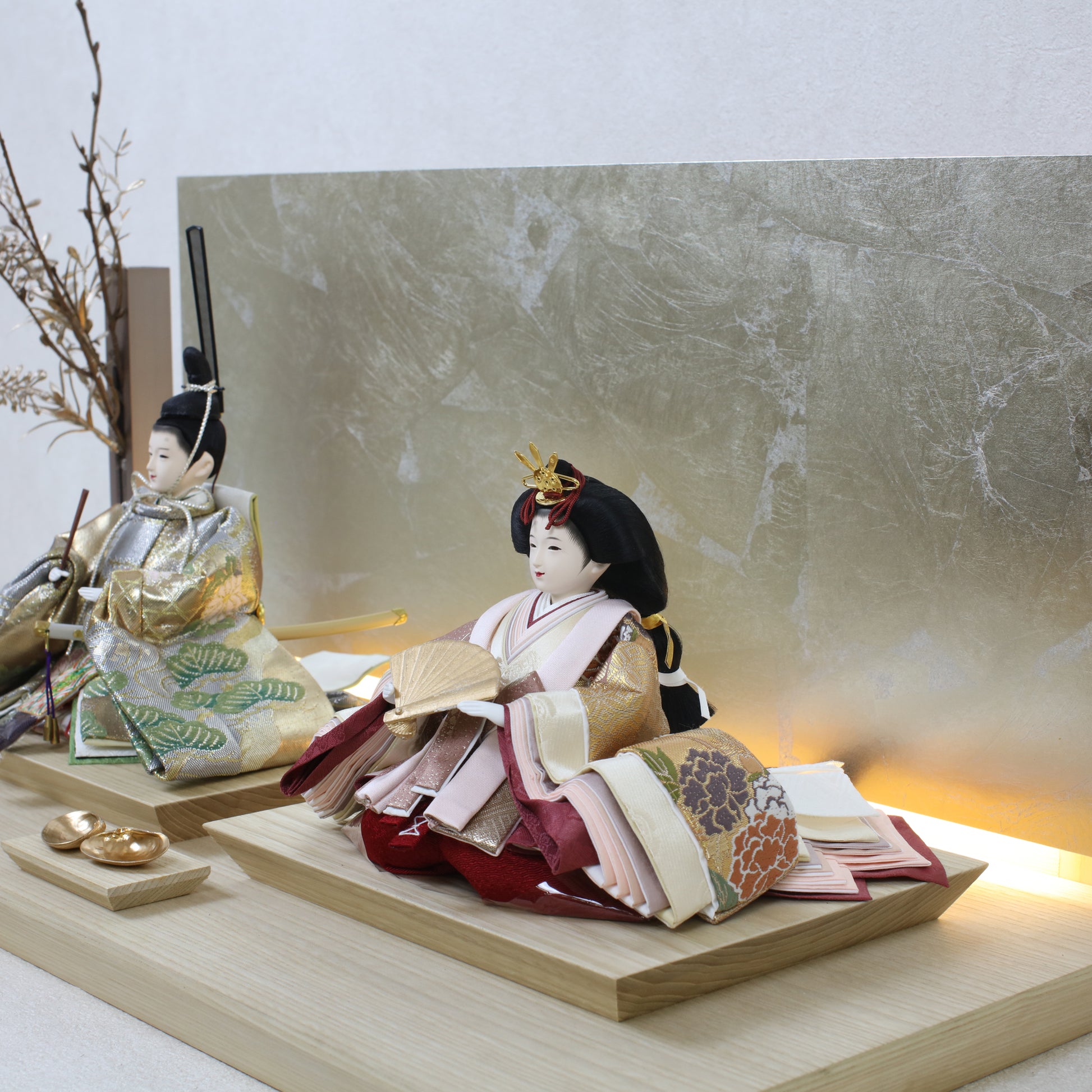 箔押しのお屏風は光を受けて輝き、お雛様の姿をそっと映し出します。