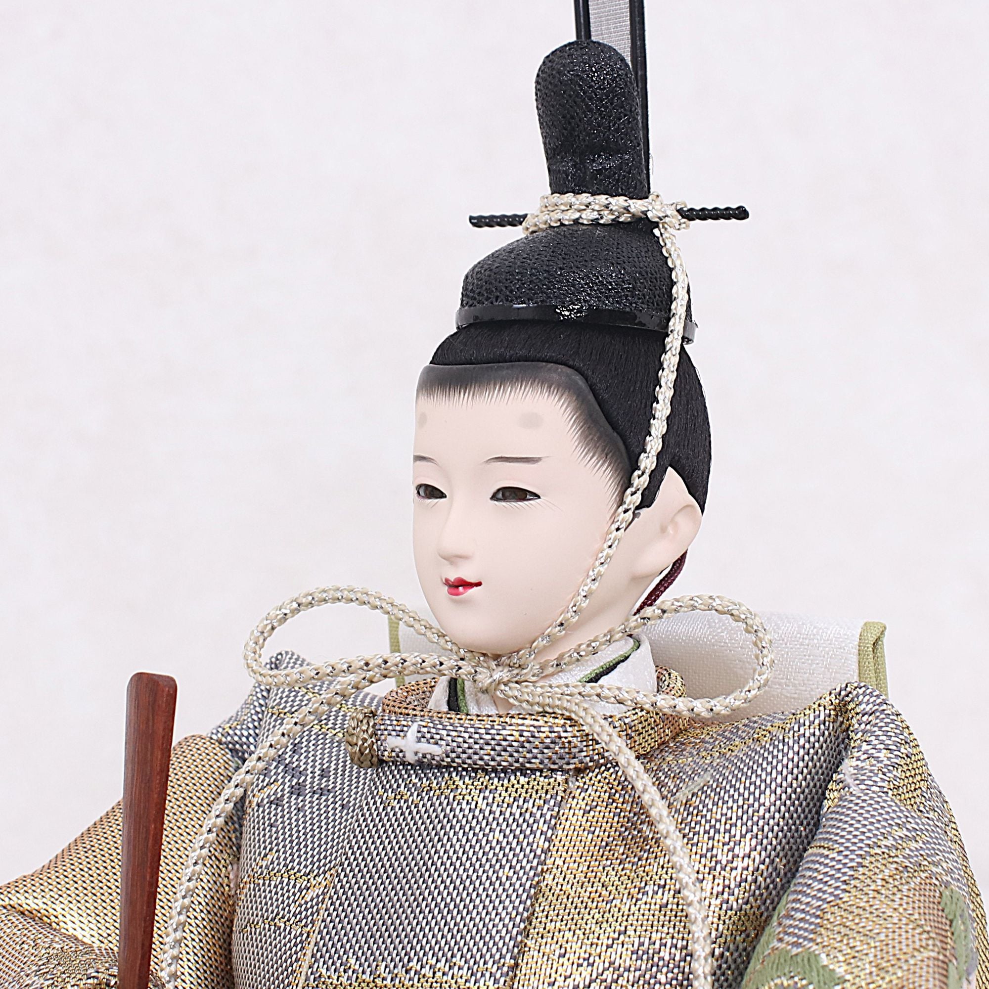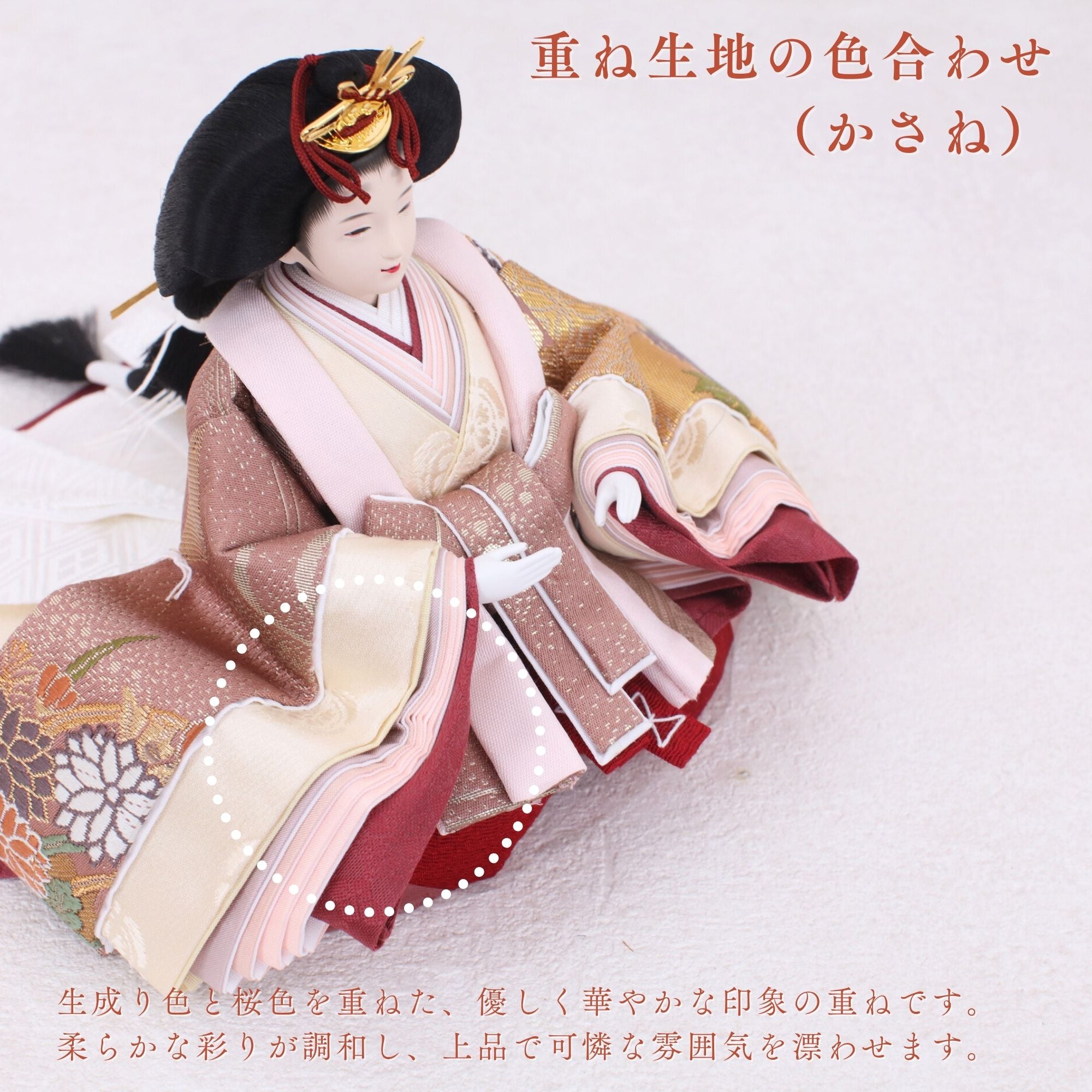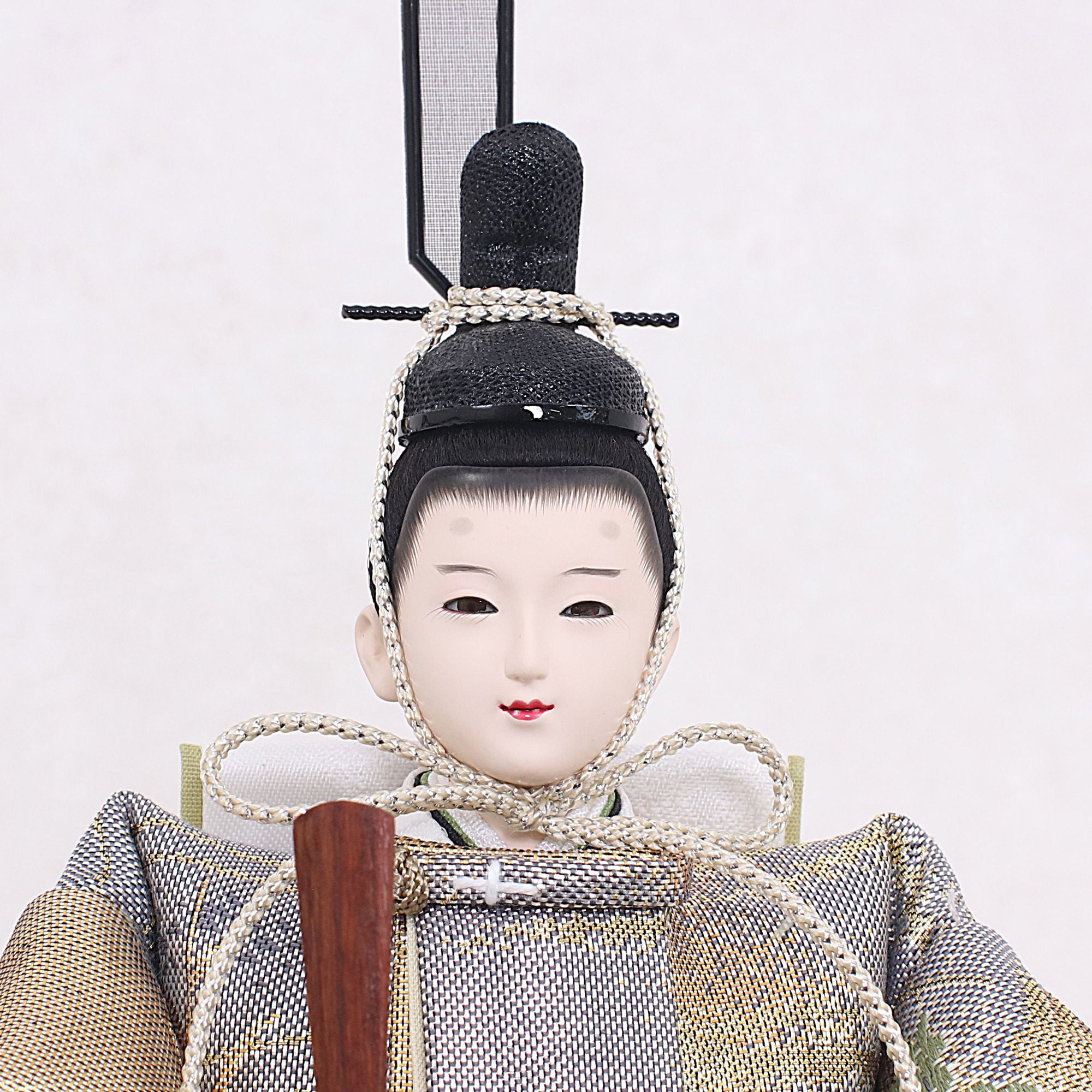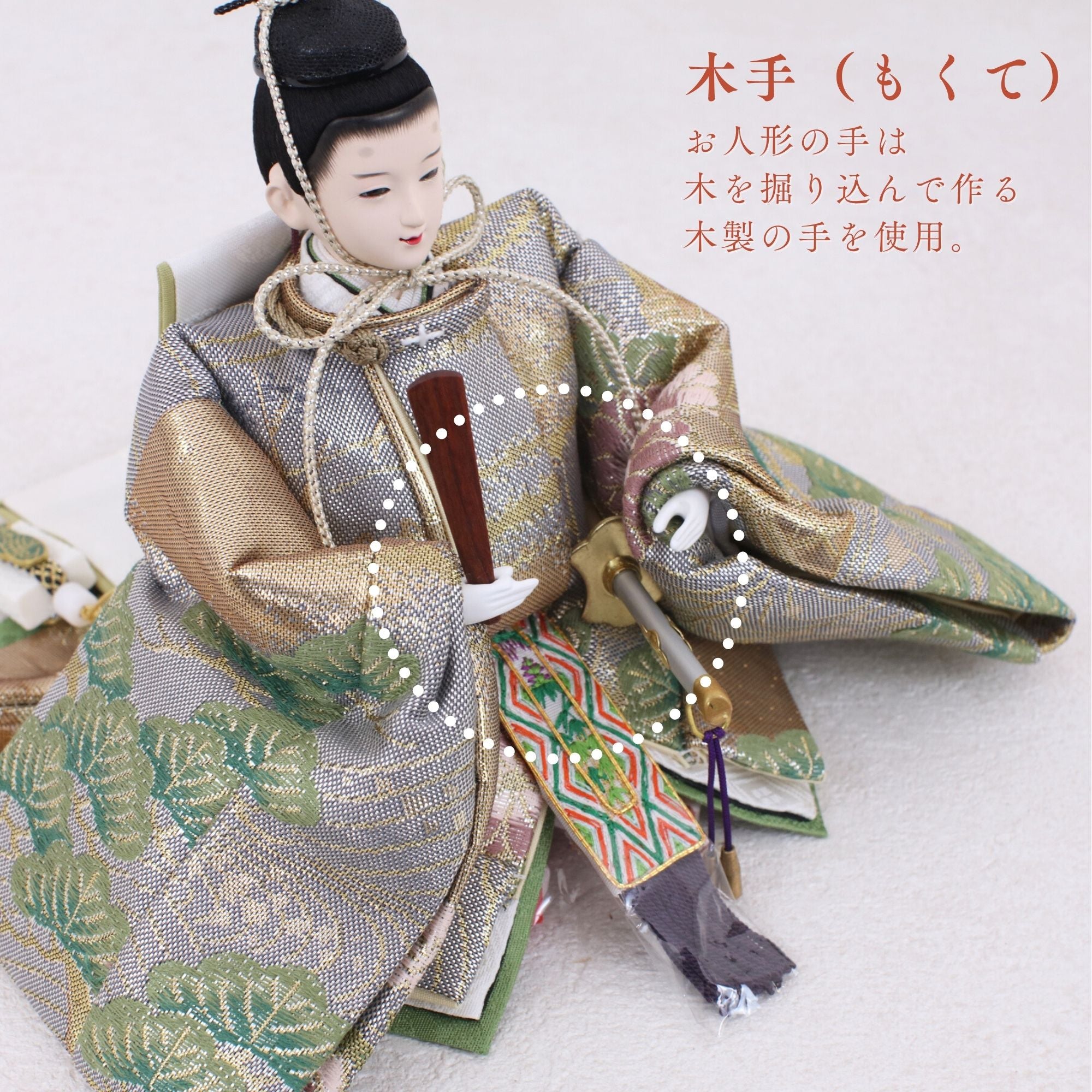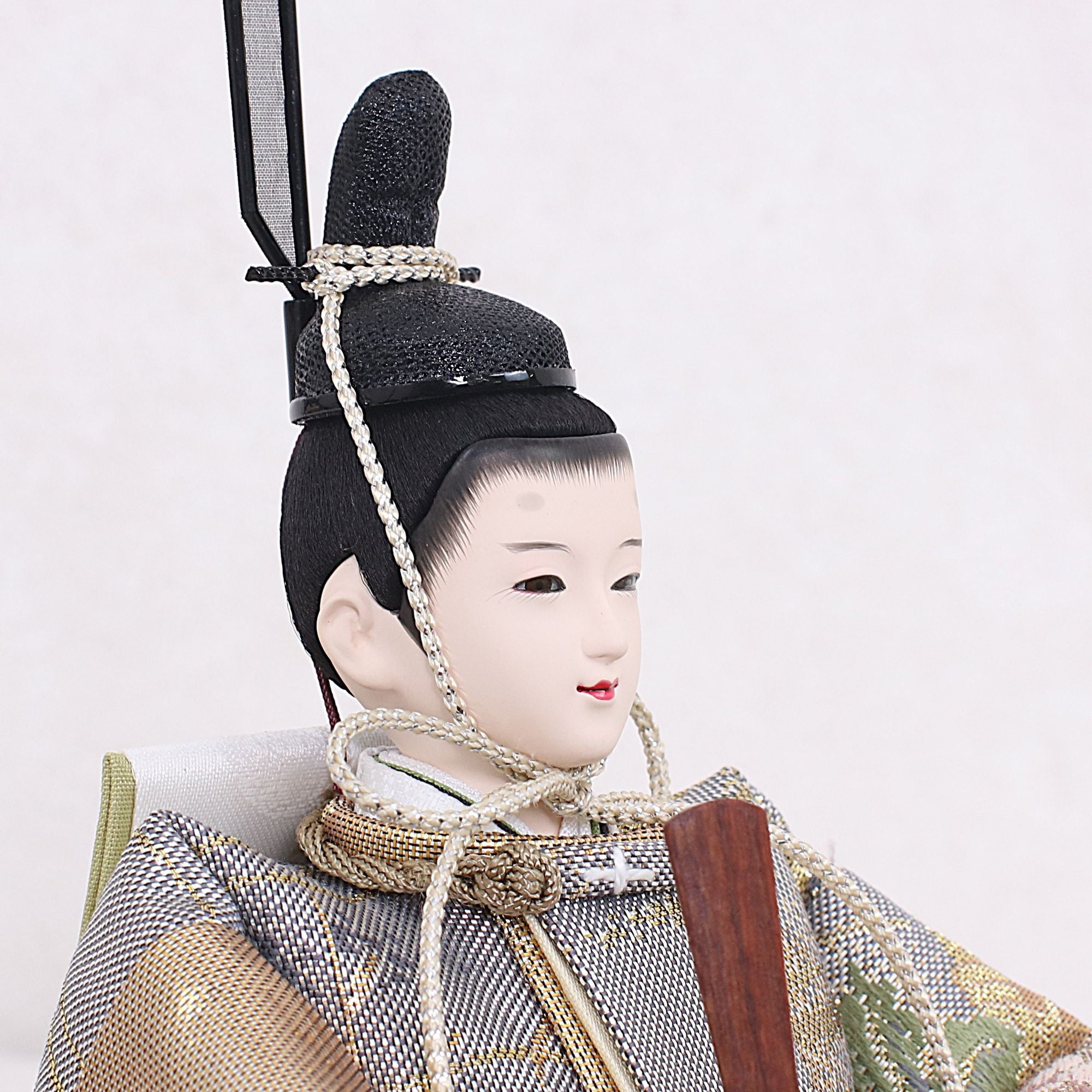 国産の分(せん)は、美しい木目と温もりある質感が魅力の天然木です。耐久性に優れ、経年とともに味わいを醸し出します。台座や屏風などに使用することで、自然素材ならではの落ち着いた風合いと上質感を演出し、雛人形全体をより品格ある印象に仕上げます。