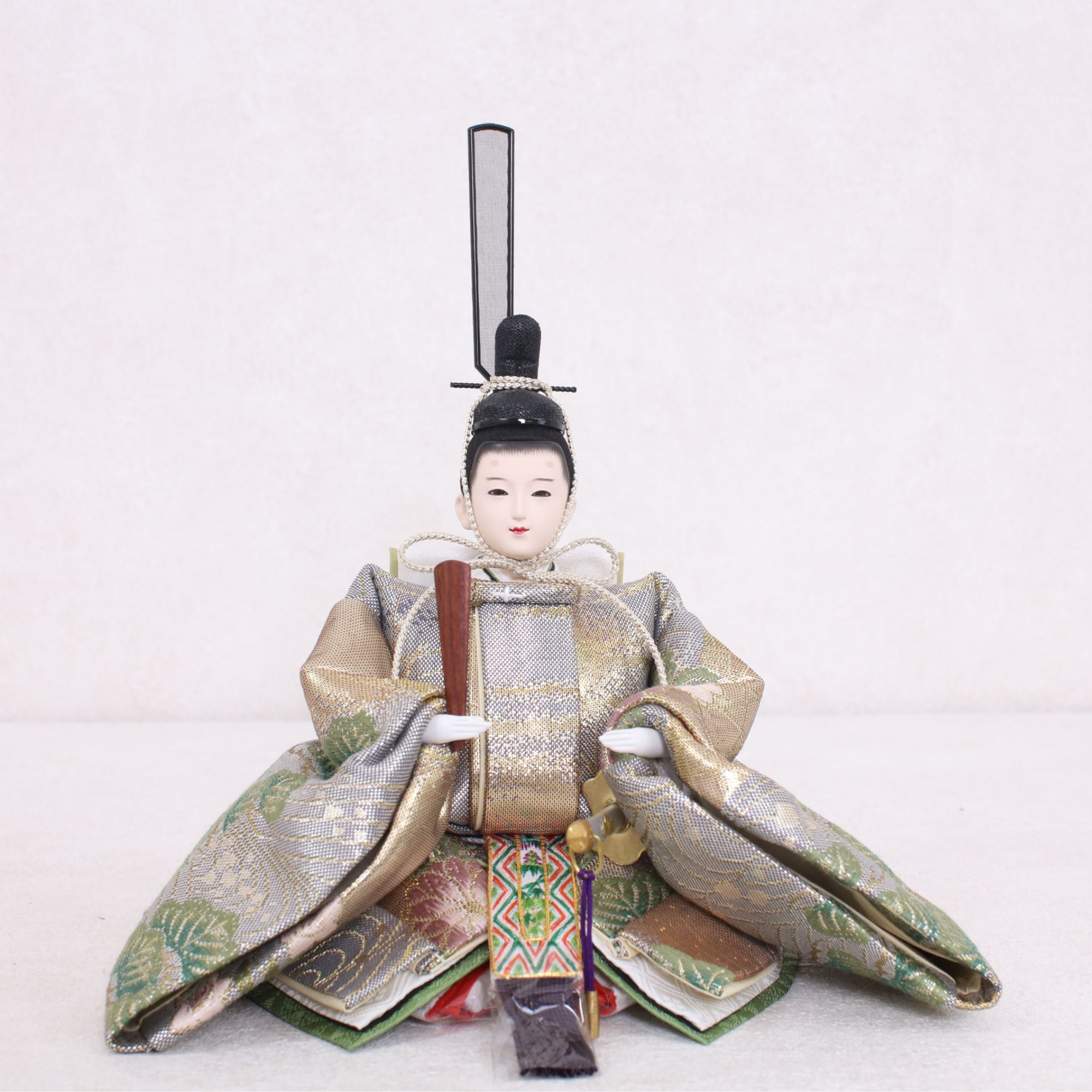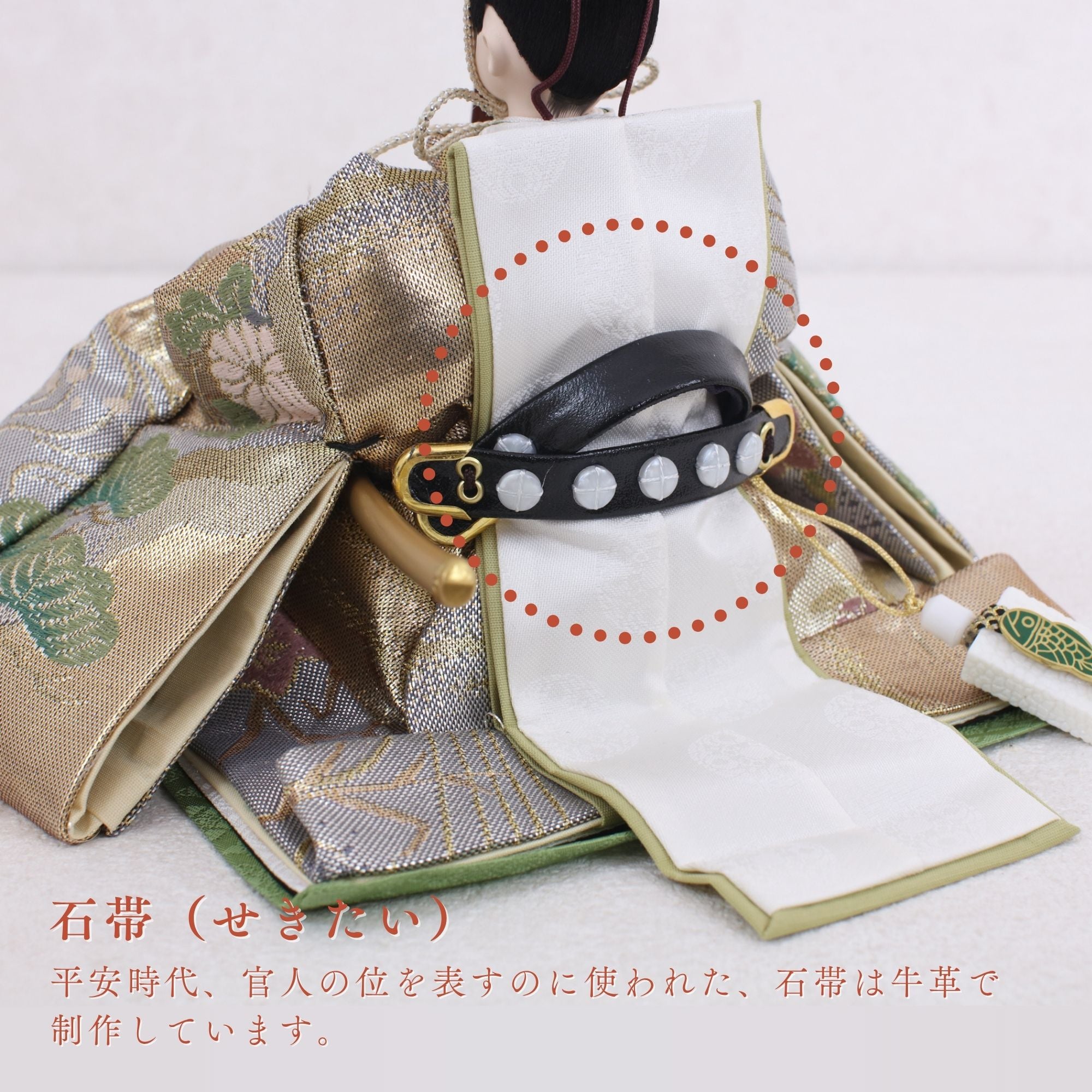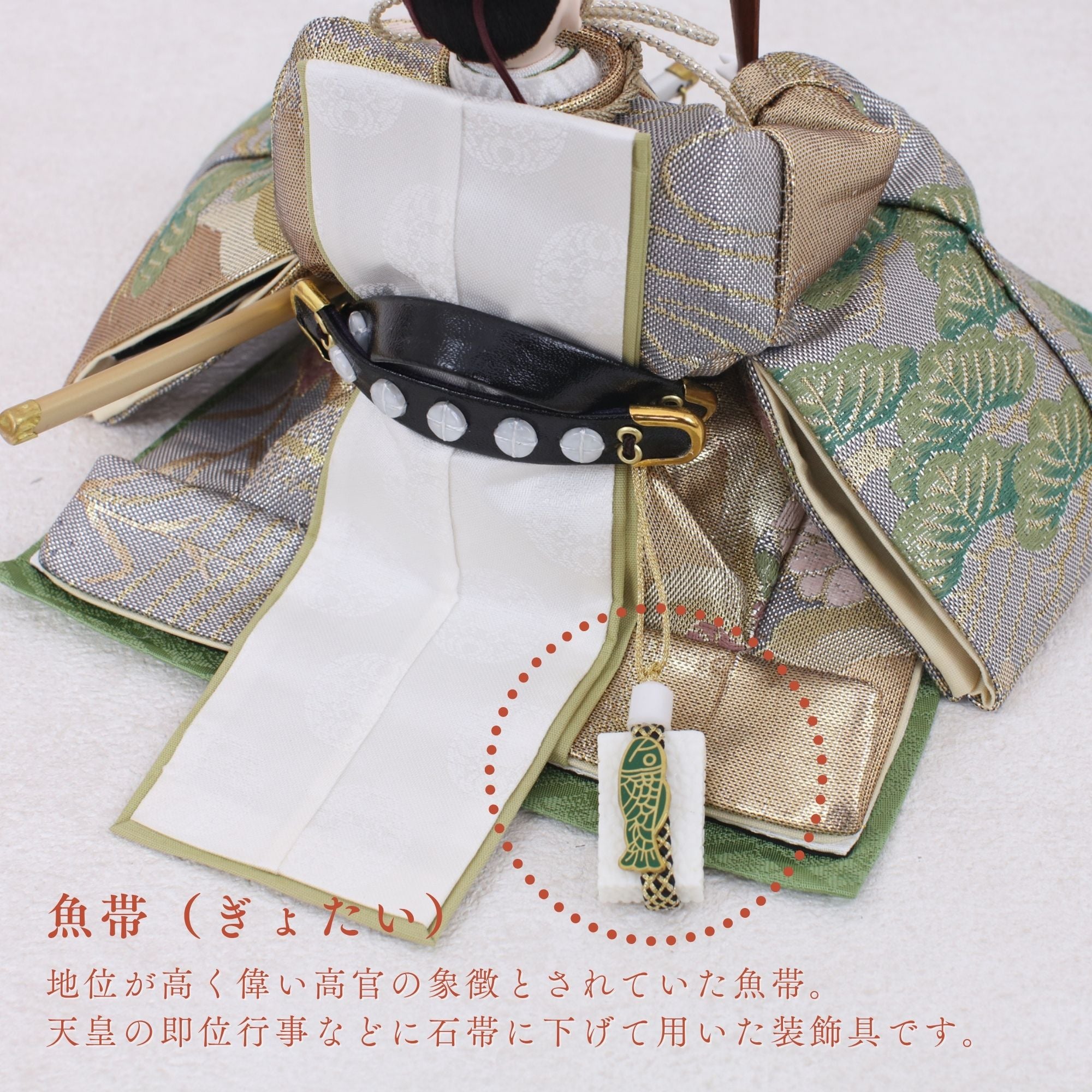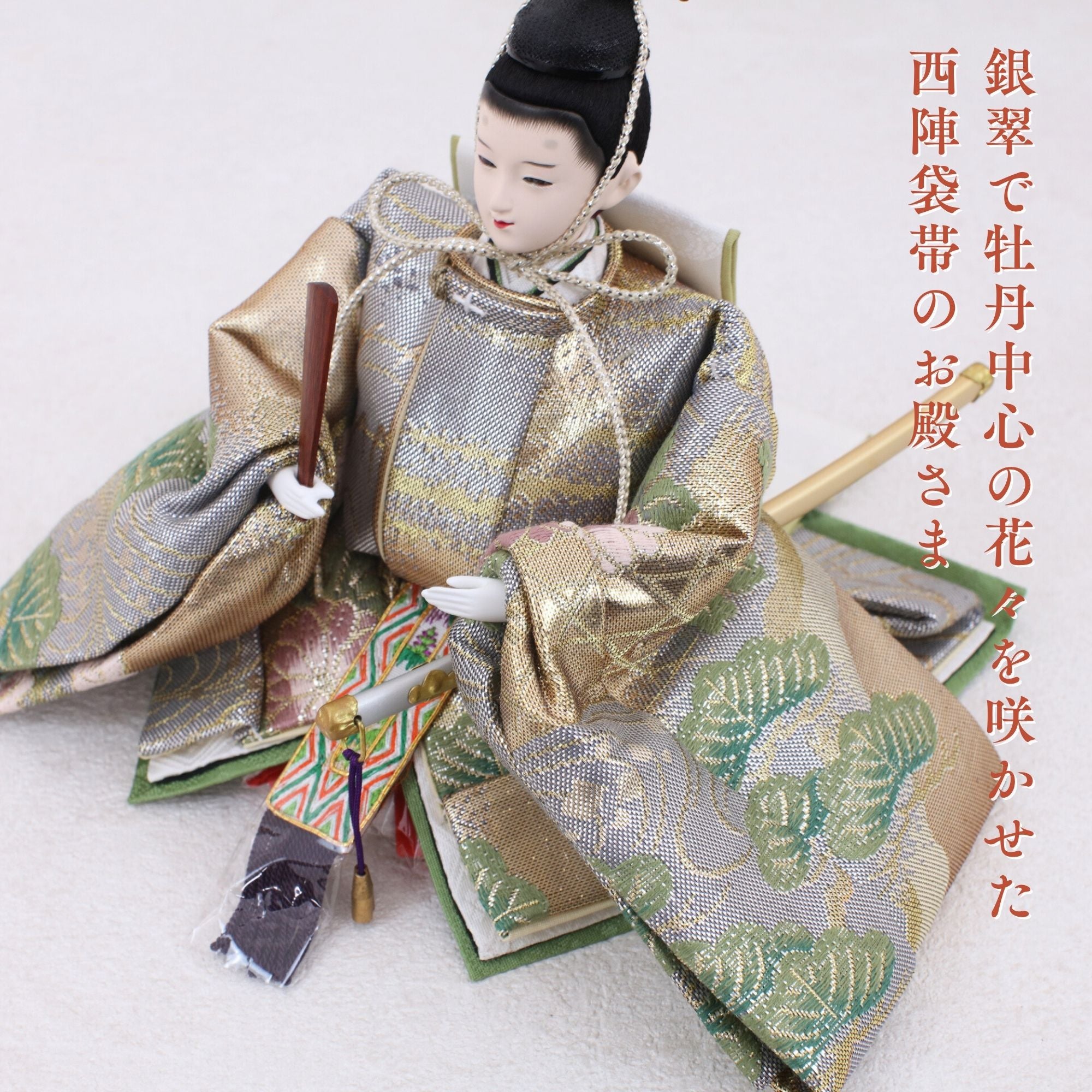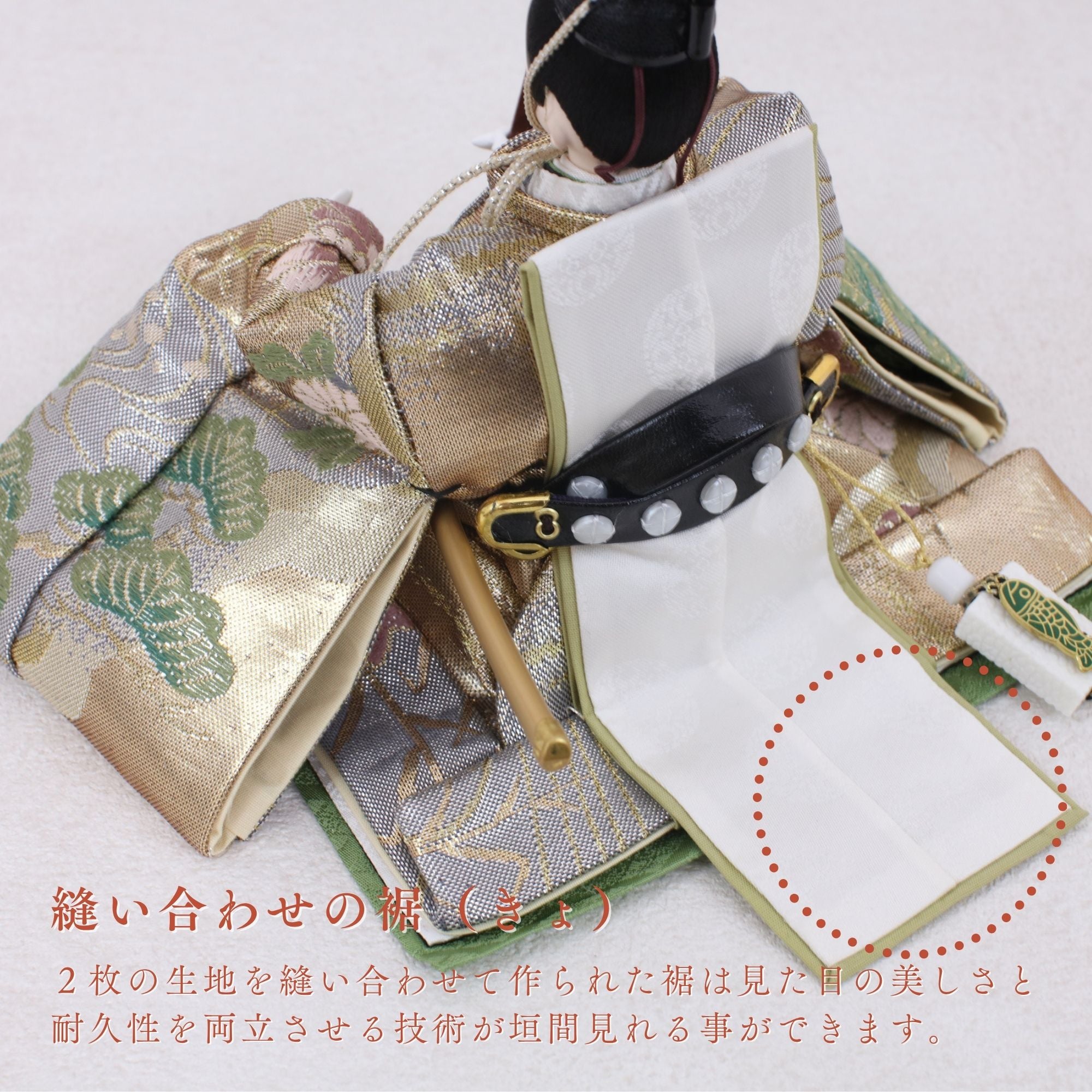 国産の分(せん)は、美しい木目と温もりある質感が魅力の天然木です。耐久性に優れ、経年とともに味わいを醸し出します。台座や屏風などに使用することで、自然素材ならではの落ち着いた風合いと上質感を演出し、雛人形全体をより品格ある印象に仕上げます。