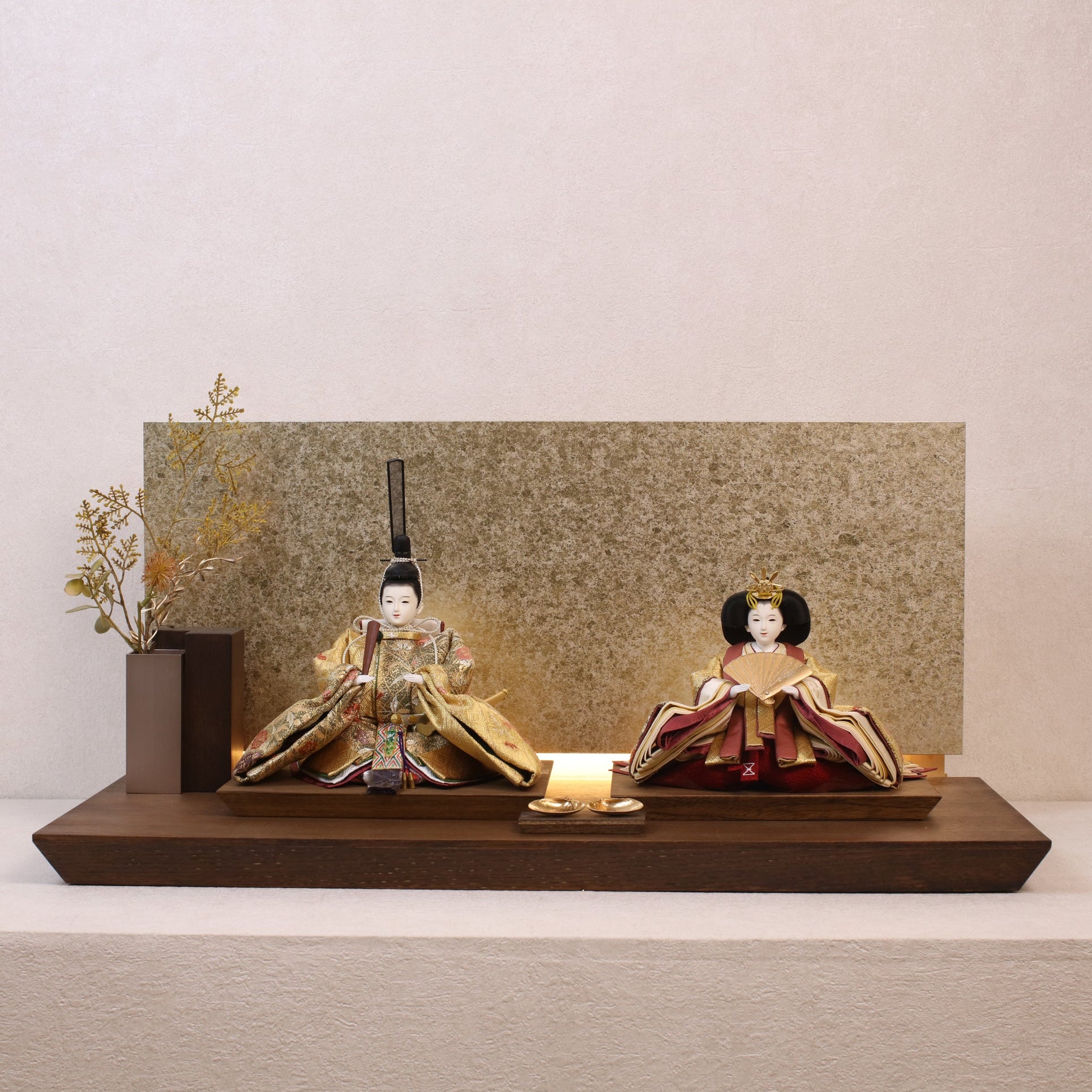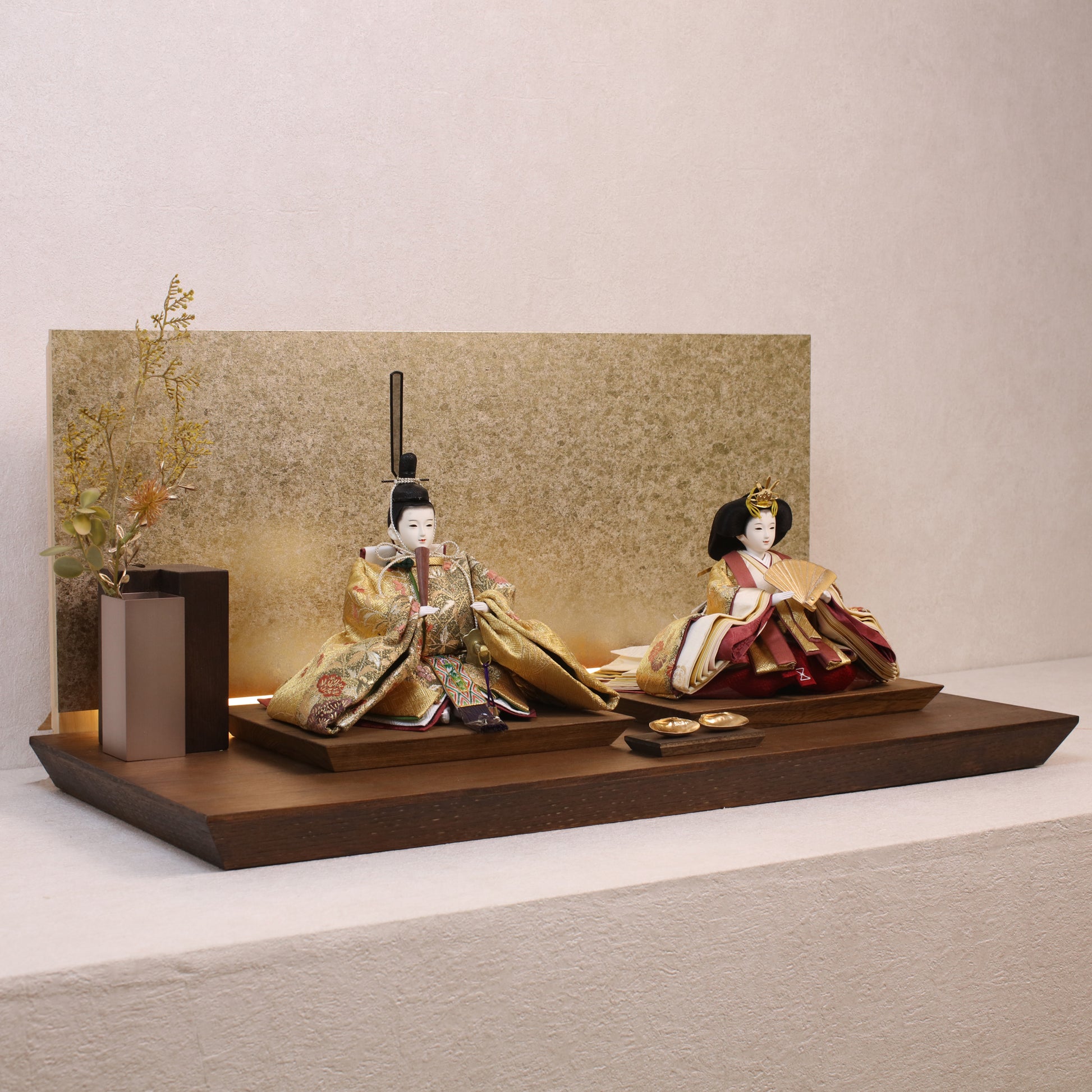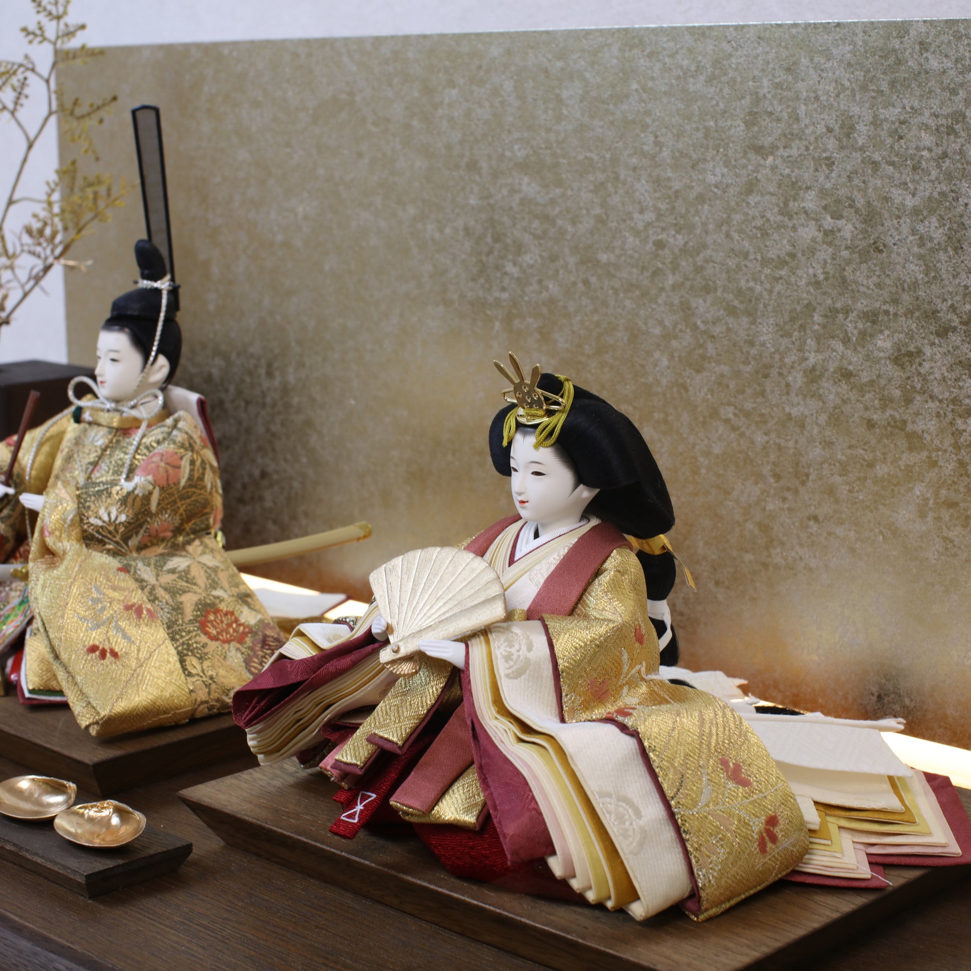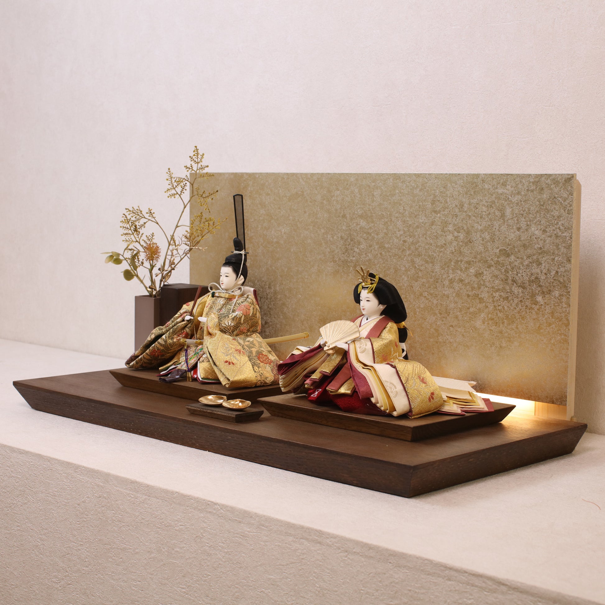 箔押しのお屏風は光を受けて輝き、お雛様の姿をそっと映し出します。