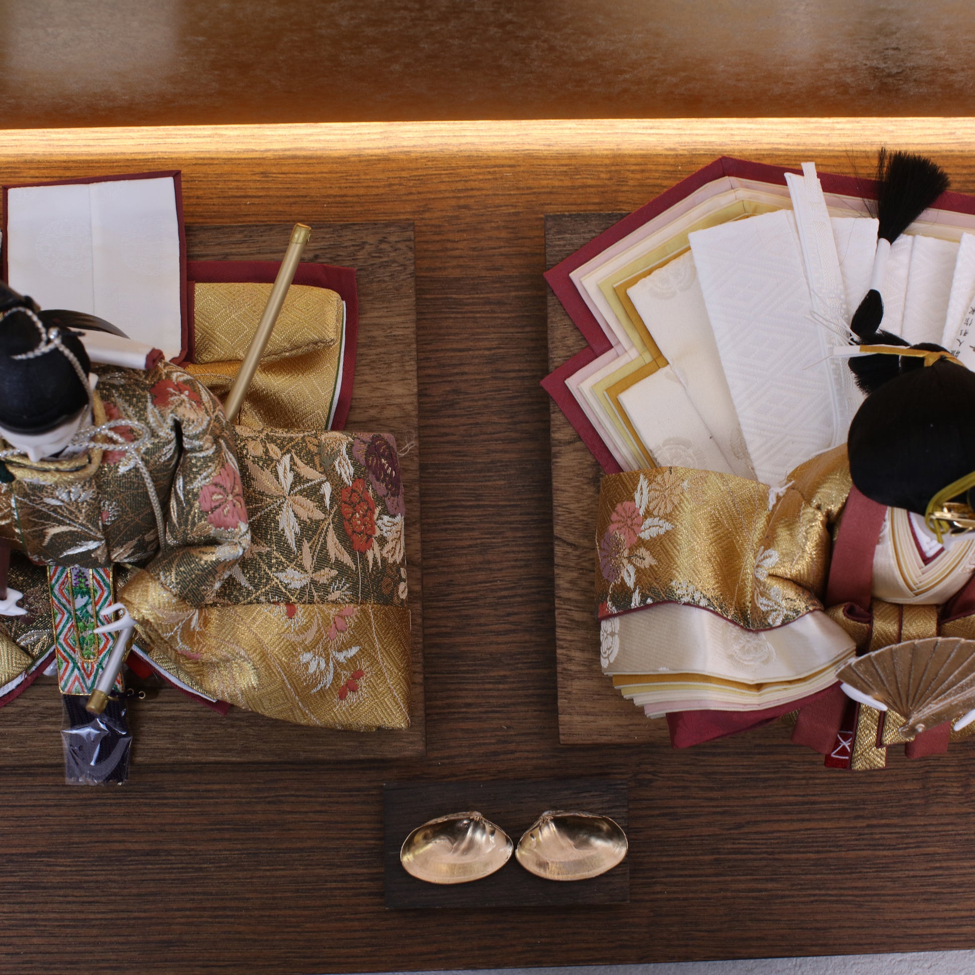 お屏風の下からは柔らかなライトがともり、実物と映る姿が重なって飾り全体がいっそう華やかで、美しい世界が生まれます。