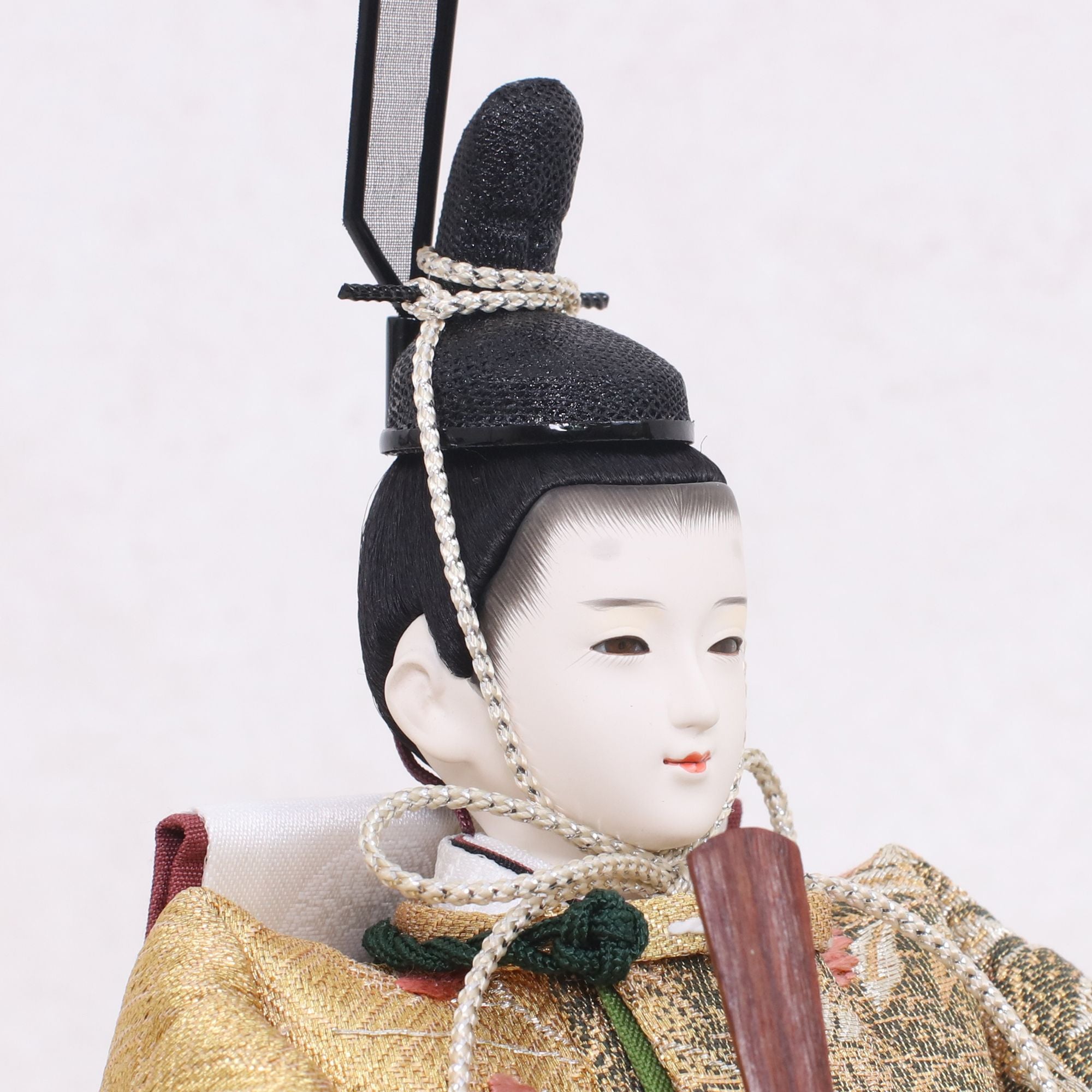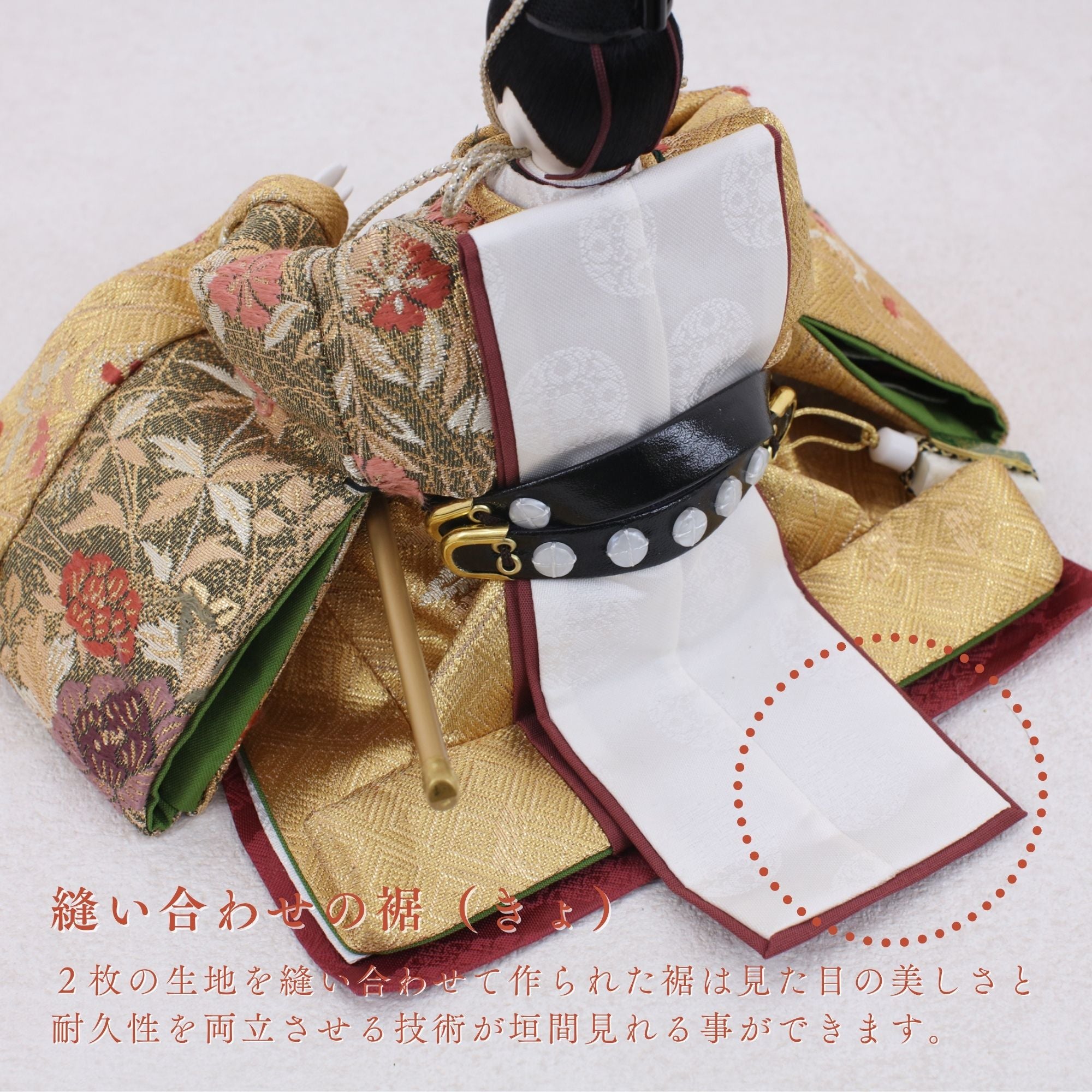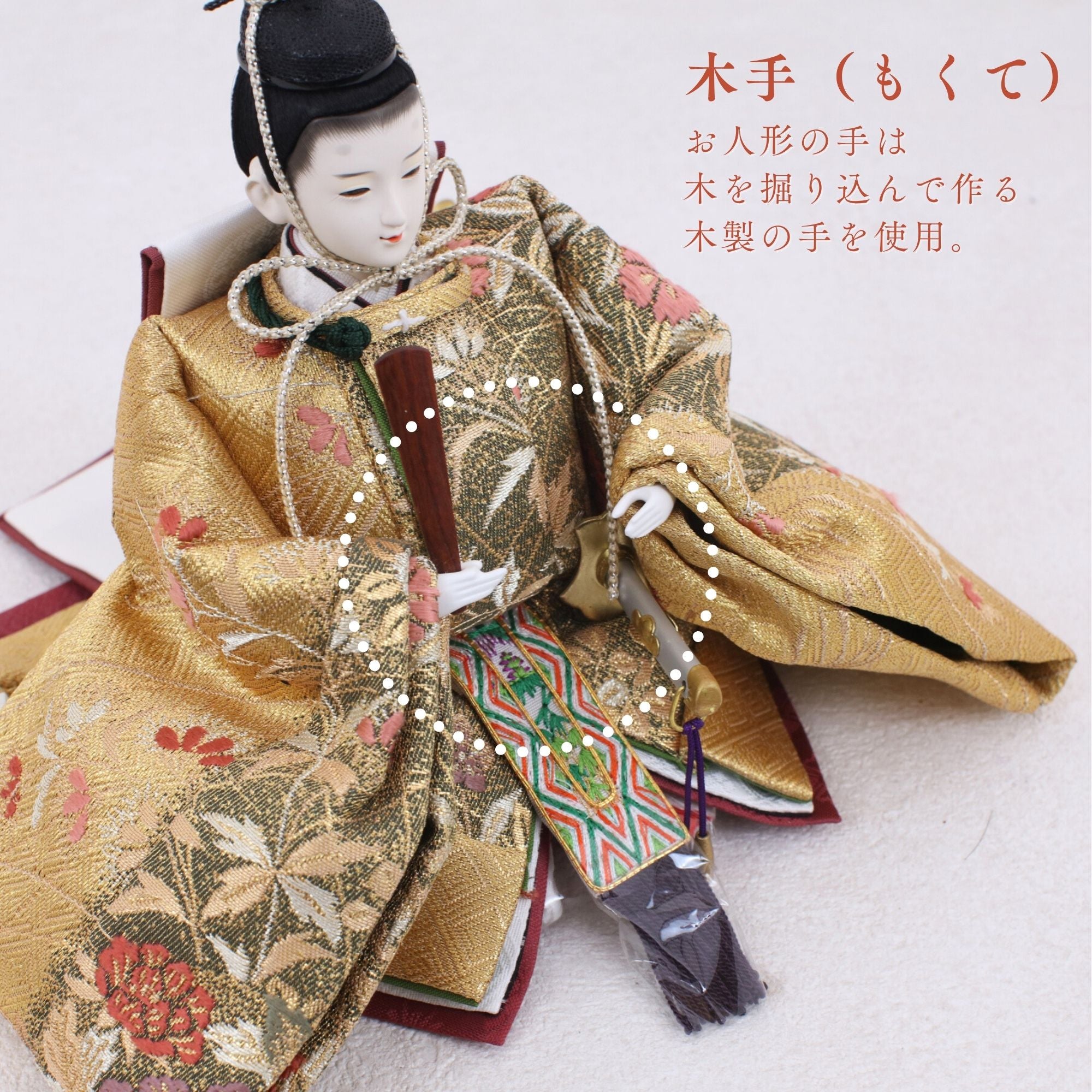 国産の分(せん)は、美しい木目と温もりある質感が魅力の天然木です。耐久性に優れ、経年とともに味わいを醸し出します。台座や屏風などに使用することで、自然素材ならではの落ち着いた風合いと上質感を演出し、雛人形全体をより品格ある印象に仕上げます。