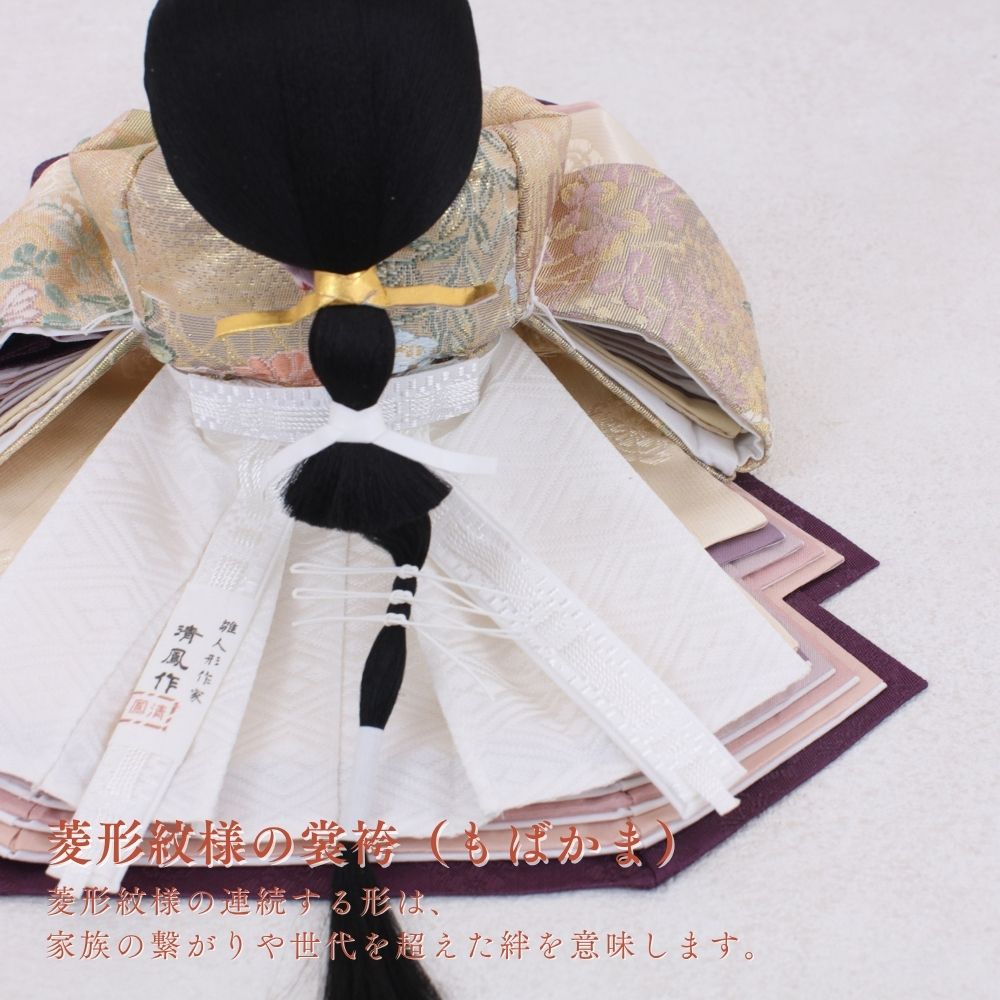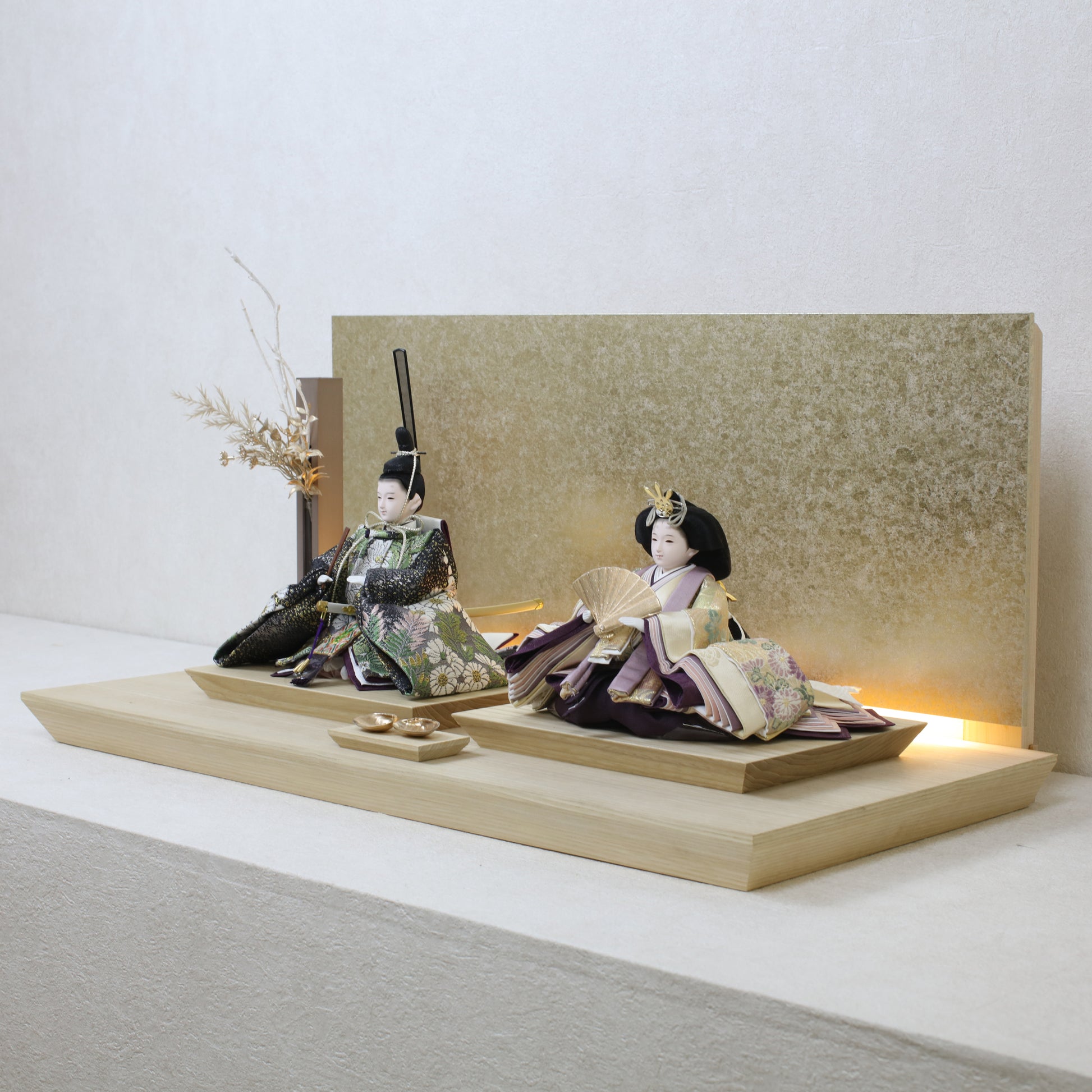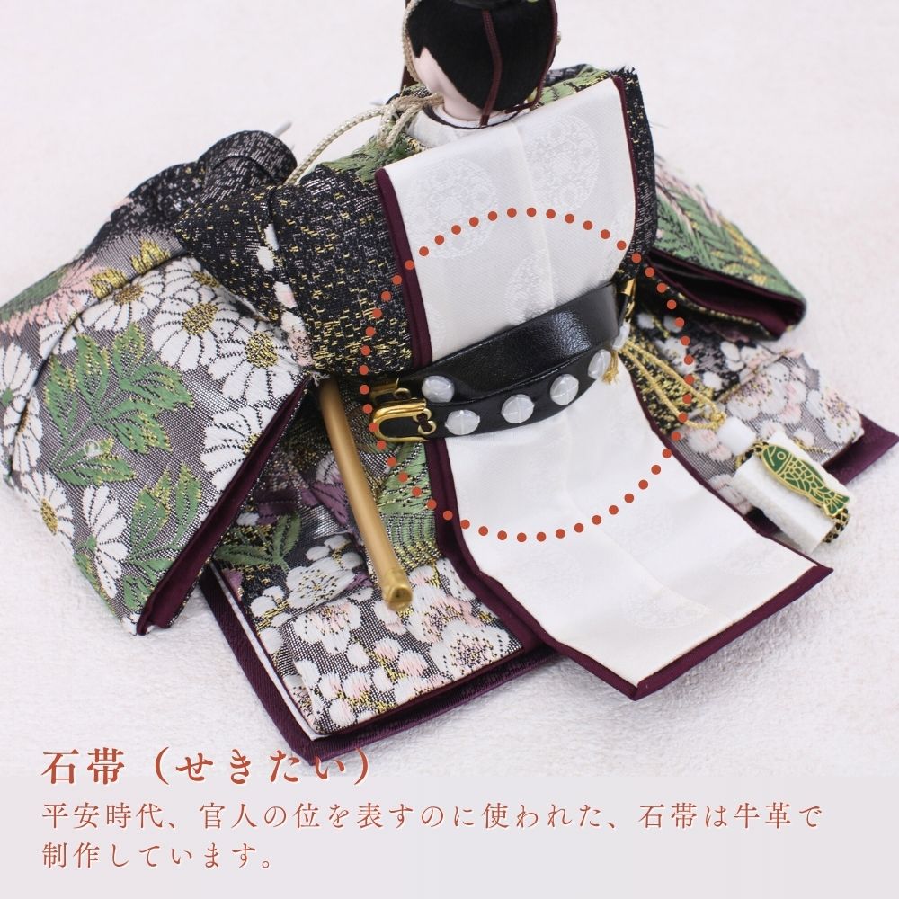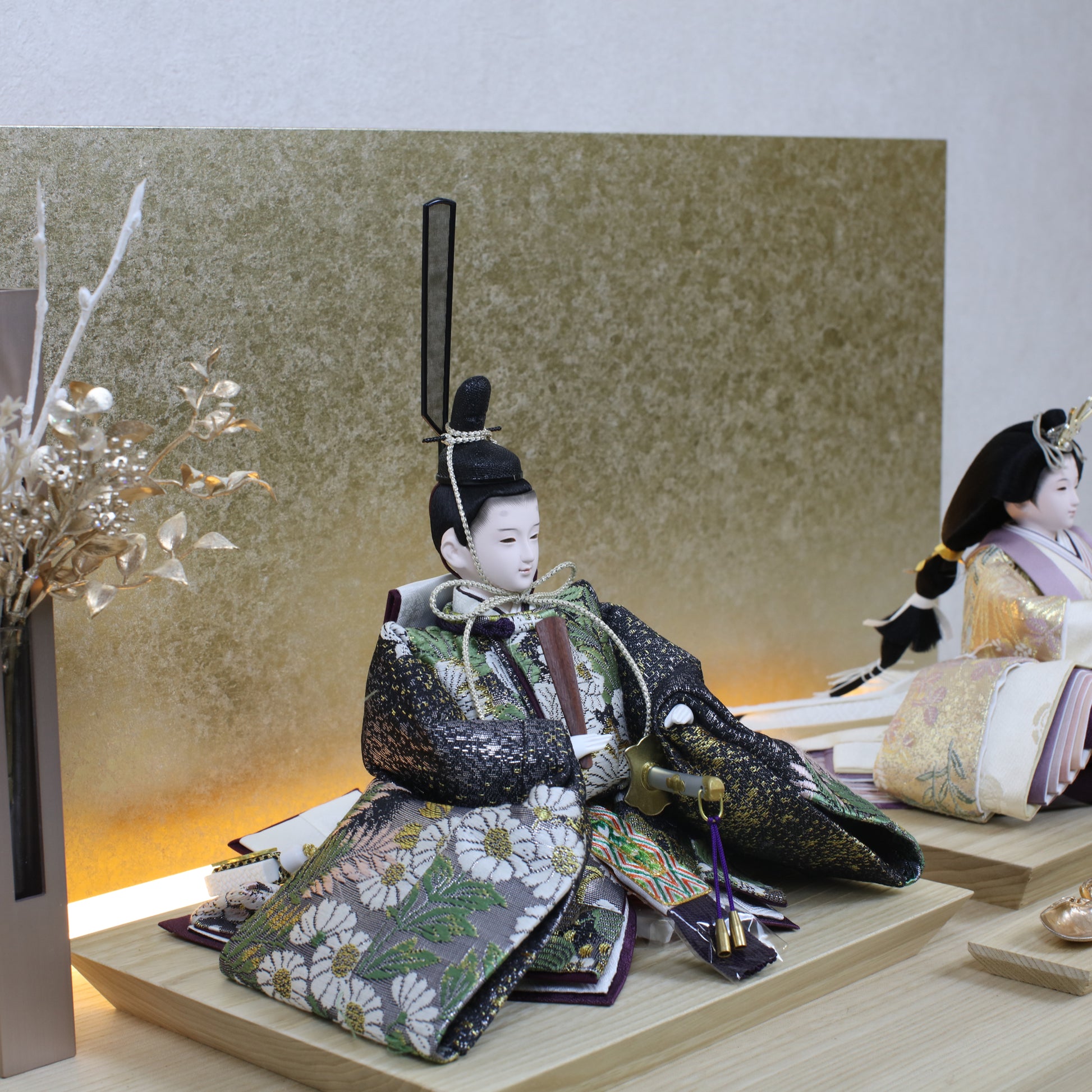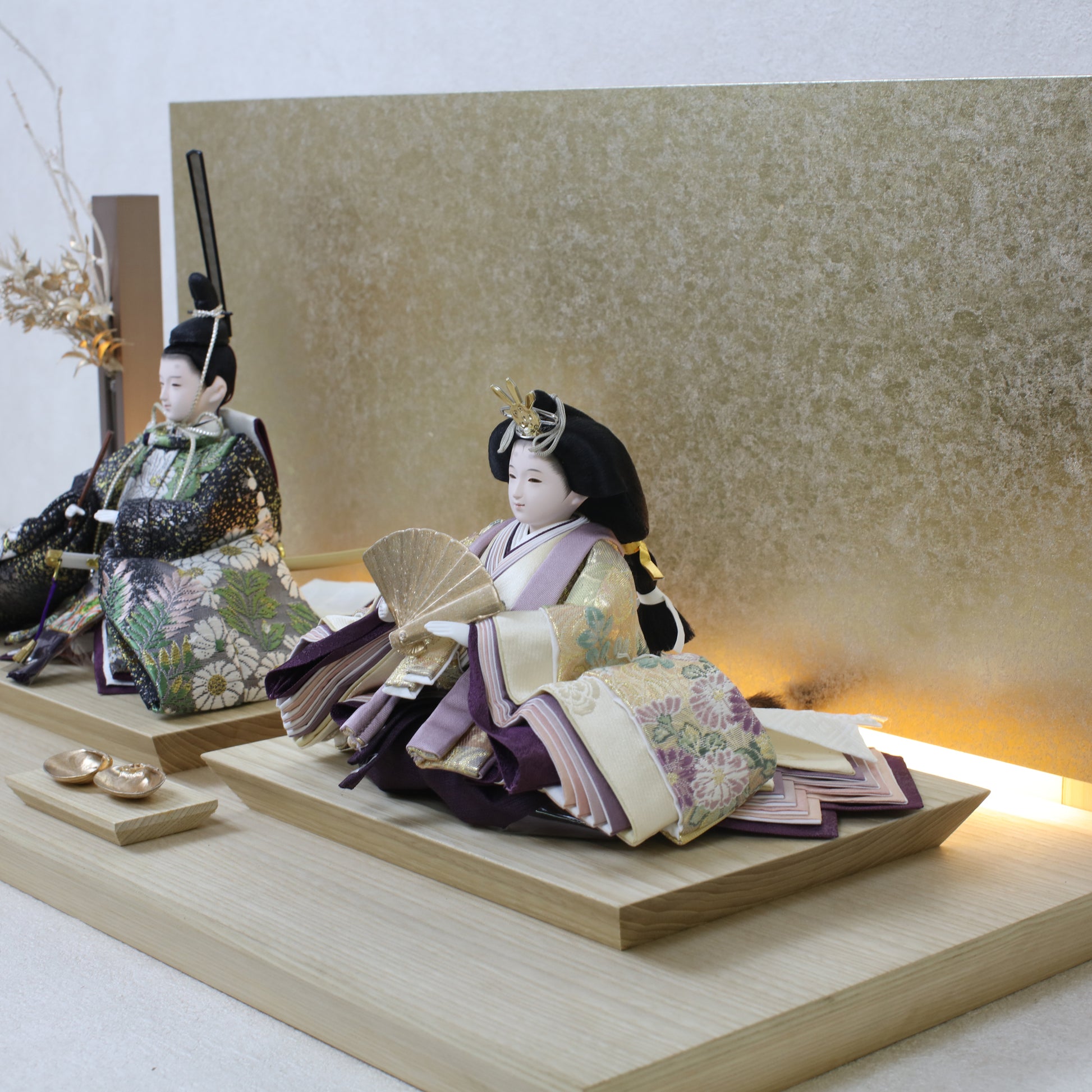 国産の分(せん)は、美しい木目と温もりある質感が魅力の天然木です。耐久性に優れ、経年とともに味わいを醸し出します。台座や屏風などに使用することで、自然素材ならではの落ち着いた風合いと上質感を演出し、雛人形全体をより品格ある印象に仕上げます。
