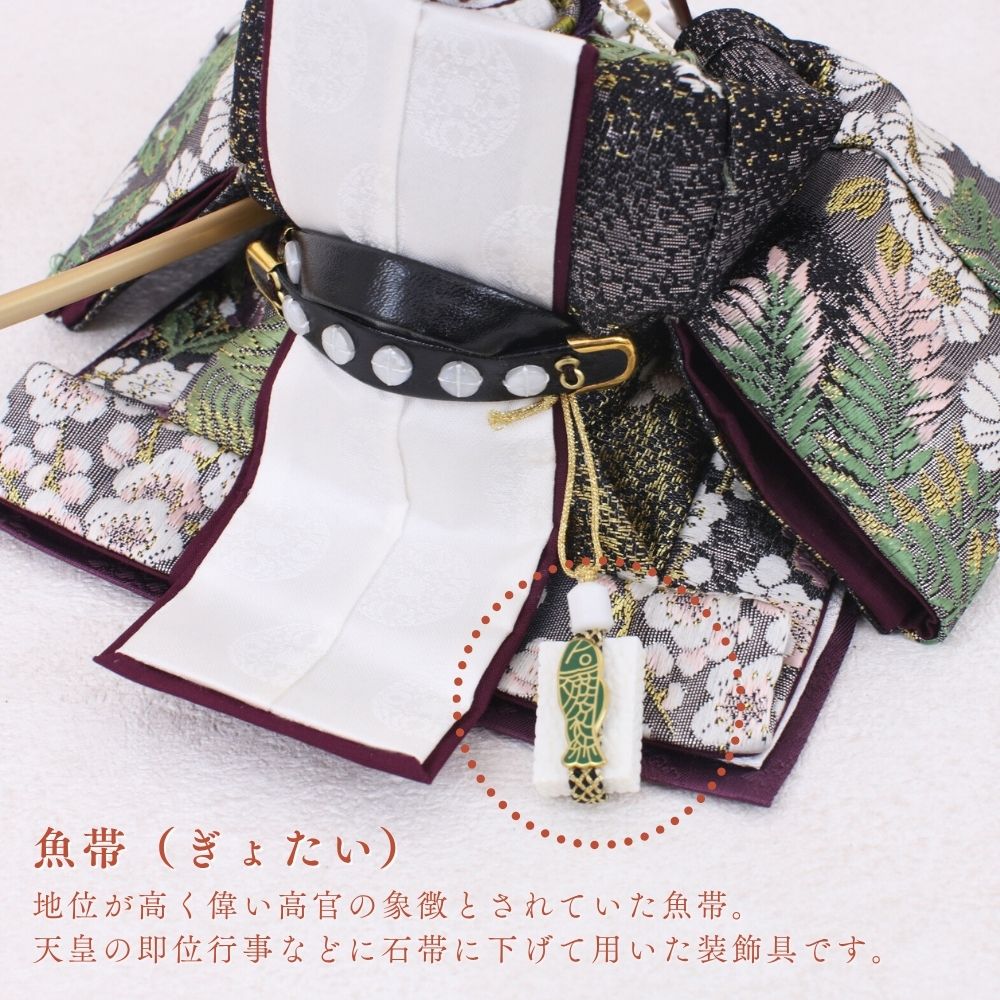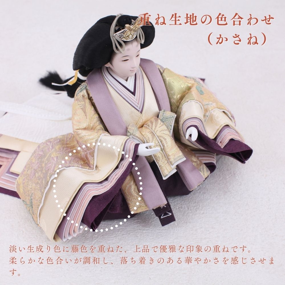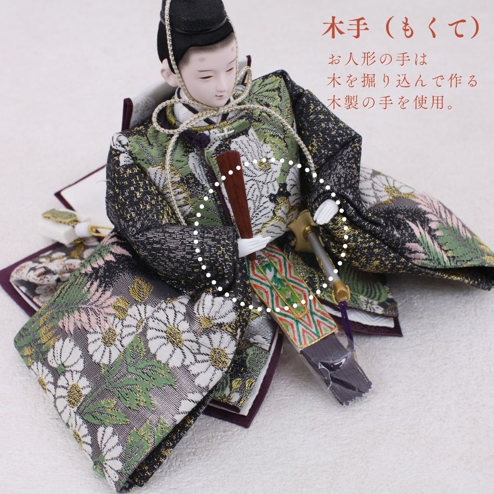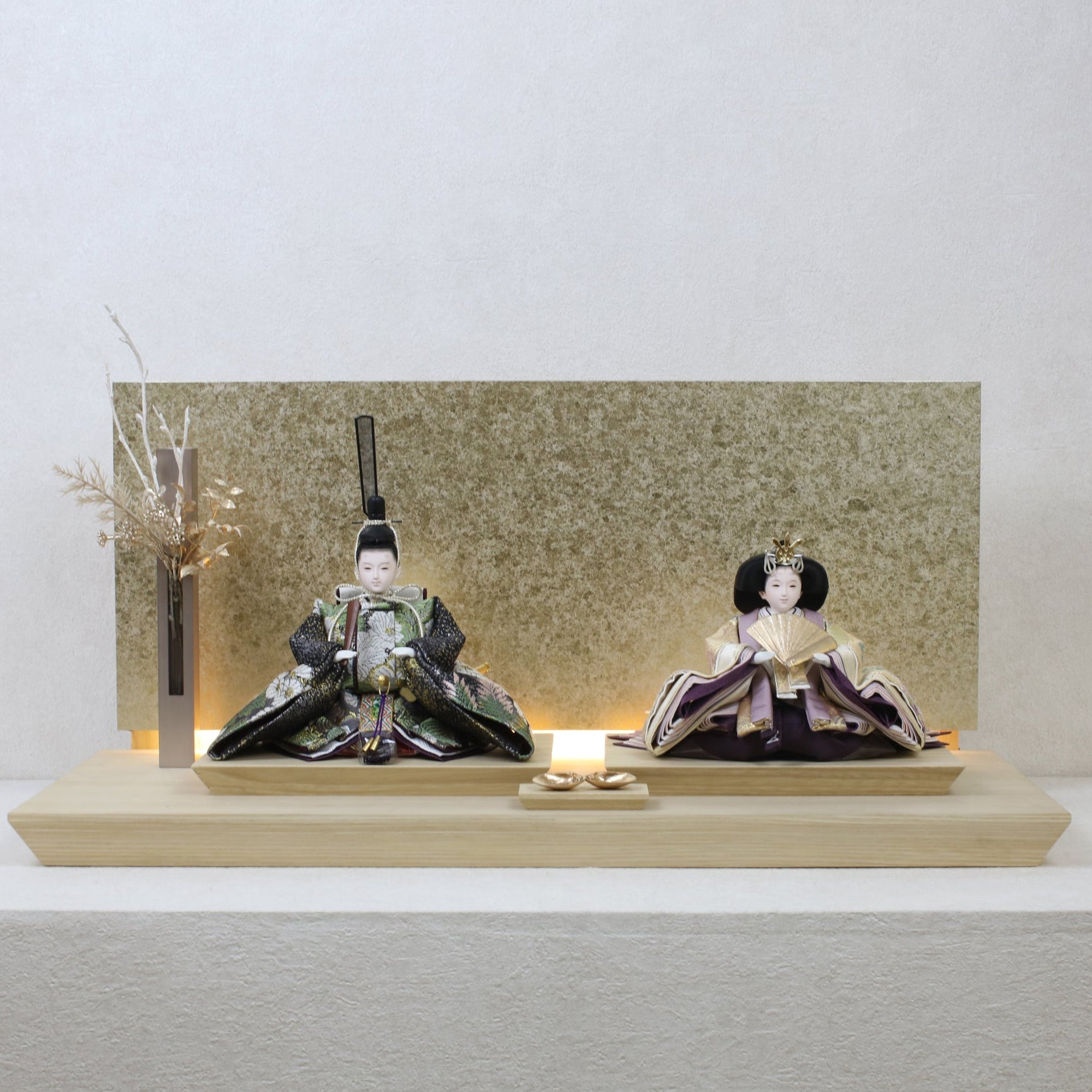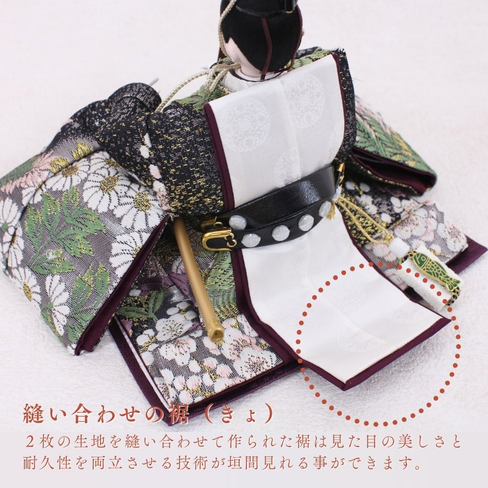 国産の分(せん)は、美しい木目と温もりある質感が魅力の天然木です。耐久性に優れ、経年とともに味わいを醸し出します。台座や屏風などに使用することで、自然素材ならではの落ち着いた風合いと上質感を演出し、雛人形全体をより品格ある印象に仕上げます。