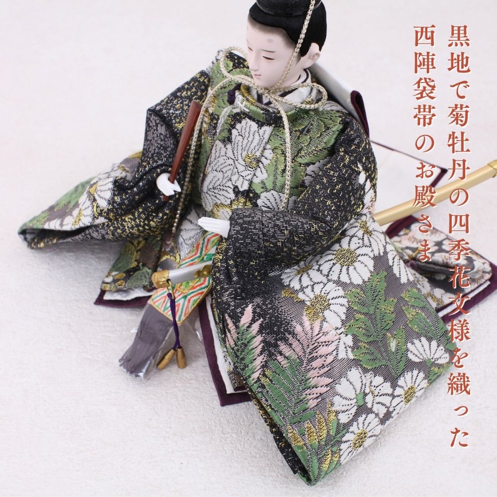 黒地で菊牡丹の四季花文様を織った西陣袋帯のお殿さま