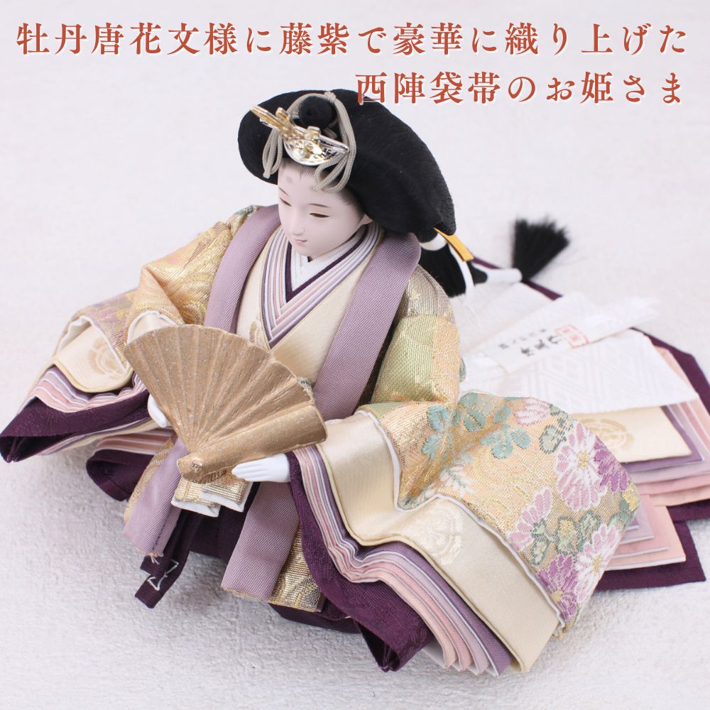 牡丹唐花文様に藤紫で豪華に織り上げた西陣袋帯のお姫さま。お子さまの健康と明るい未来を願う優雅な装いです。