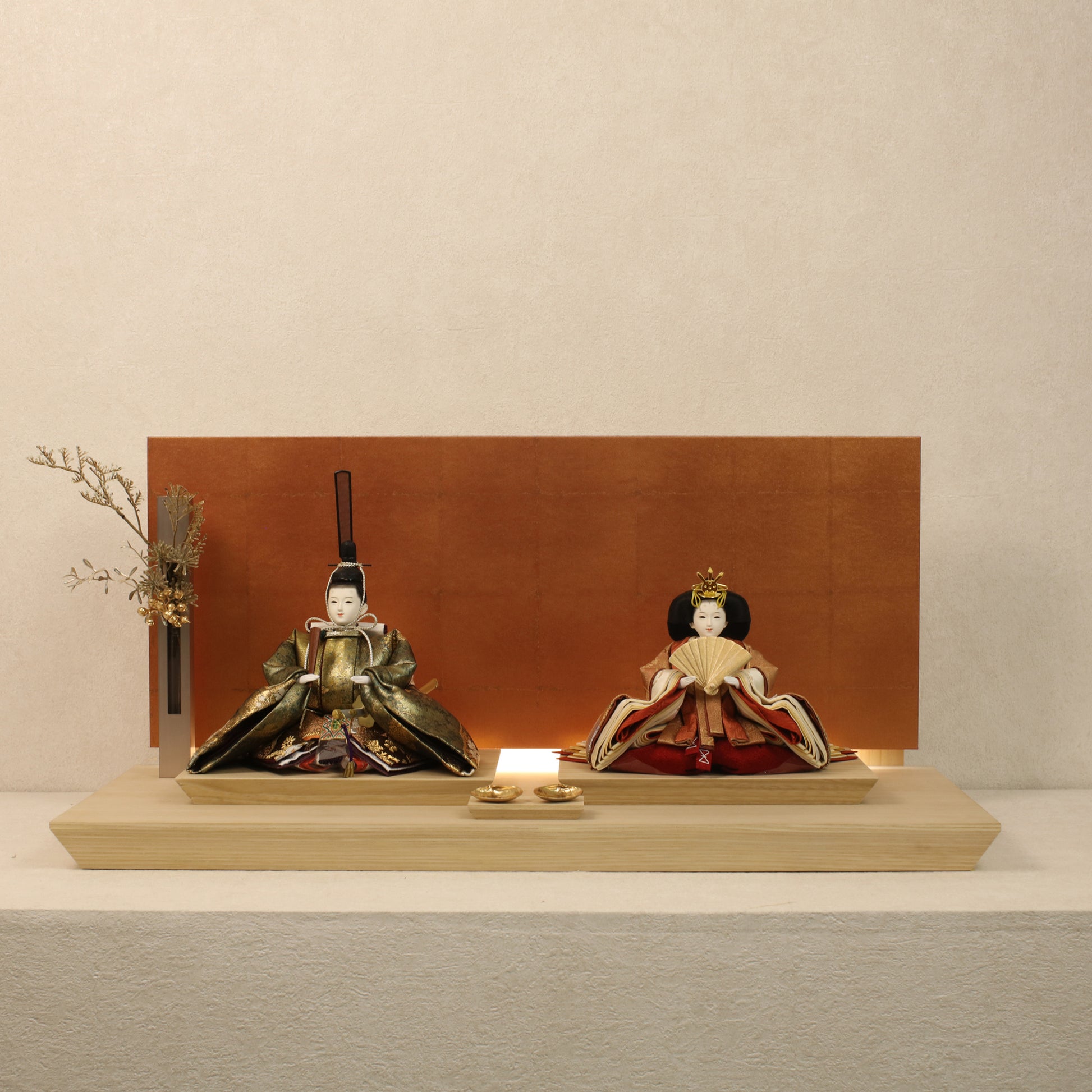 箔押しのお屏風は光を受けて輝き、お雛様の姿をそっと映し出します。