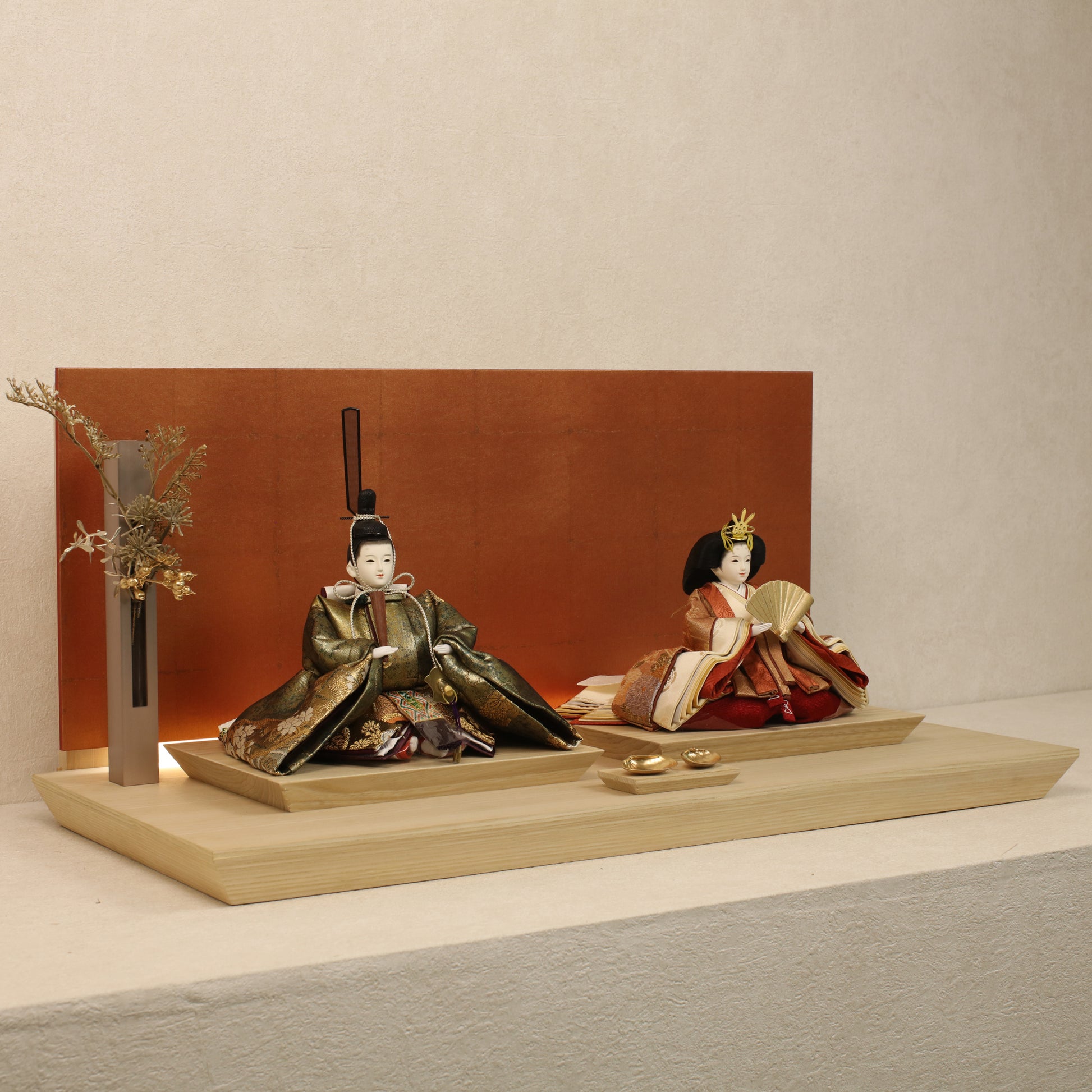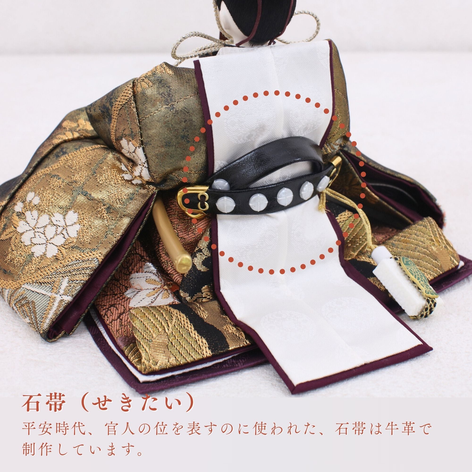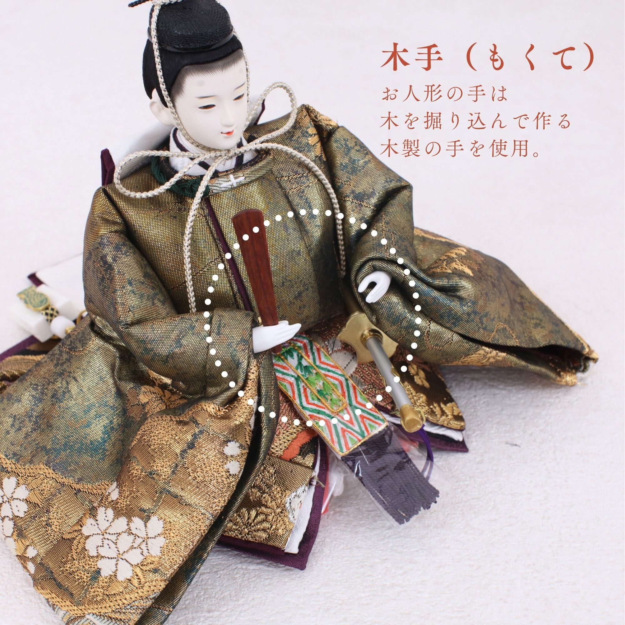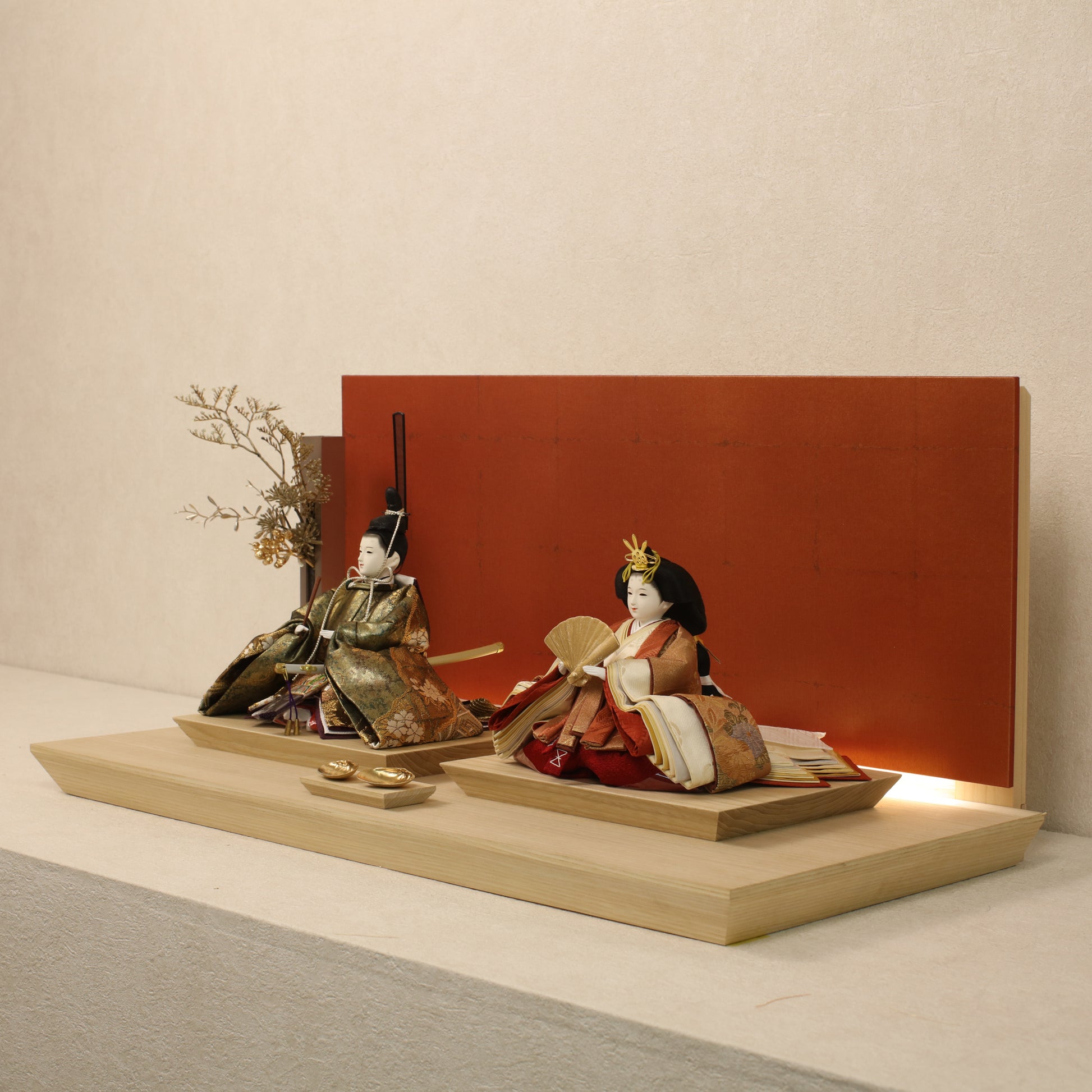 国産の分(せん)は、美しい木目と温もりある質感が魅力の天然木です。耐久性に優れ、経年とともに味わいを醸し出します。台座や屏風などに使用することで、自然素材ならではの落ち着いた風合いと上質感を演出し、雛人形全体をより品格ある印象に仕上げます。