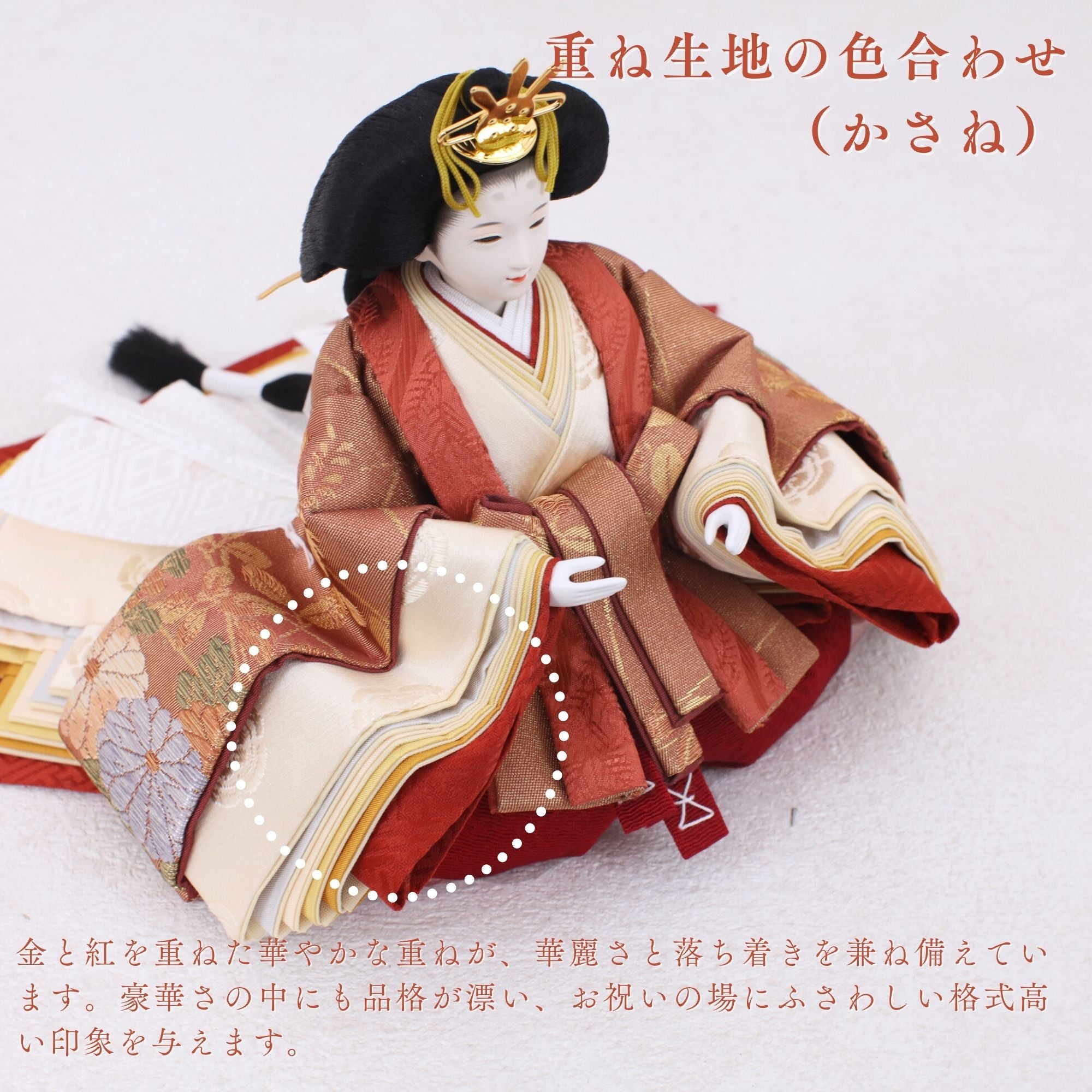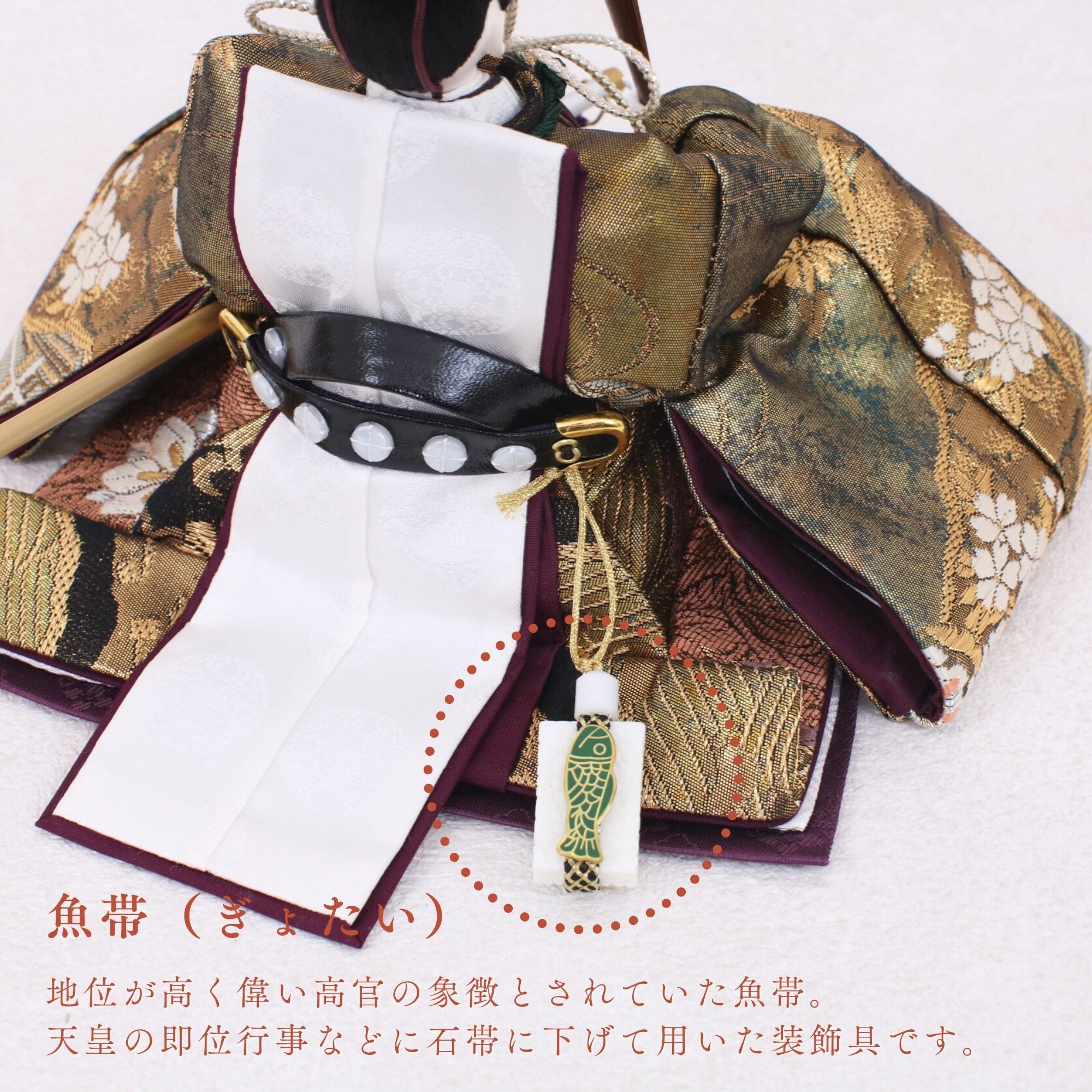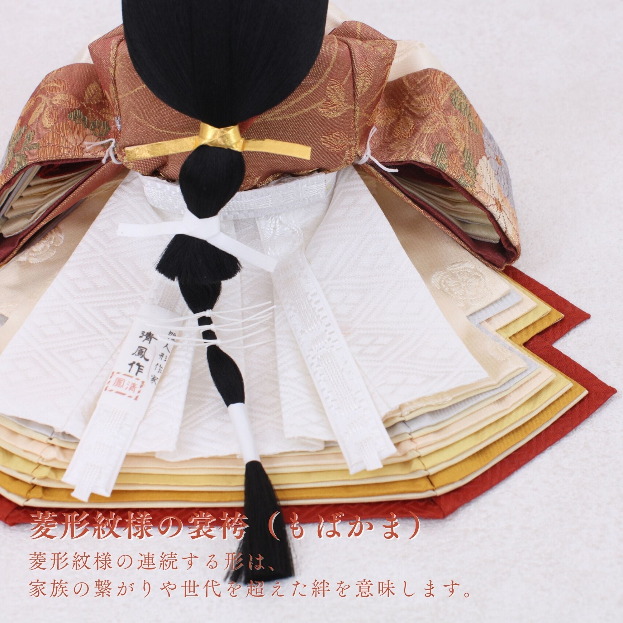 国産の分(せん)は、美しい木目と温もりある質感が魅力の天然木です。耐久性に優れ、経年とともに味わいを醸し出します。台座や屏風などに使用することで、自然素材ならではの落ち着いた風合いと上質感を演出し、雛人形全体をより品格ある印象に仕上げます。