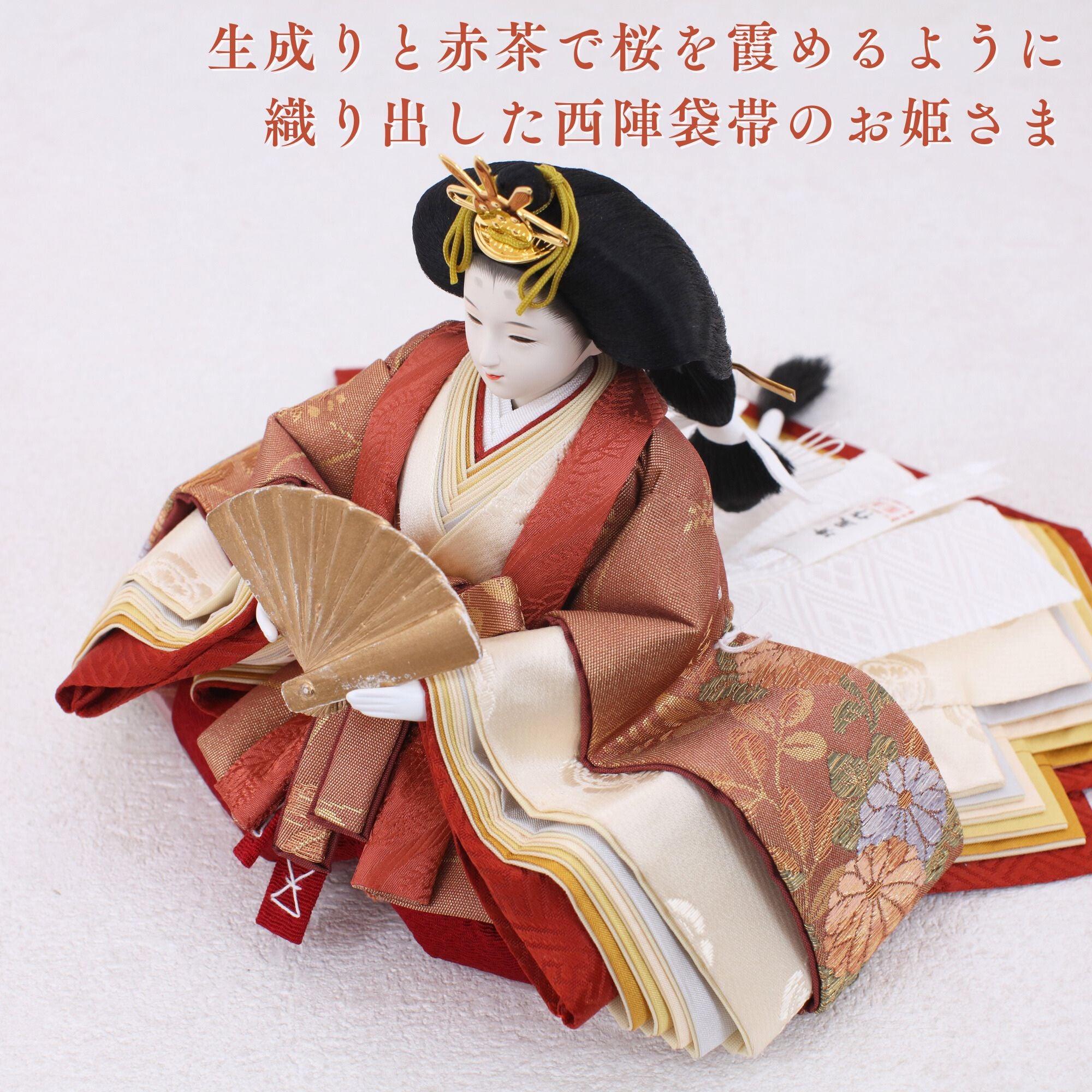 生成りと赤茶で桜を霞めるように織り出した西陣袋帯のお姫さま