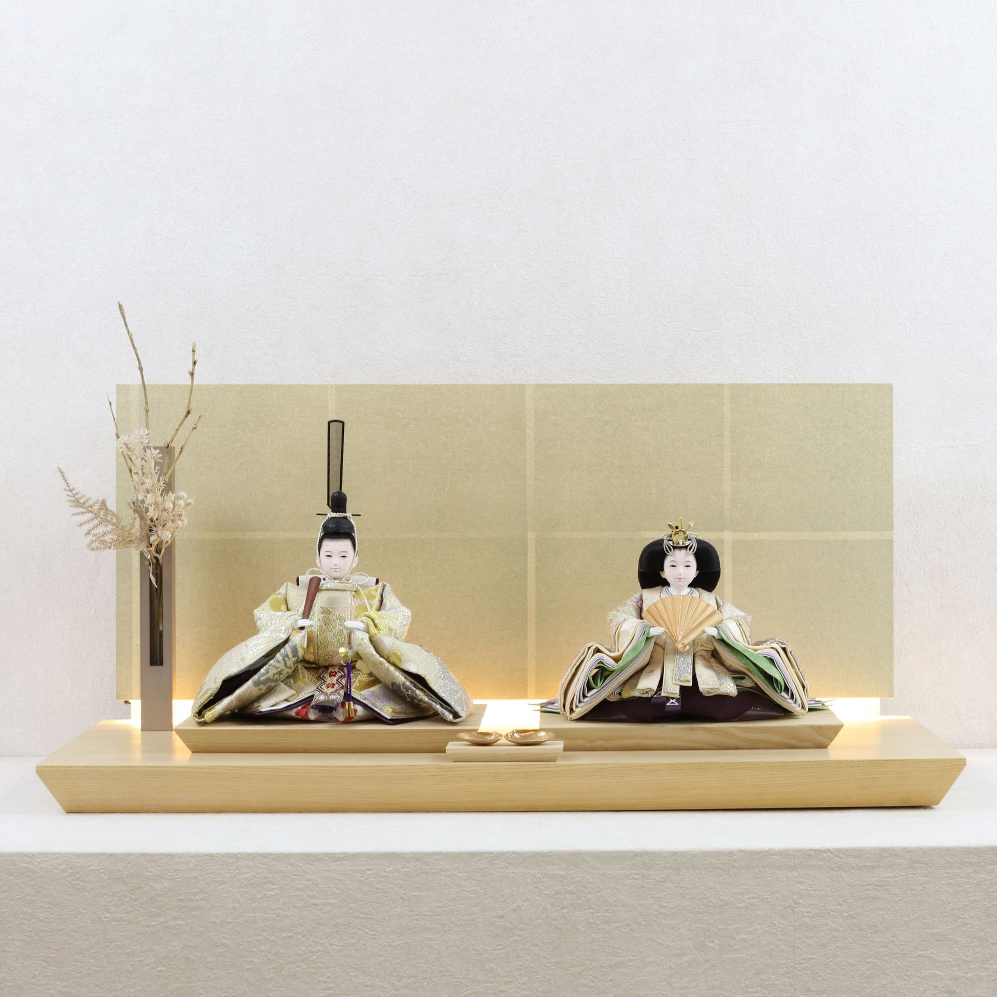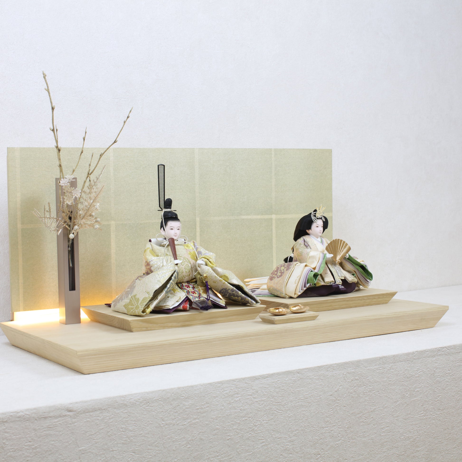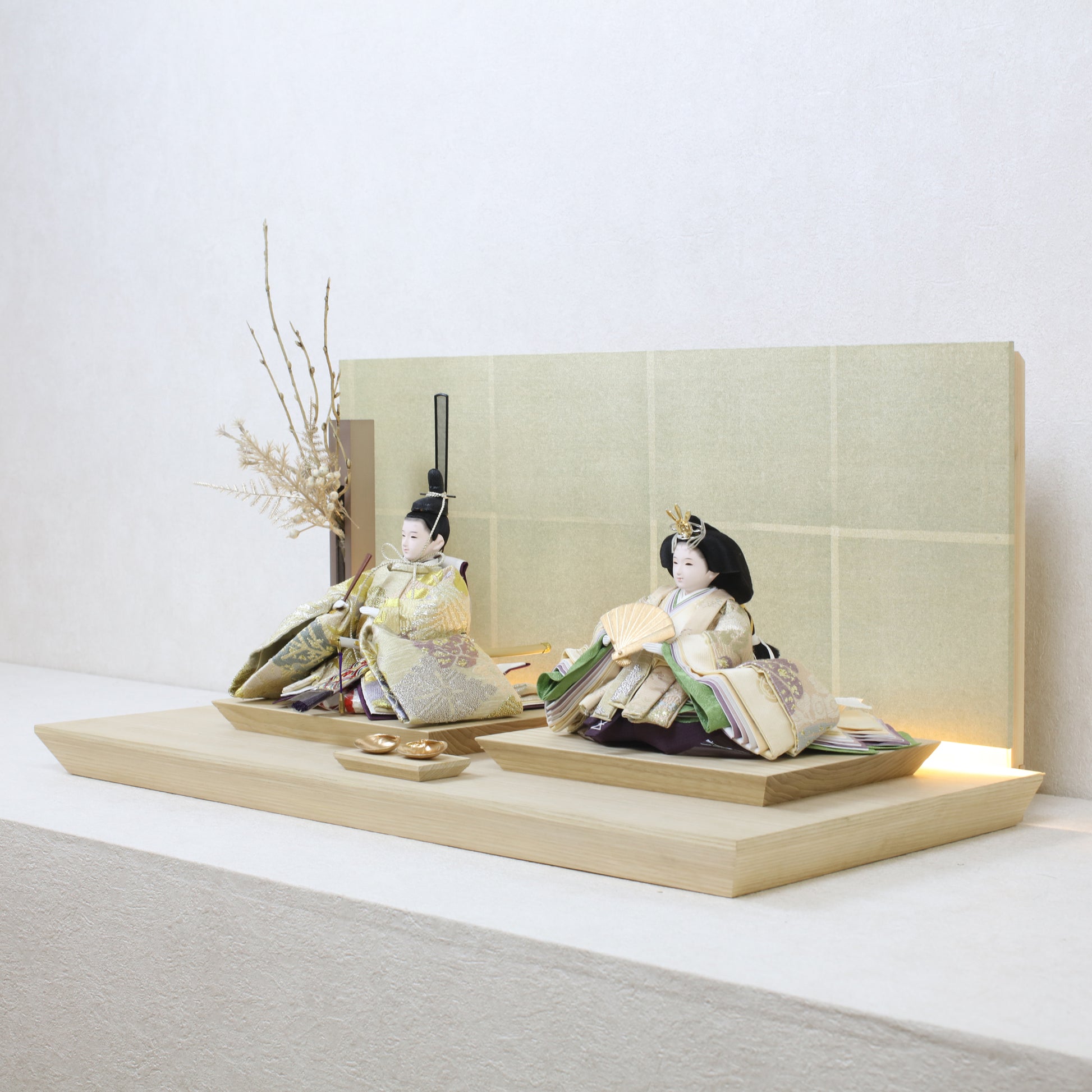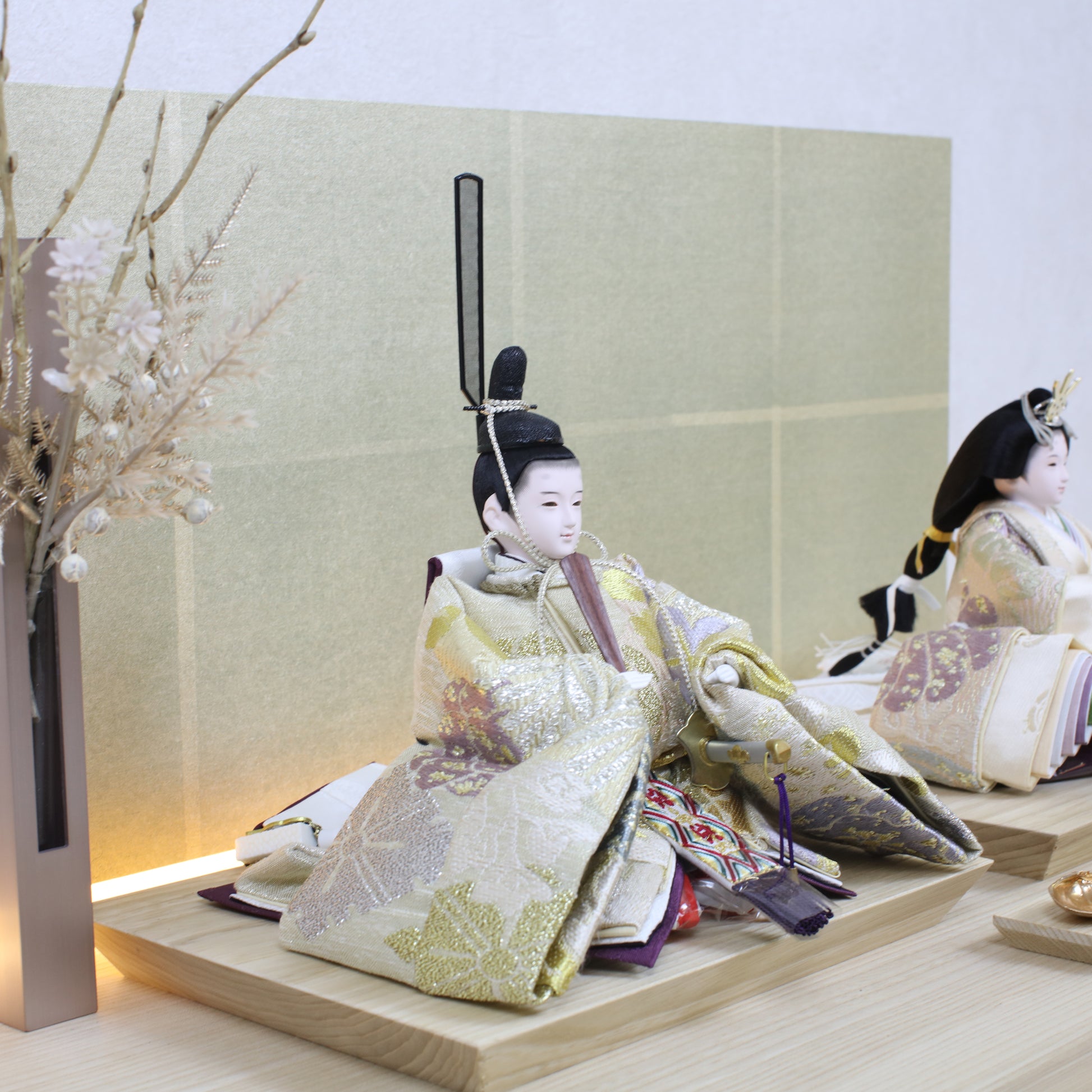 箔押しのお屏風は光を受けて輝き、お雛様の姿をそっと映し出します。
