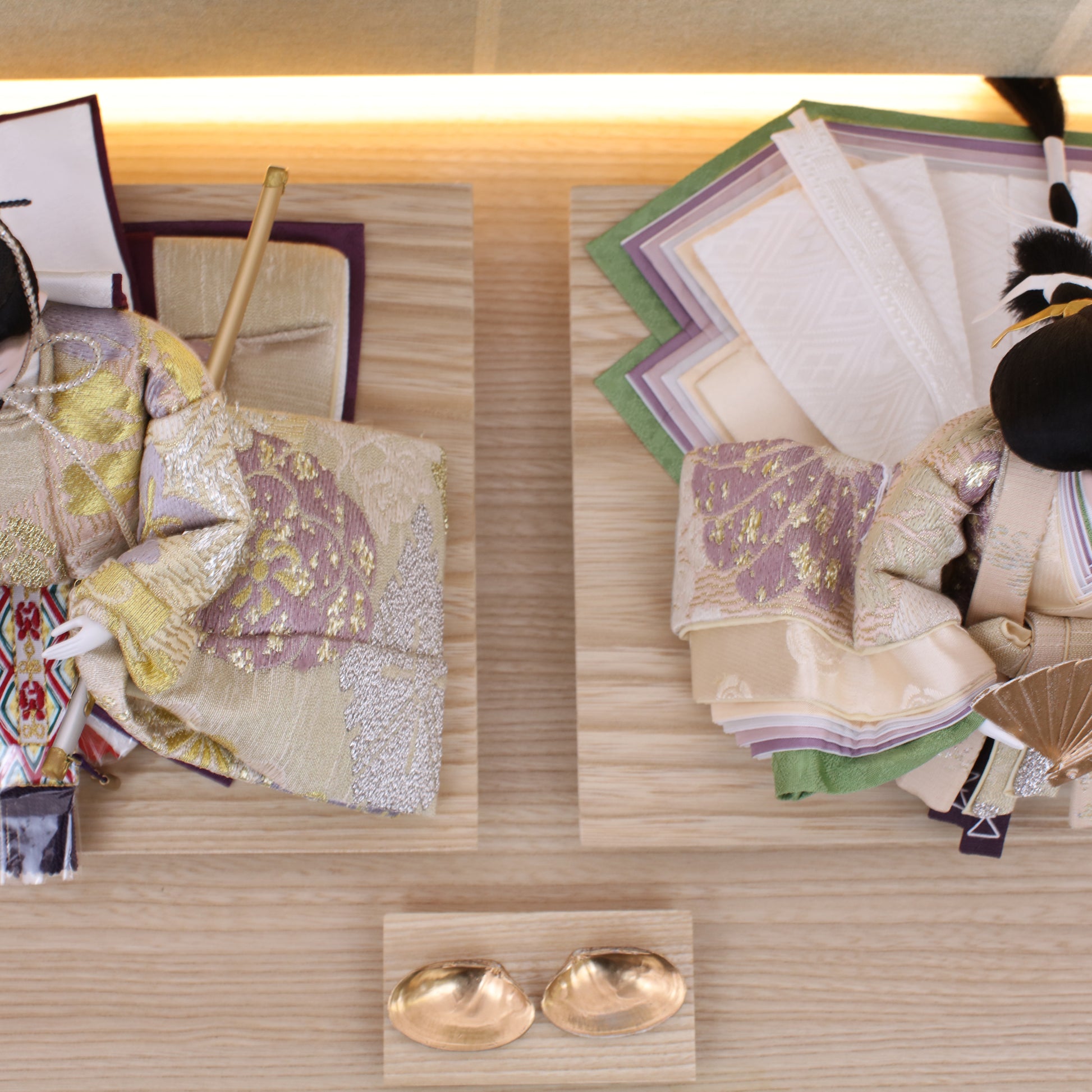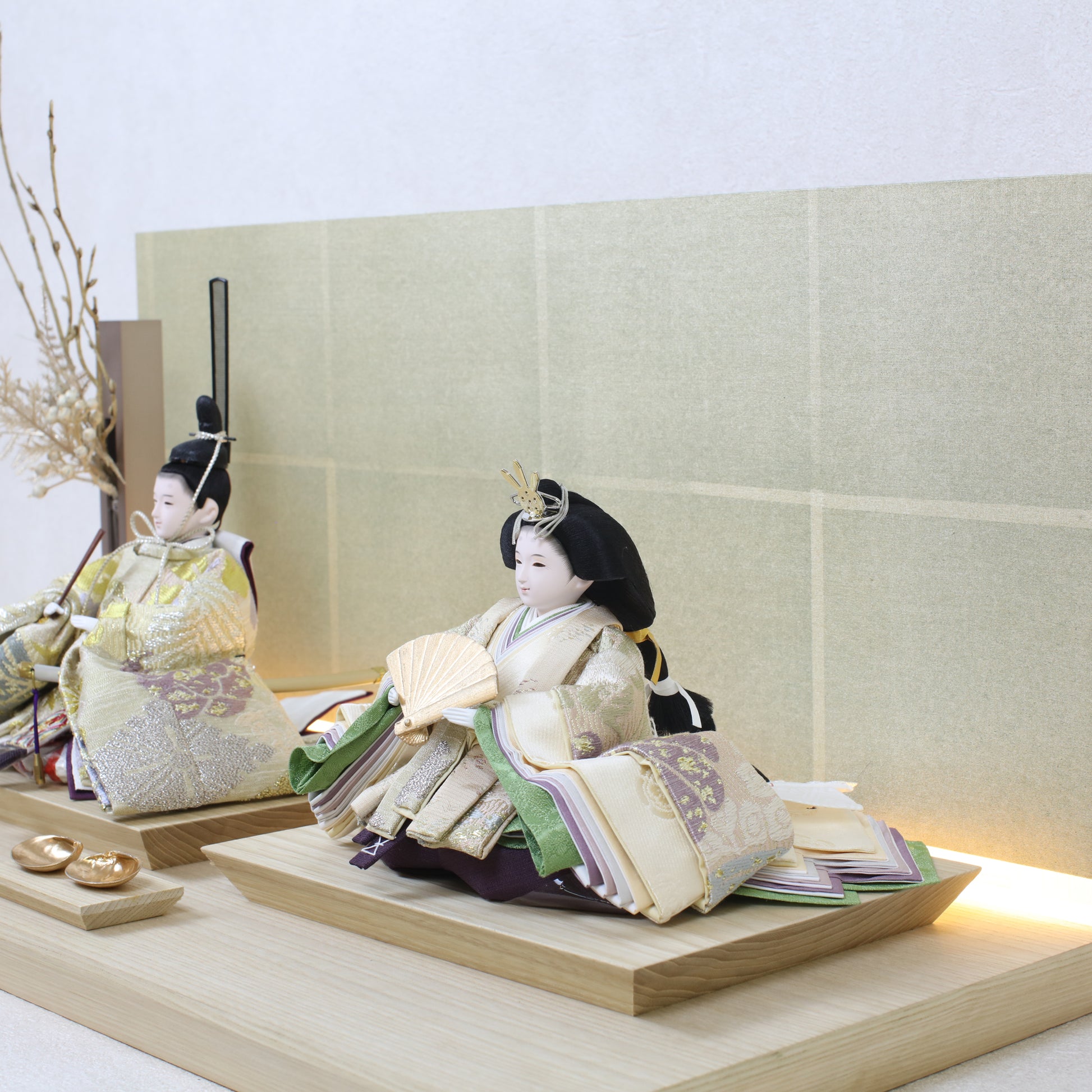 お屏風の下からは柔らかなライトがともり、実物と映る姿が重なって飾り全体がいっそう華やかで、美しい世界が生まれます。