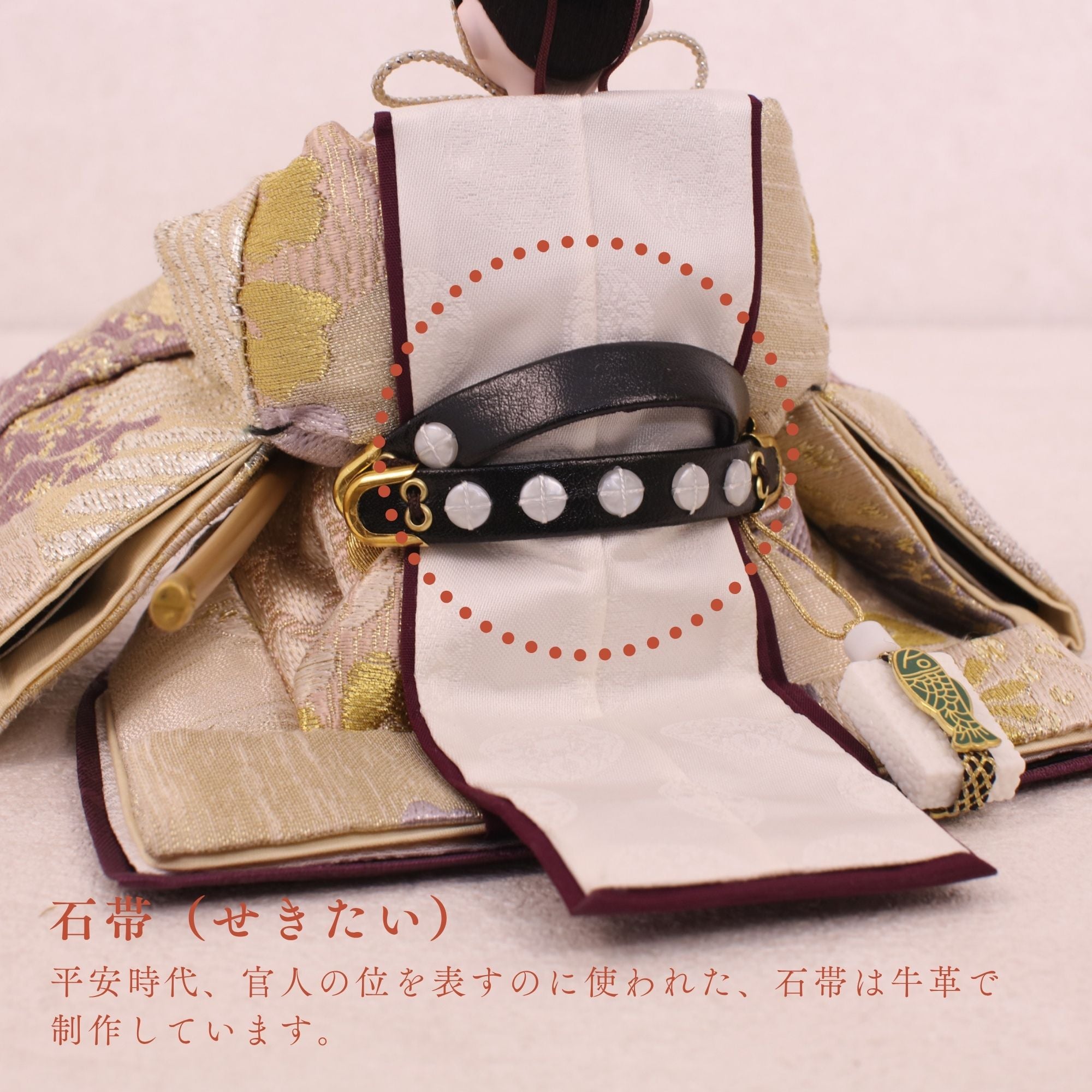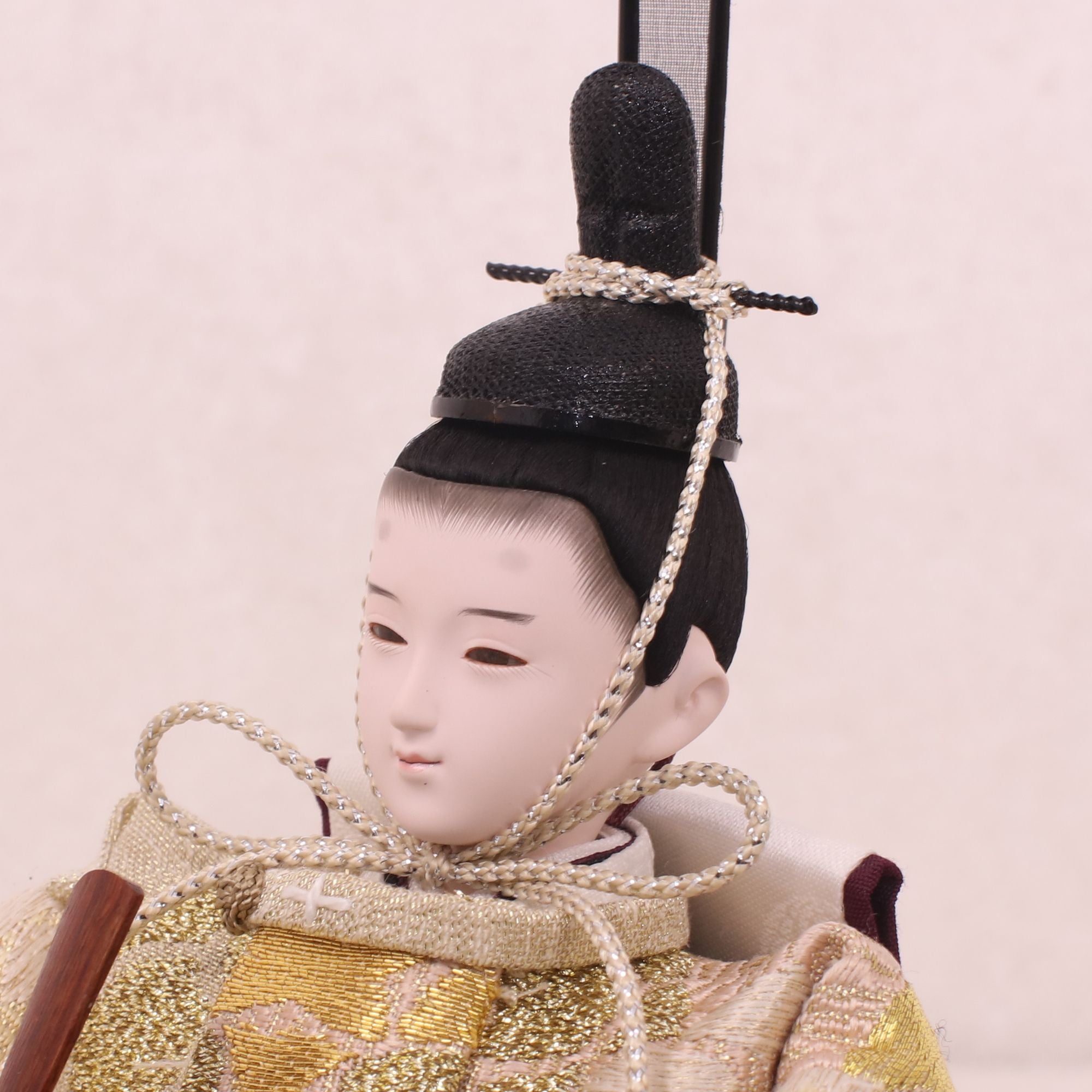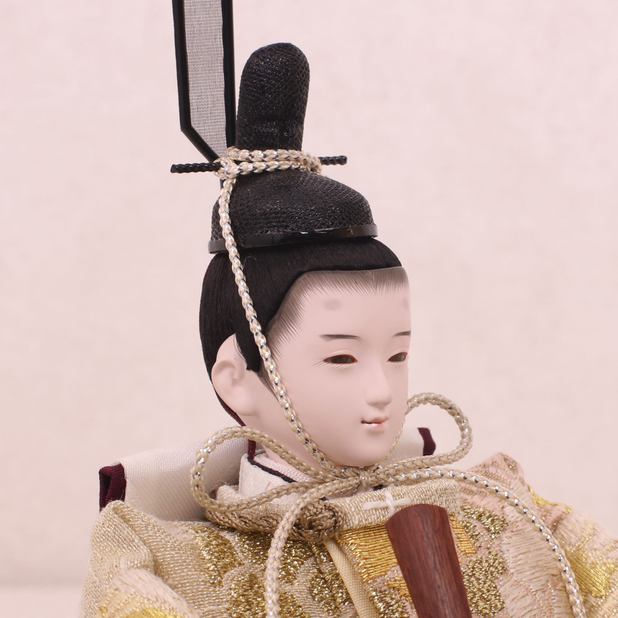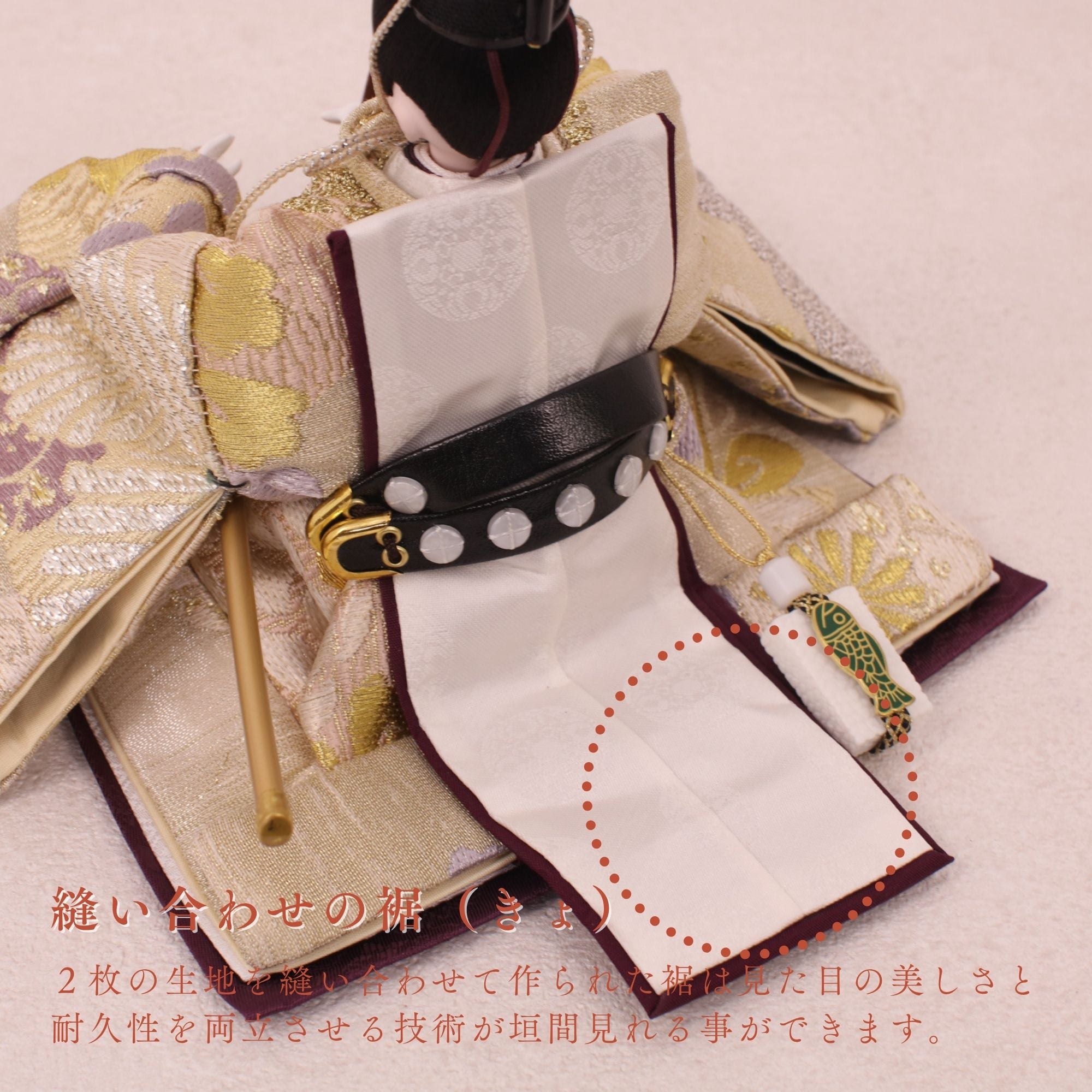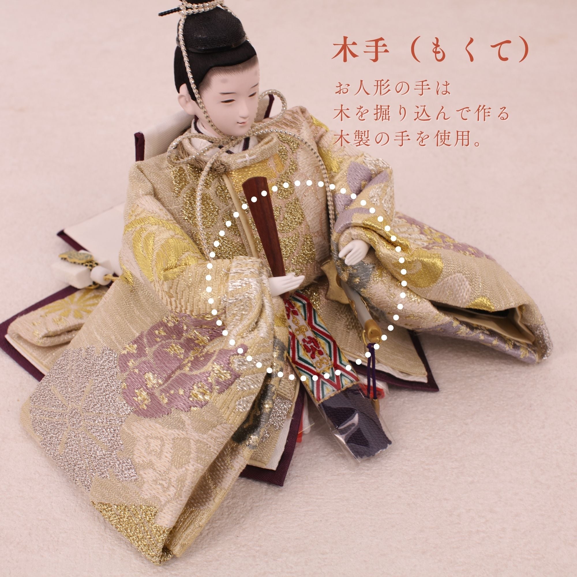 国産の分(せん)は、美しい木目と温もりある質感が魅力の天然木です。耐久性に優れ、経年とともに味わいを醸し出します。台座や屏風などに使用することで、自然素材ならではの落ち着いた風合いと上質感を演出し、雛人形全体をより品格ある印象に仕上げます。