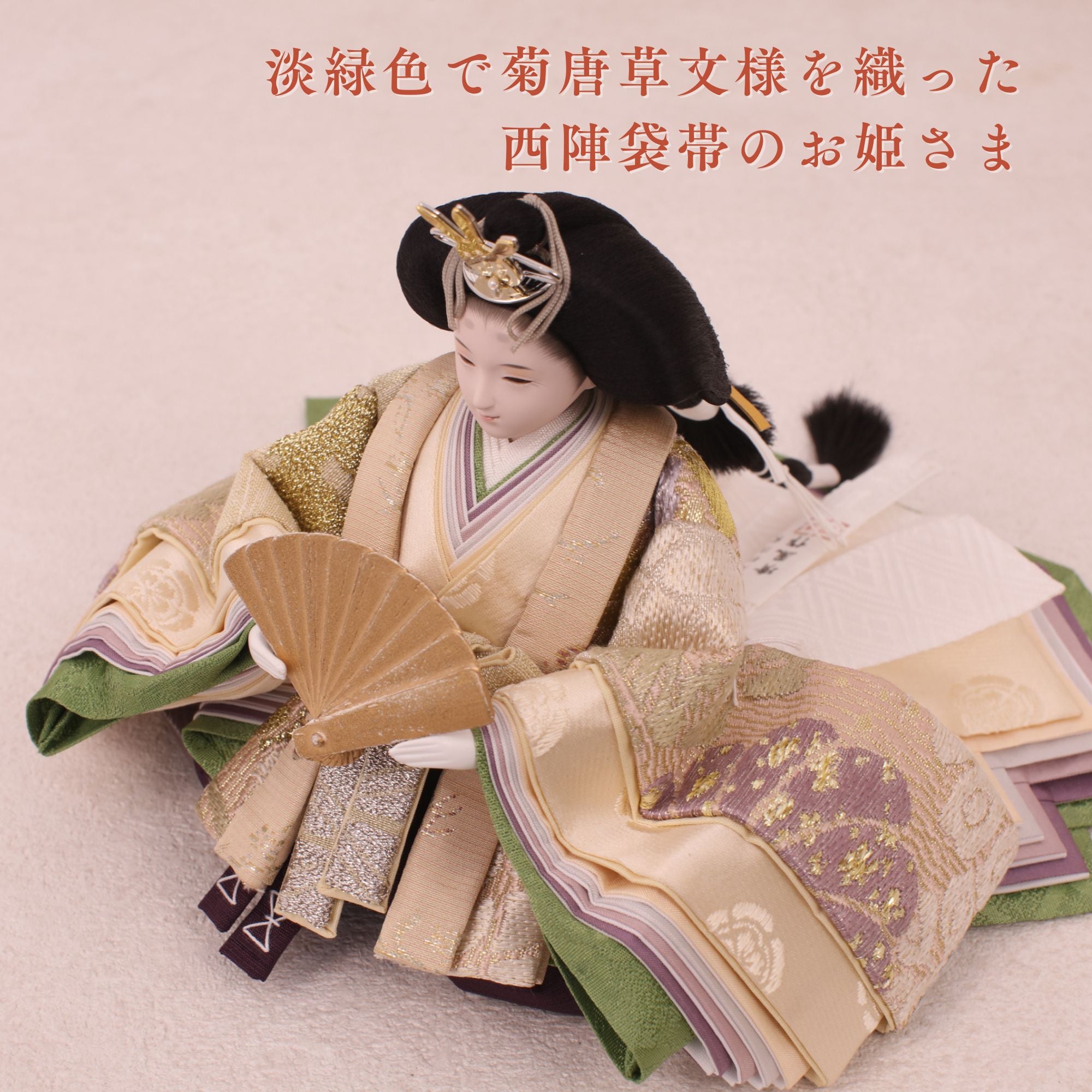 淡緑色で菊唐草文様を織った西陣袋帯のお姫さま