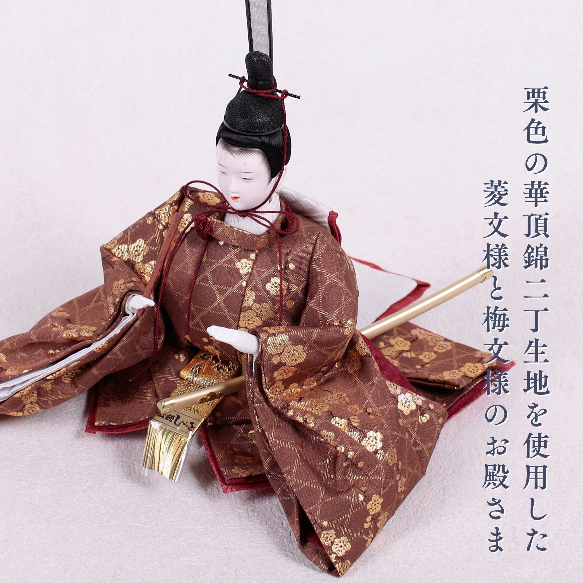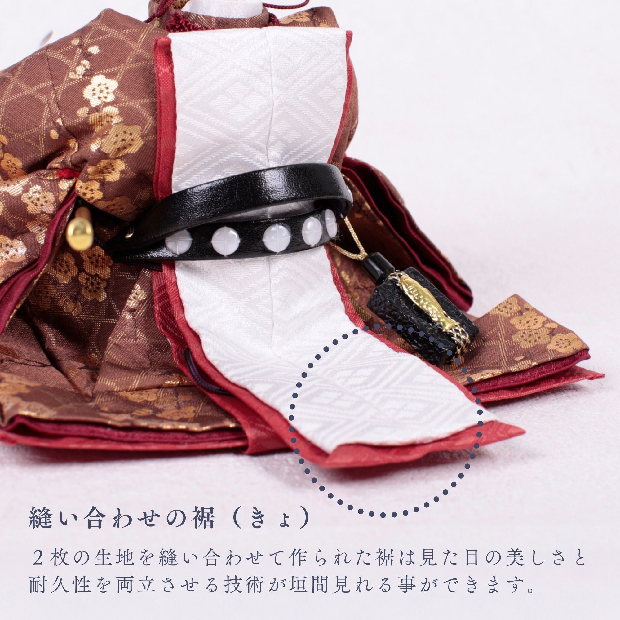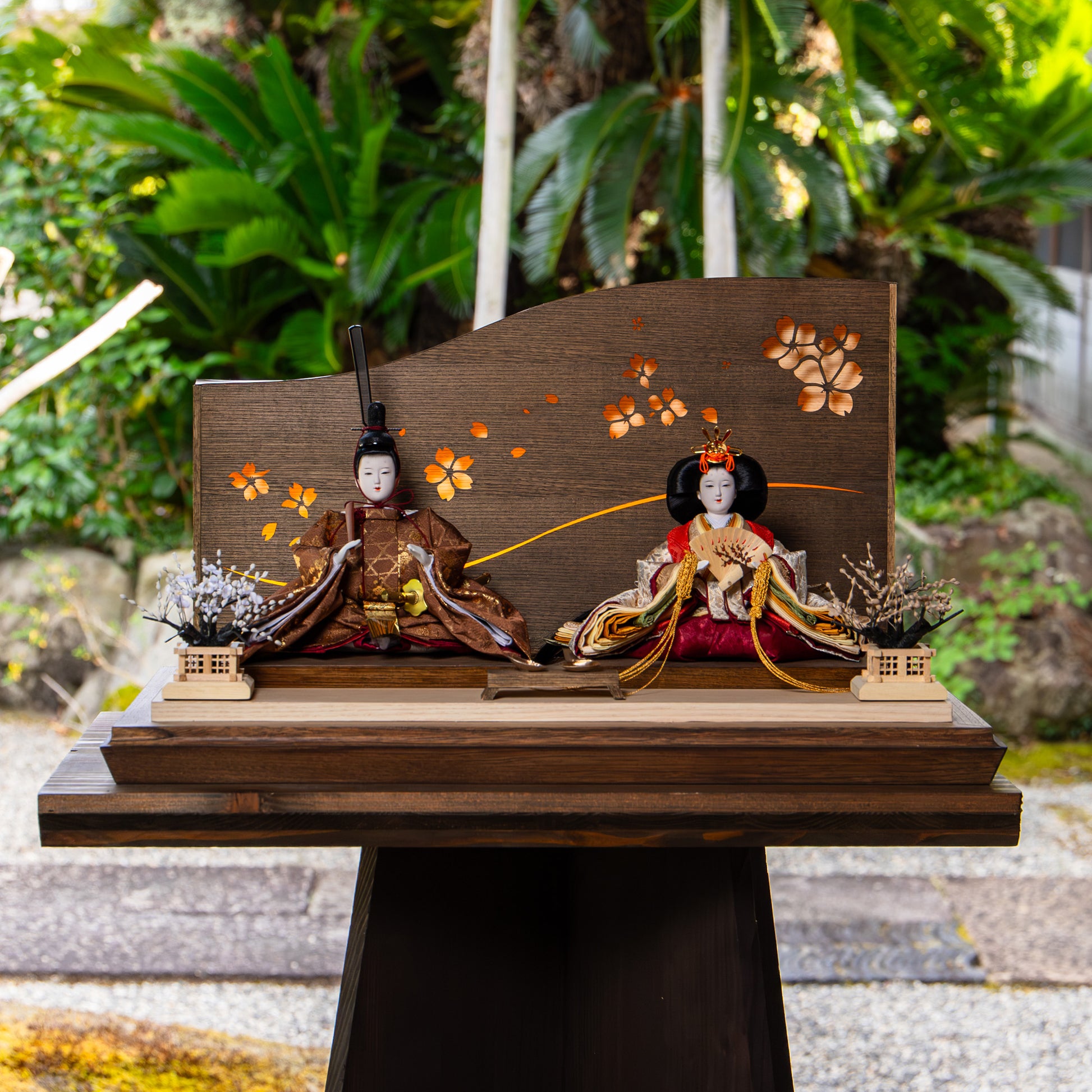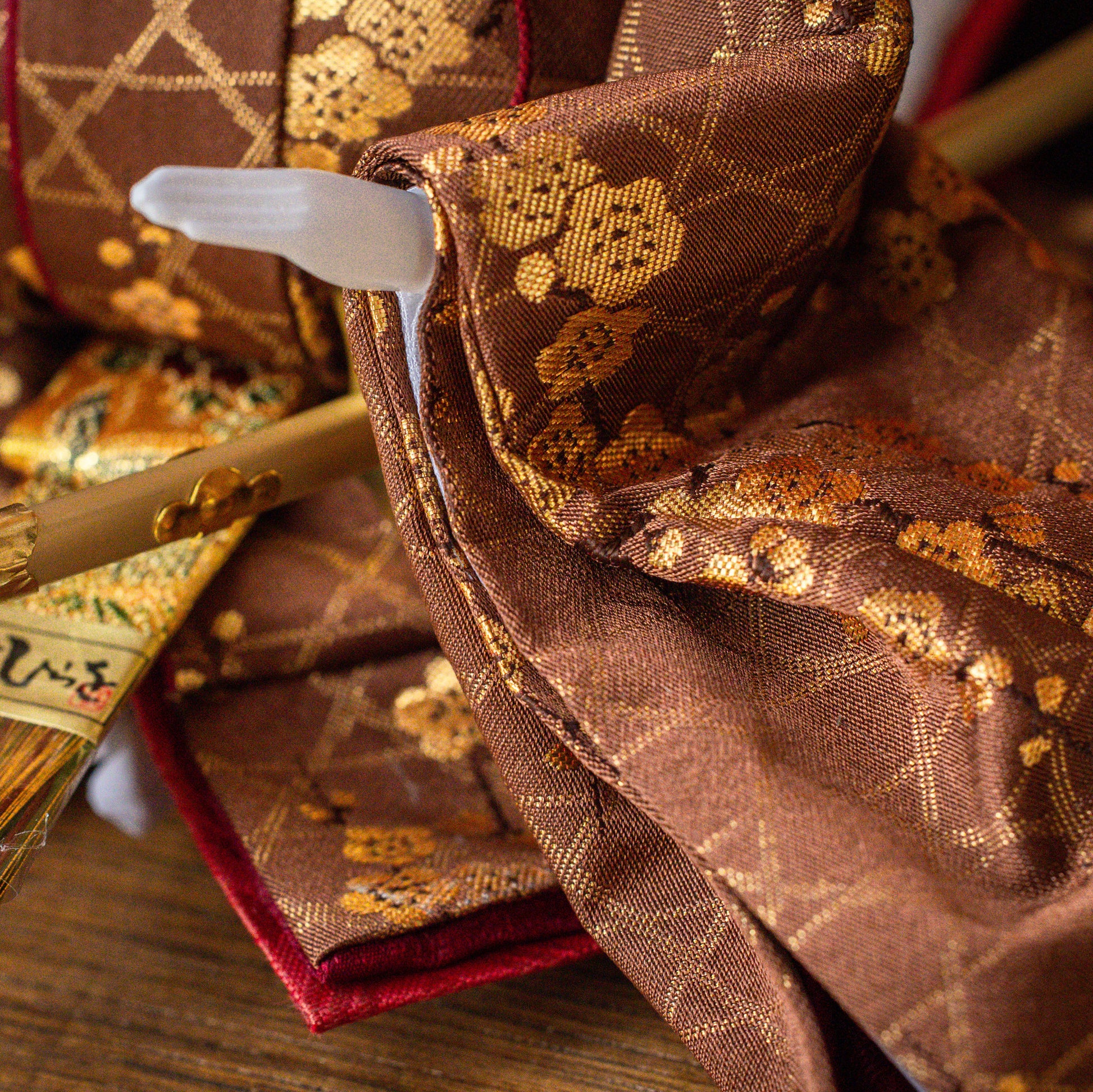殿は栗色華頂錦二丁に菱と梅文様を織り込み、江戸時代より堅実な成長と繁栄の象徴とされました。姫は砂金色と薄金色を組み合わせた西陣織に桜文様を施し、華やかで明るい未来への願いを込めています。