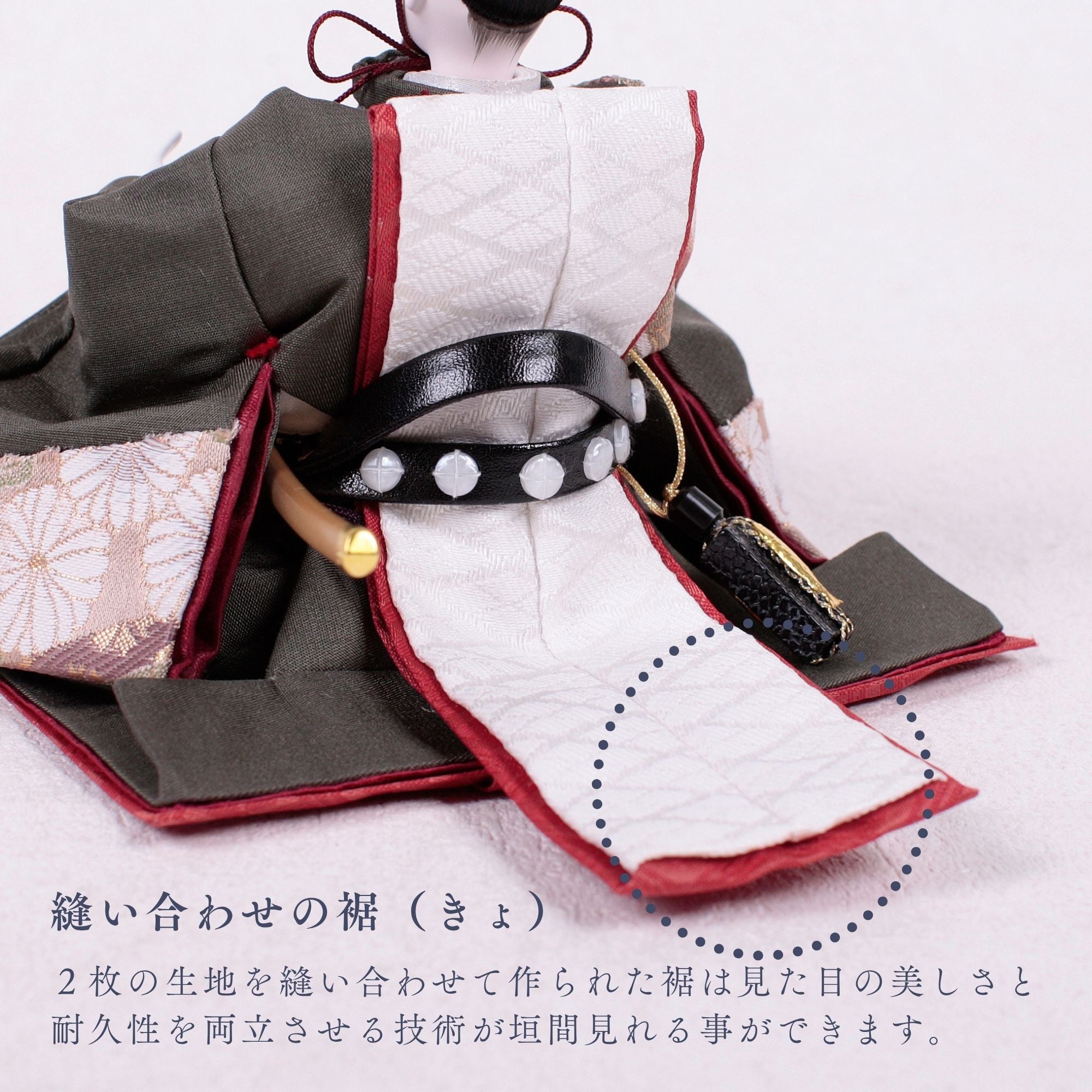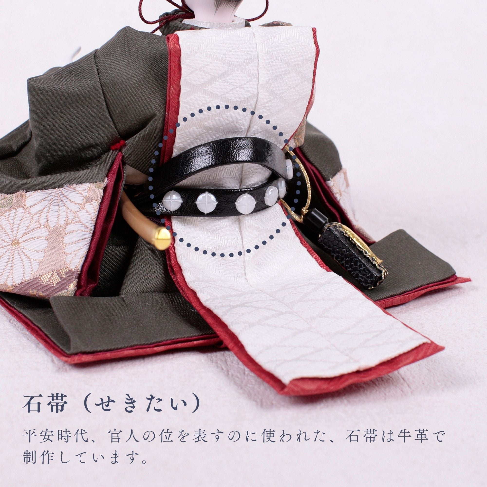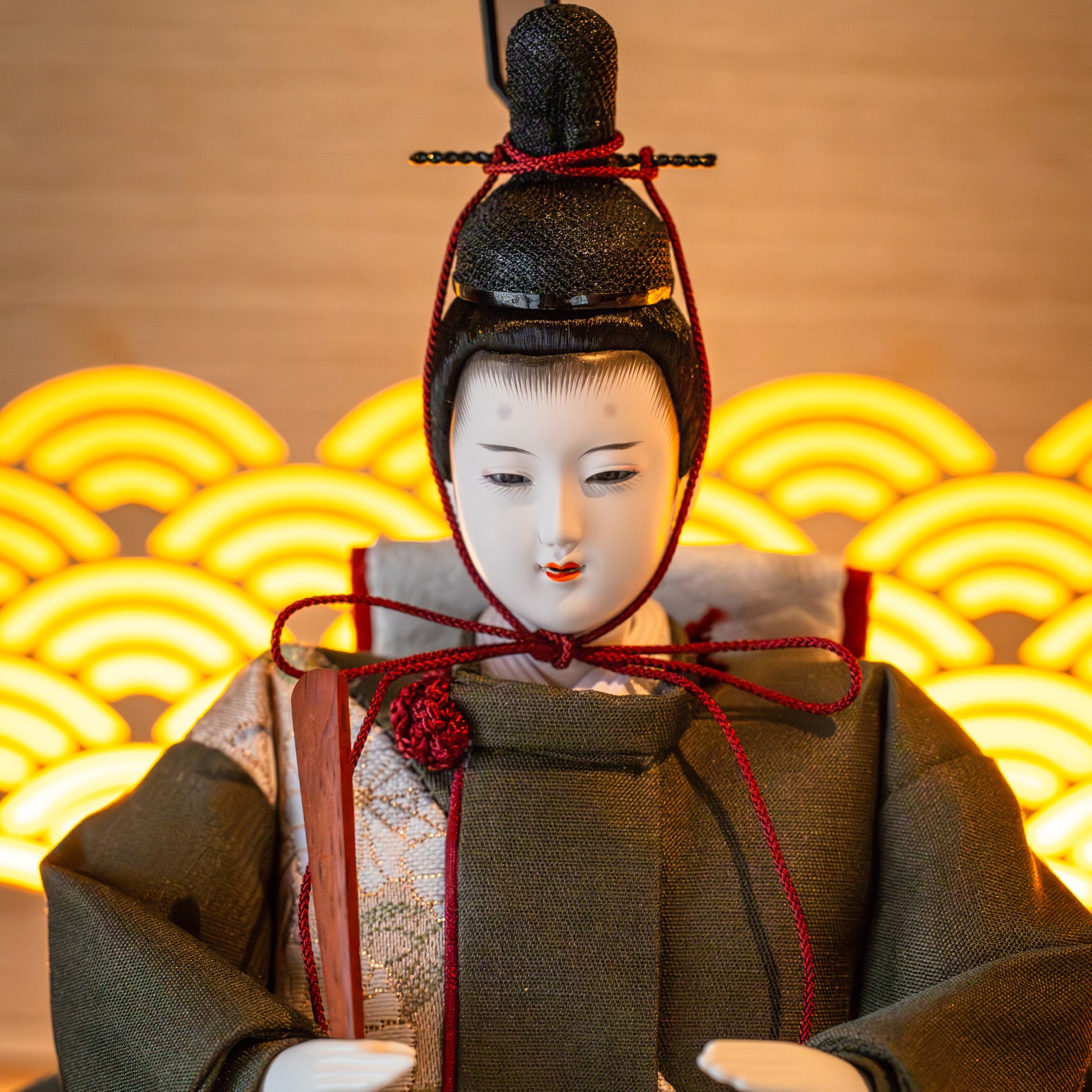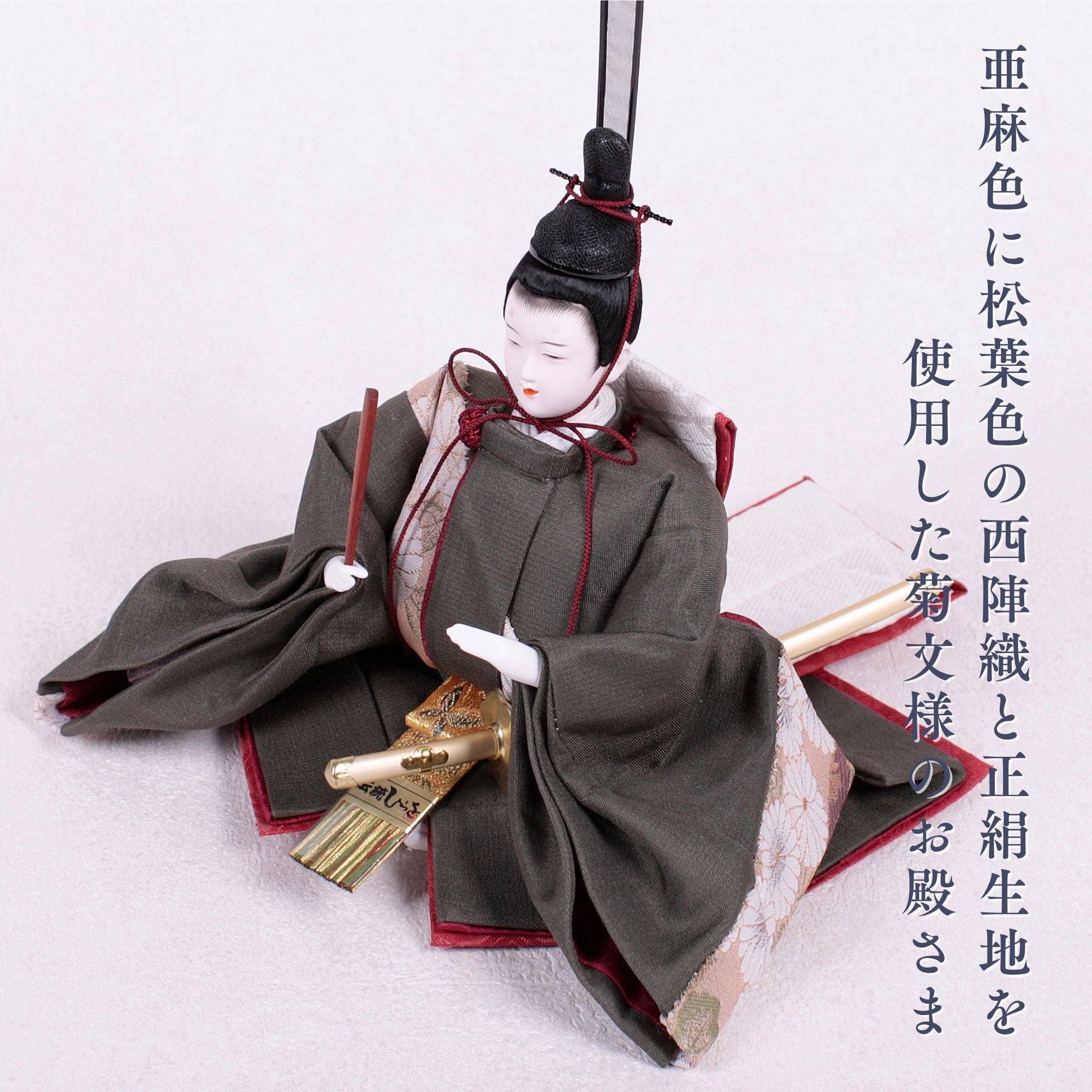 殿は亜麻色と松葉色の西陣織に菊文様をあしらい、平安時代より高貴さと長寿を象徴する菊で、子どもの安泰な成長を祈ります。姫も亜麻色西陣織に同じく菊文様を施し、穏やかで調和ある未来への願いを込めたお衣装です。