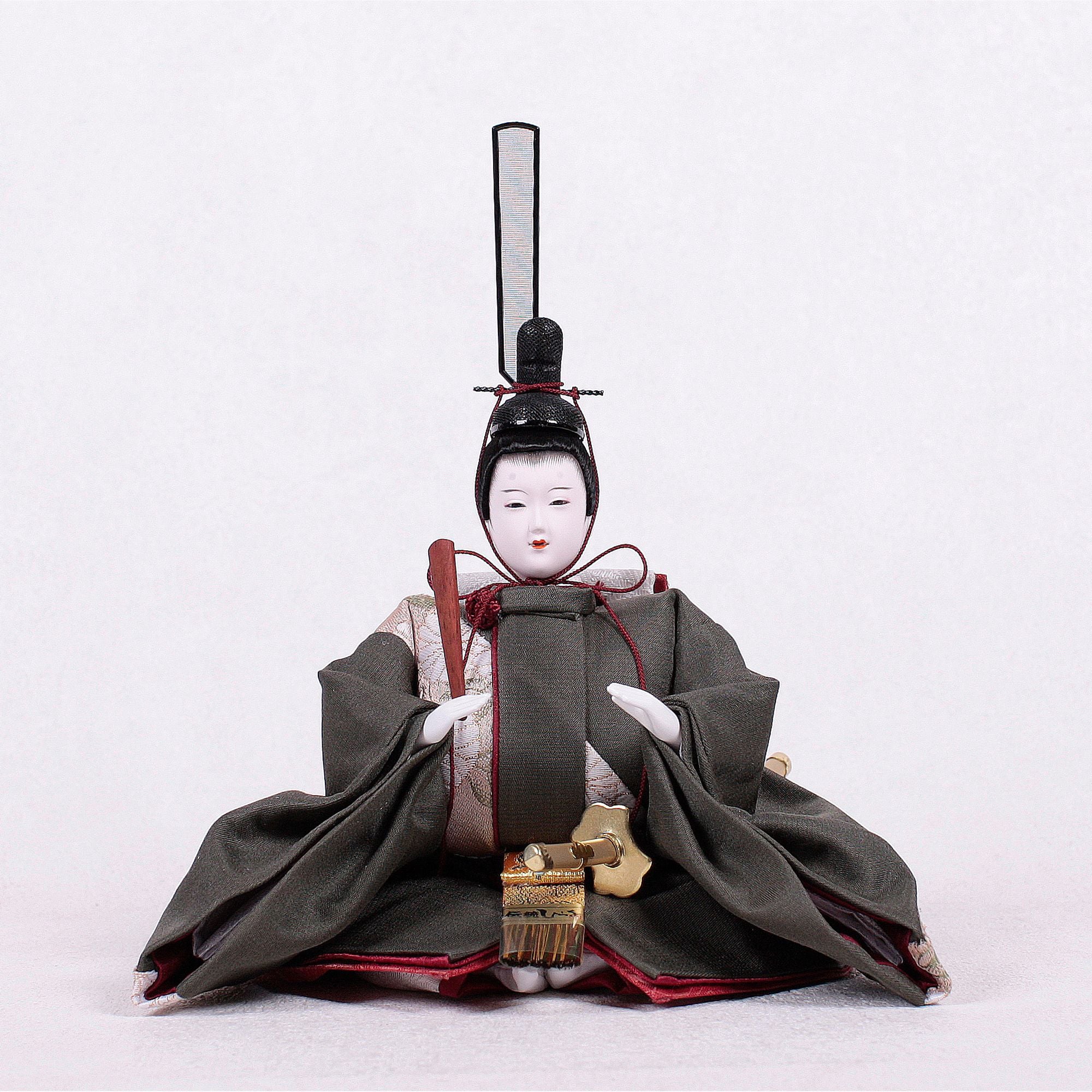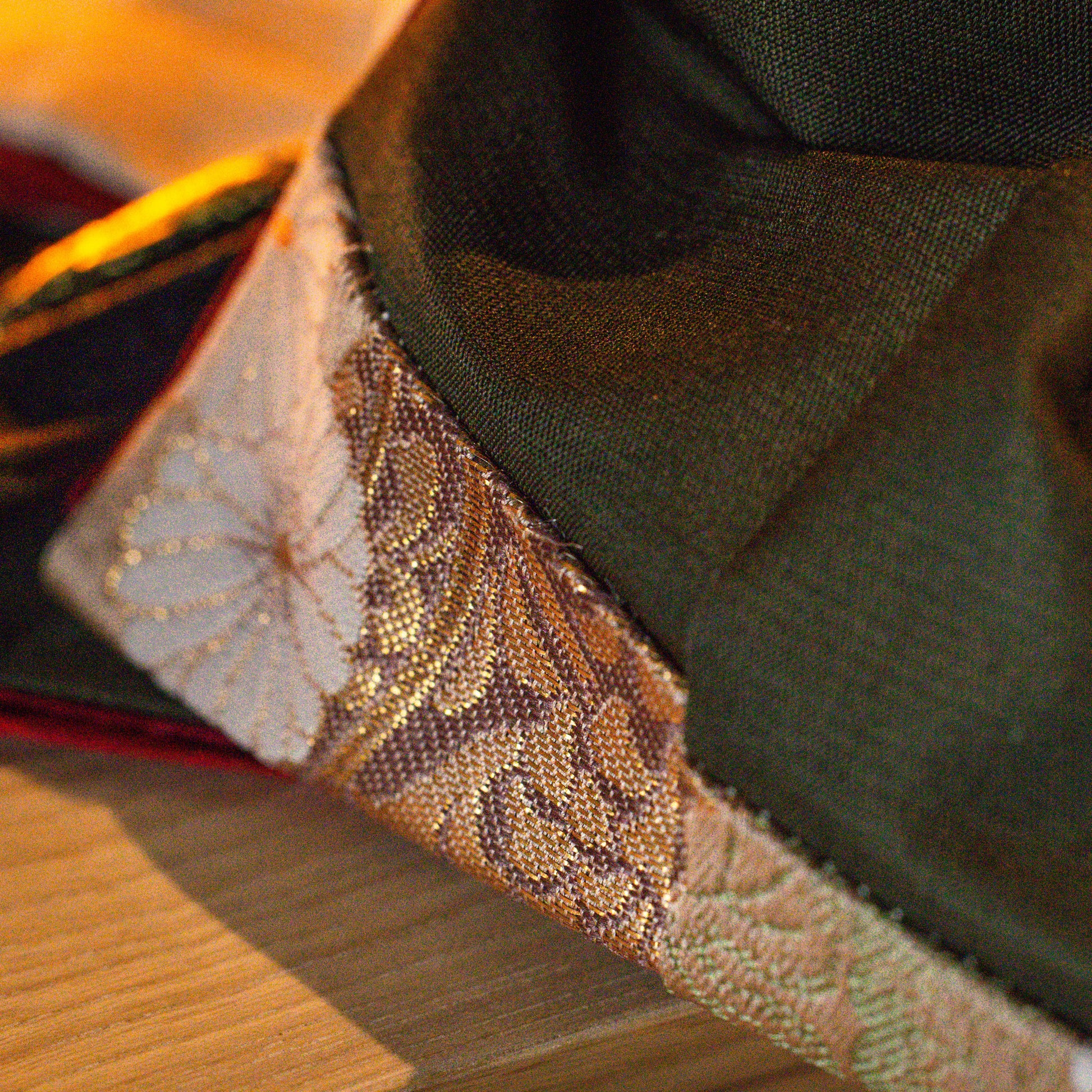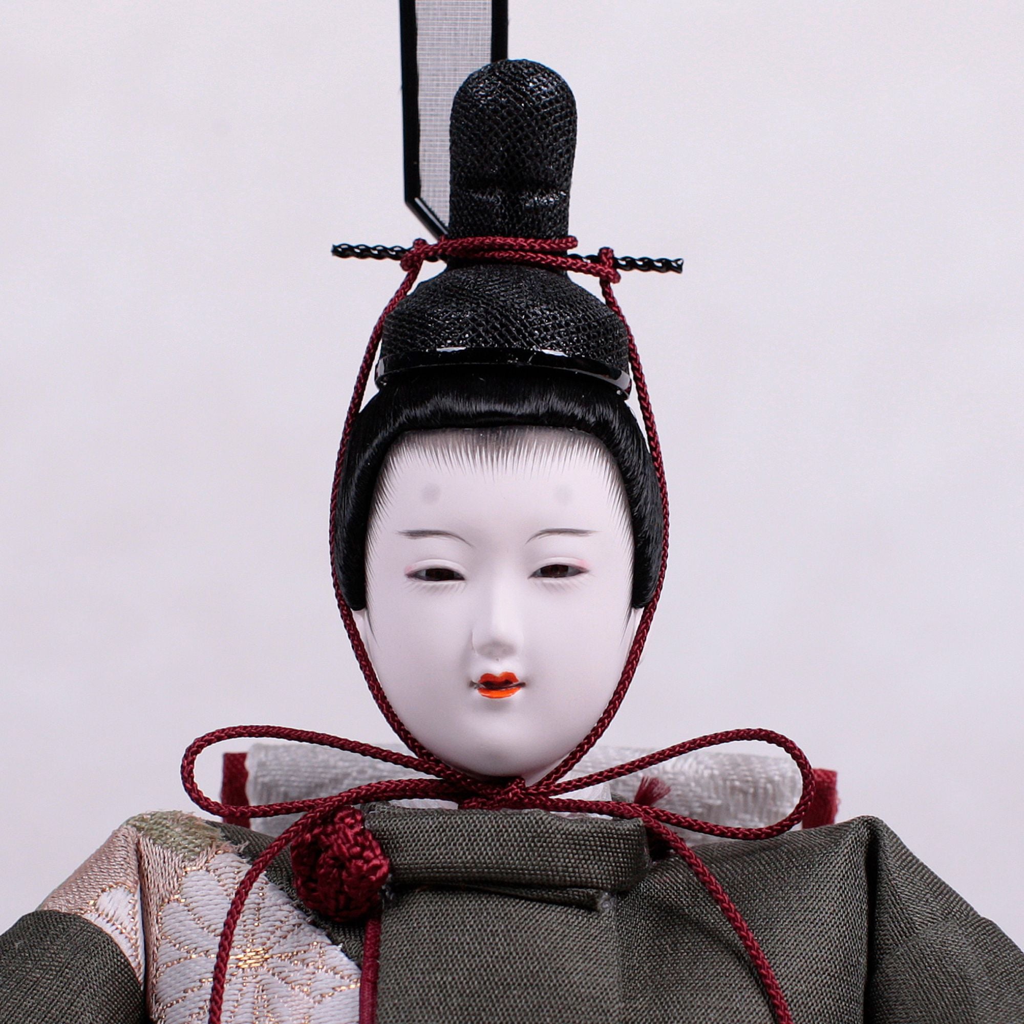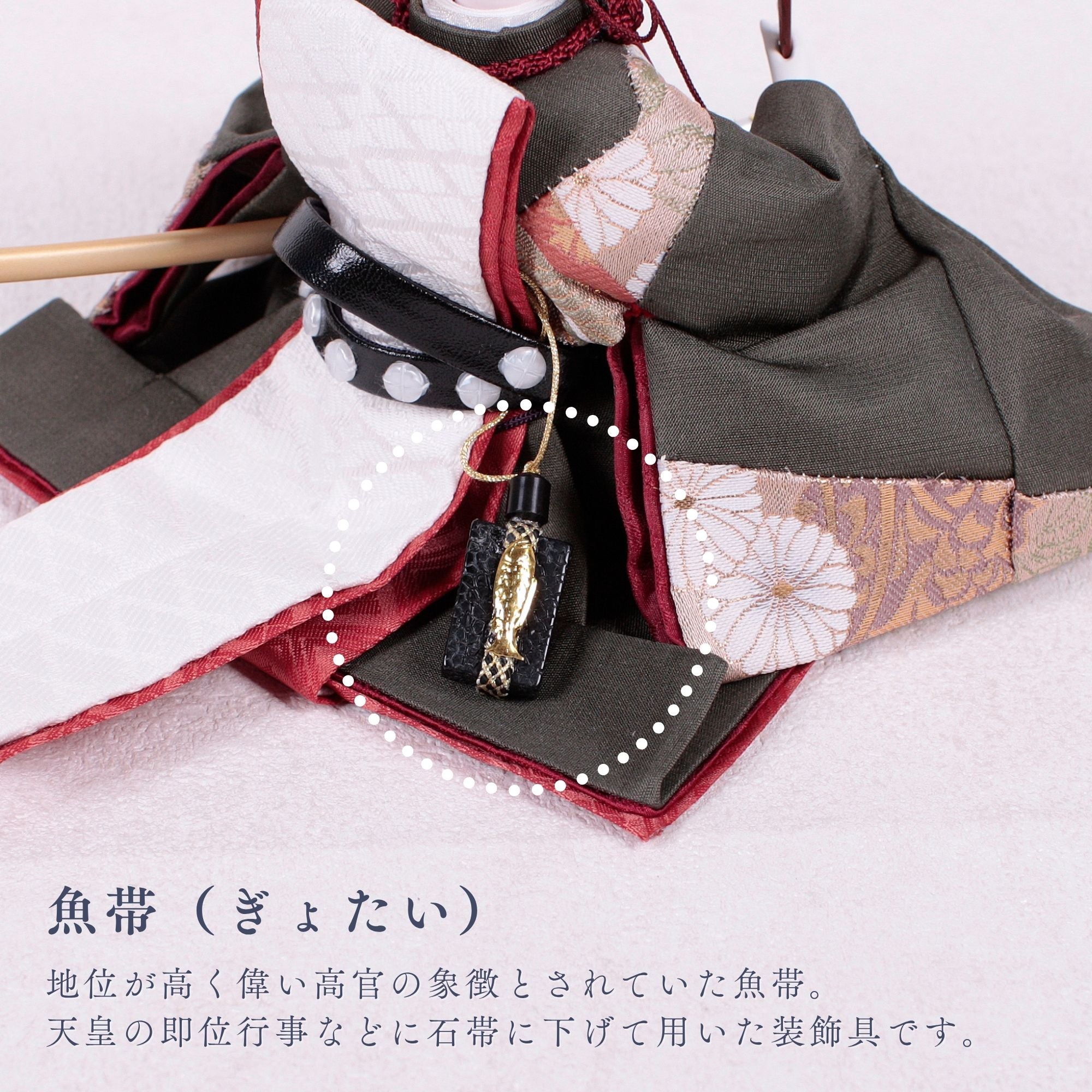 殿は亜麻色と松葉色の西陣織に菊文様をあしらい、平安時代より高貴さと長寿を象徴する菊で、子どもの安泰な成長を祈ります。姫も亜麻色西陣織に同じく菊文様を施し、穏やかで調和ある未来への願いを込めたお衣装です。