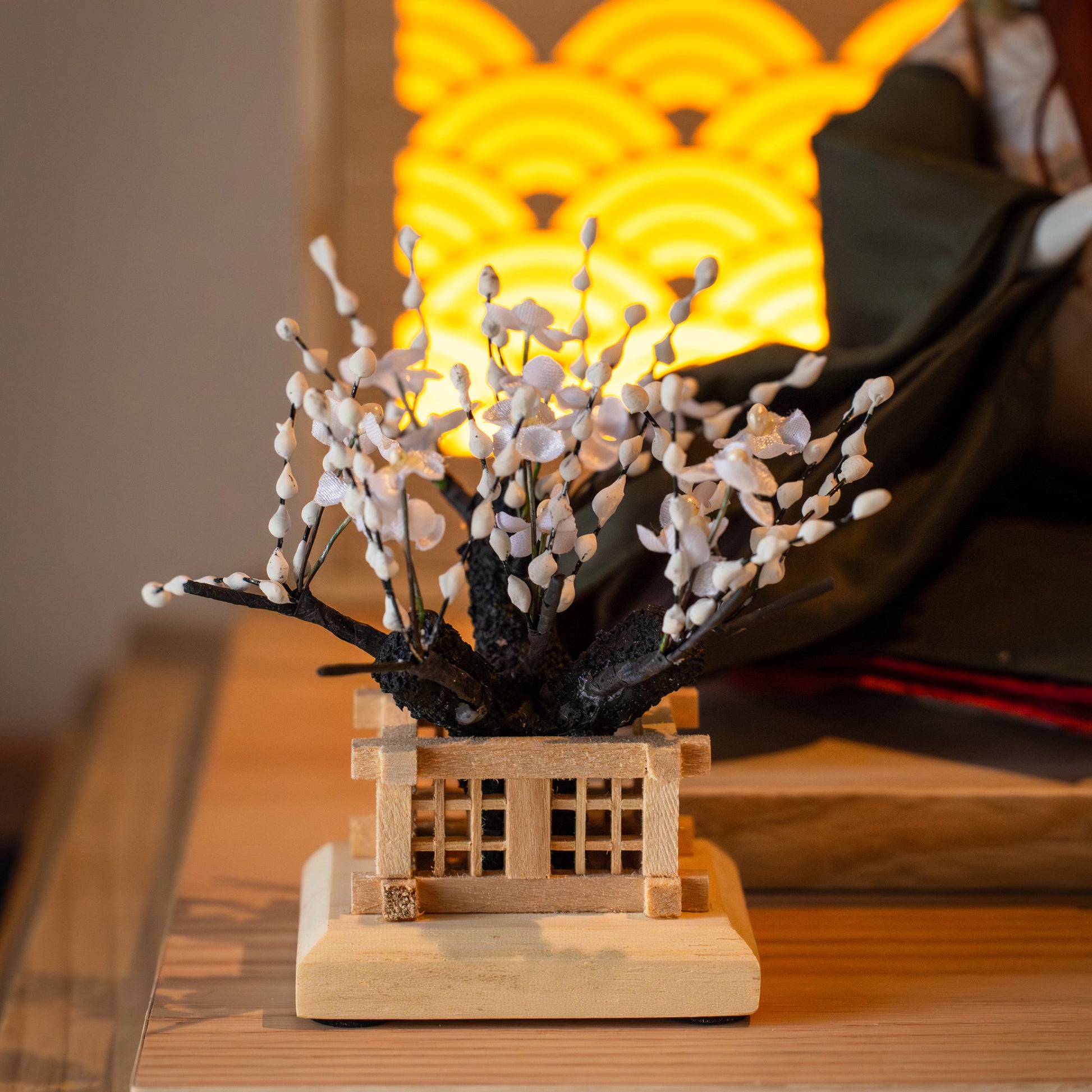 梅の花とつぼみを、一つひとつ丁寧に再現した飾りです。枝は繊細に形を整え、和紙を巻いて塗装することで、本物の梅木のような自然な質感を表現しています。