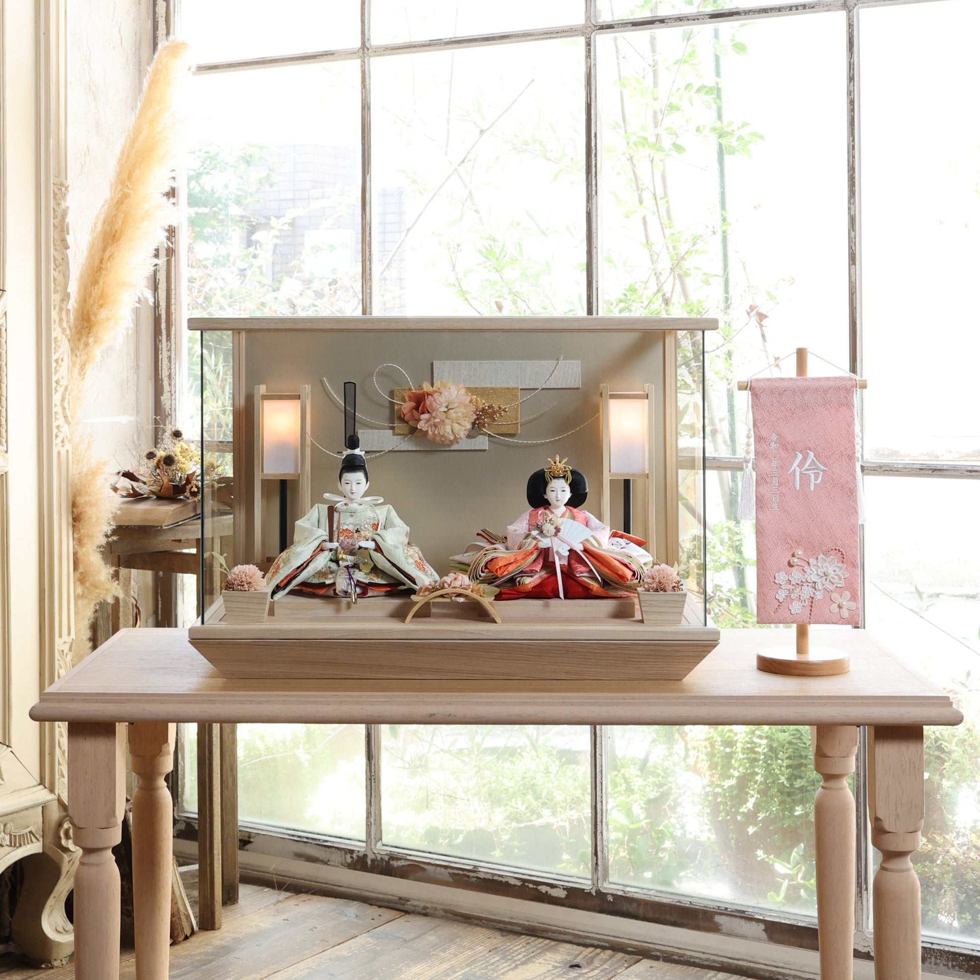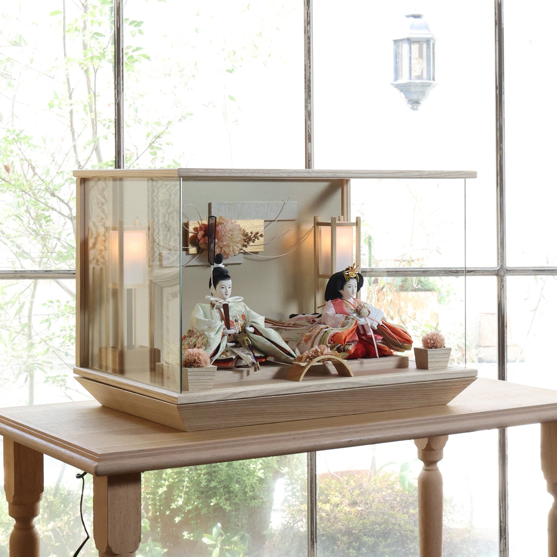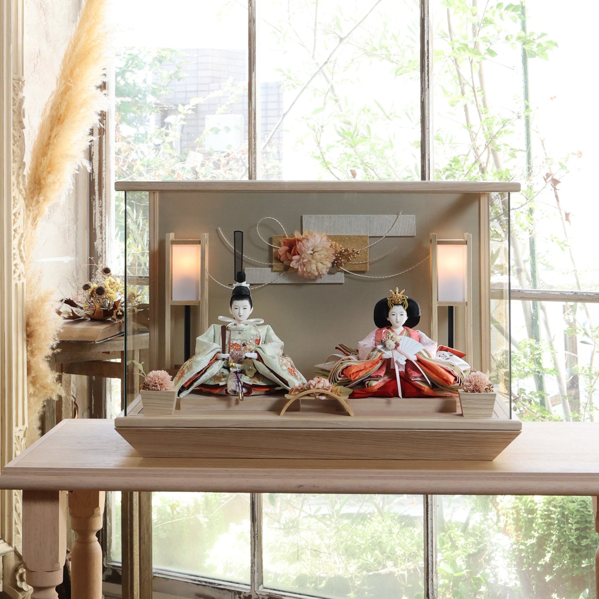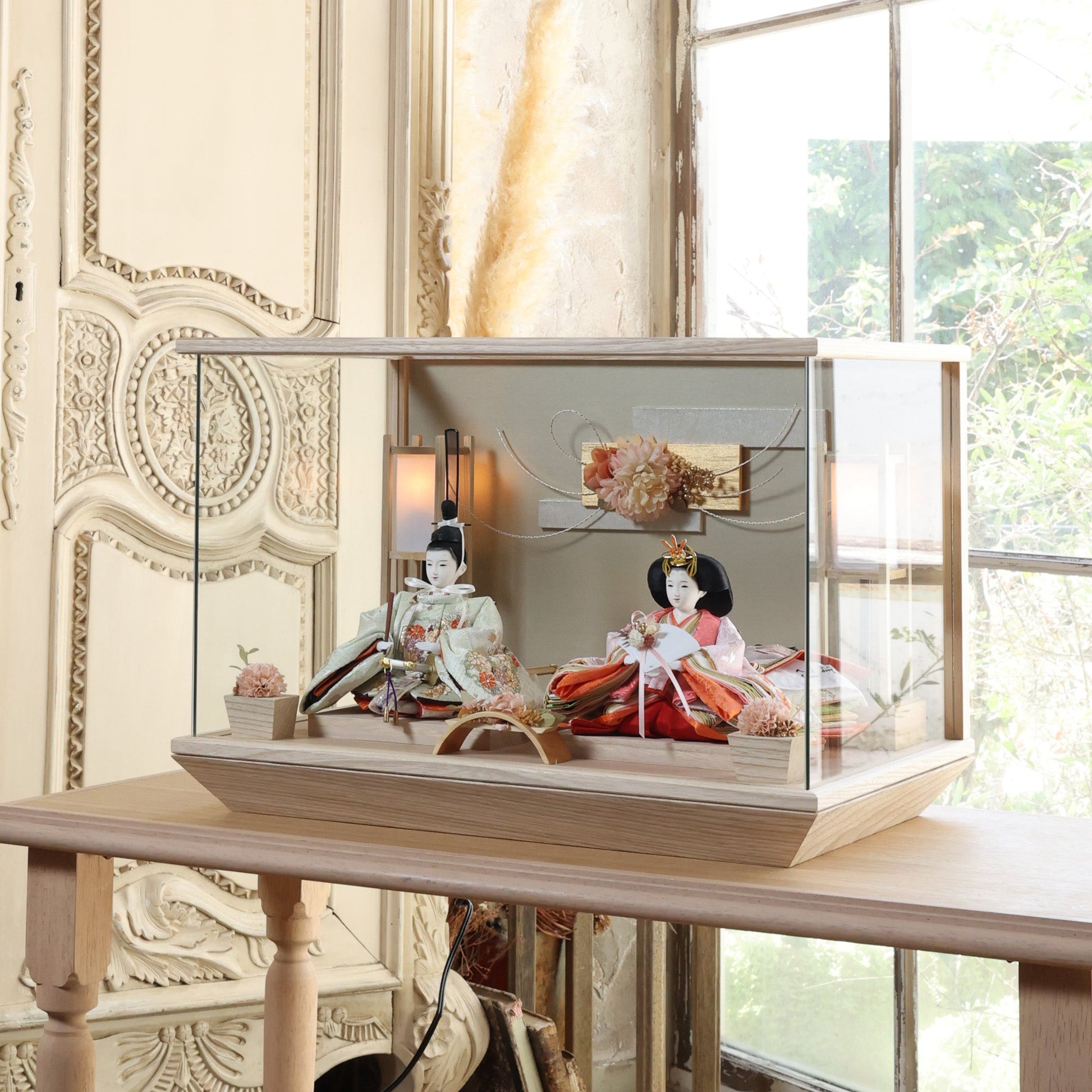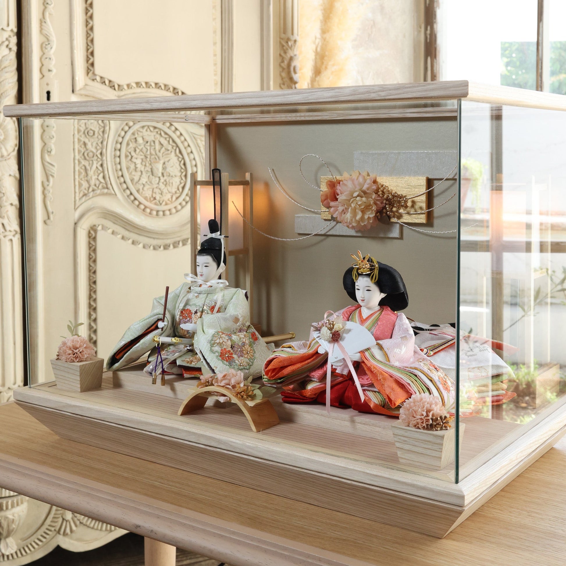 通常2mm厚が一般的な中、当店ではより高品質なAGC製3mmガラスを採用しています。厚みが増すことで強度と安全性が高まり、透明度の高いクリアな美しさを保ちます。大切な雛人形を守りながら、高級感のある見栄えを実現しています。