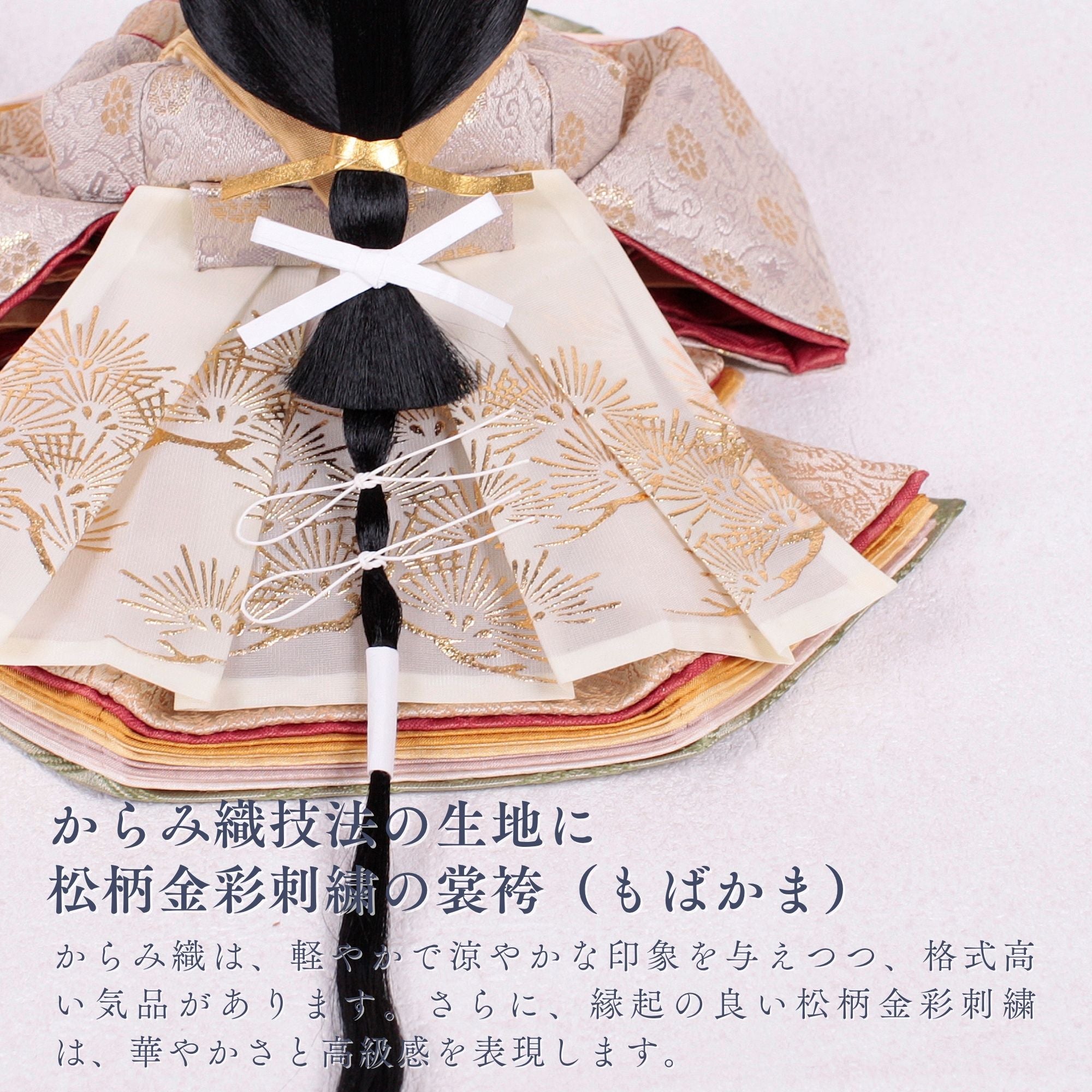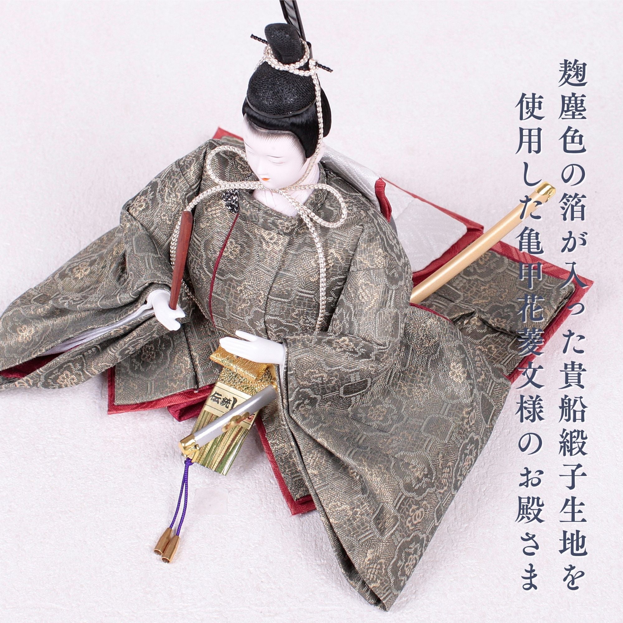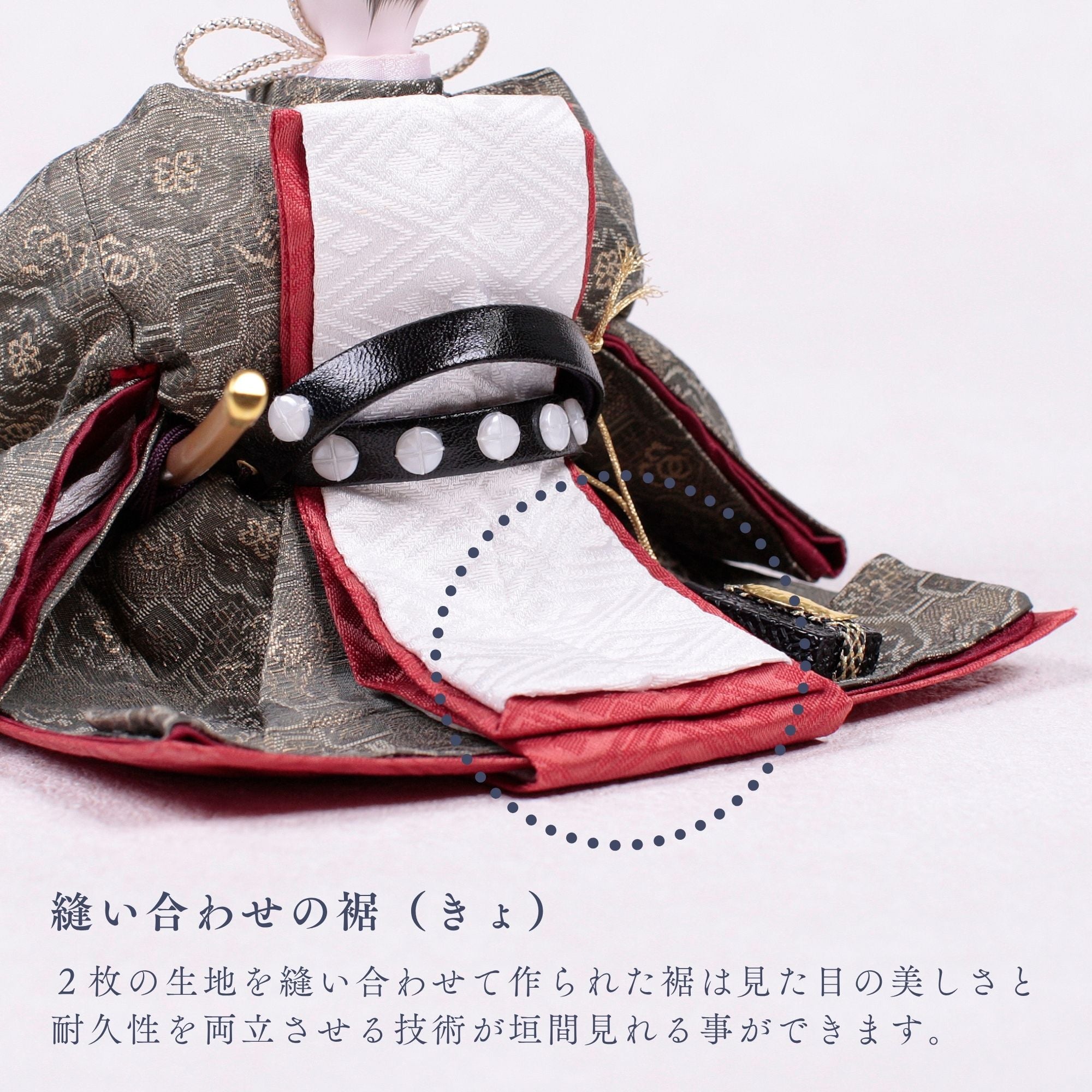 殿は麹塵色の貴船緞子に亀甲花菱文様を配し、江戸時代の公家や武家に好まれた格式ある文様で、長寿や安泰を祈ります。姫は絹鼠色の西陣織に菊唐草文様を施し、古来より子どもが健やかに育つことと華やかな未来を願うお衣装です。