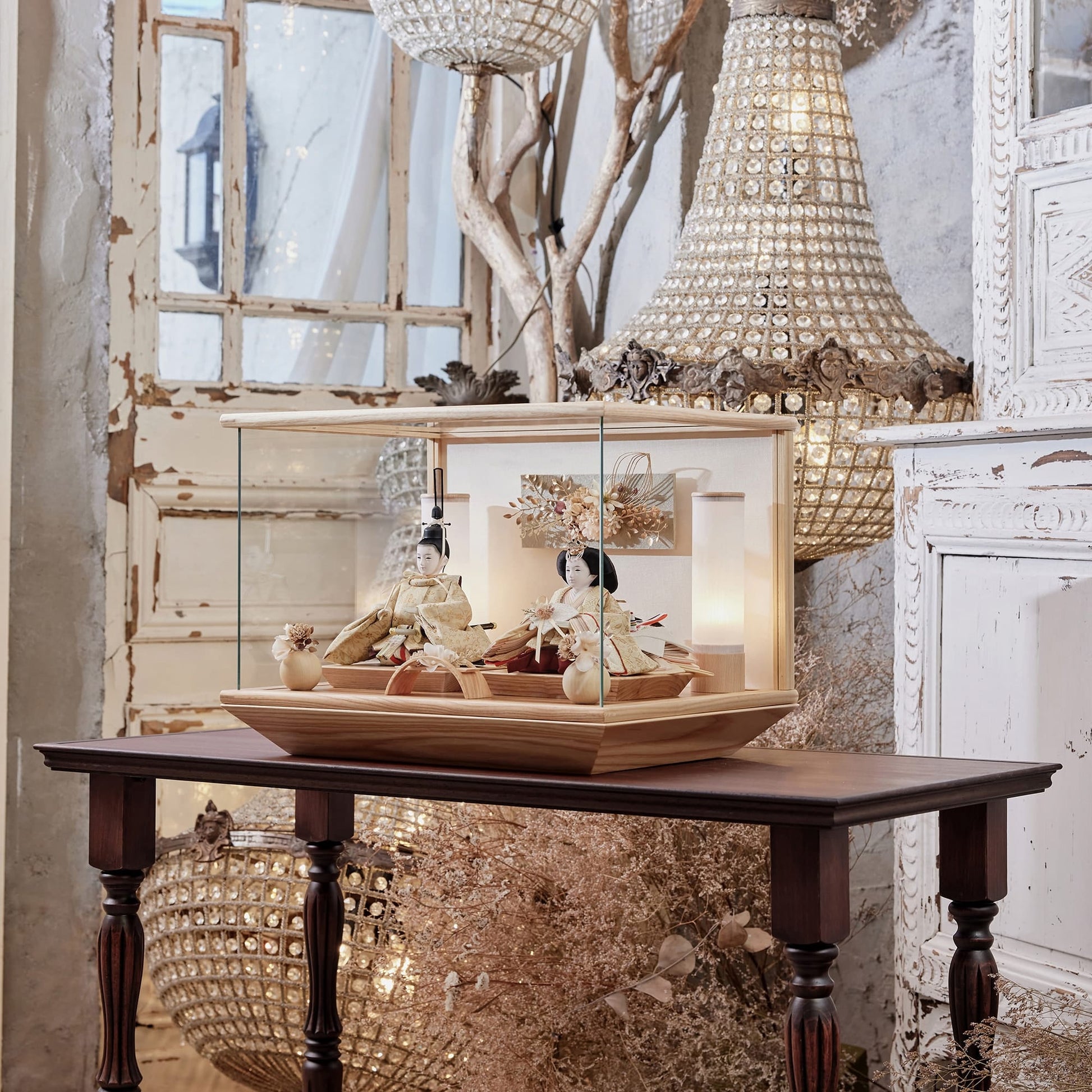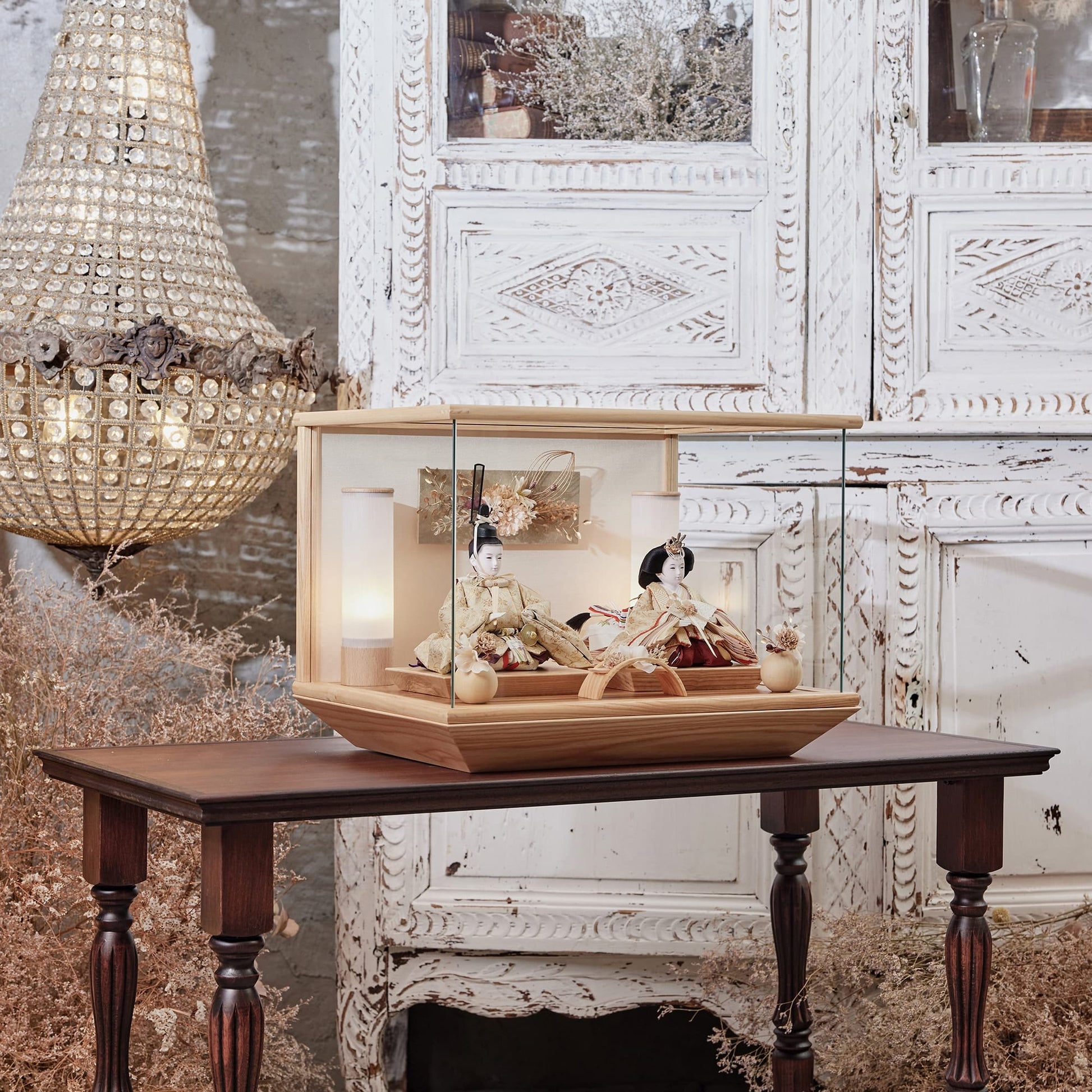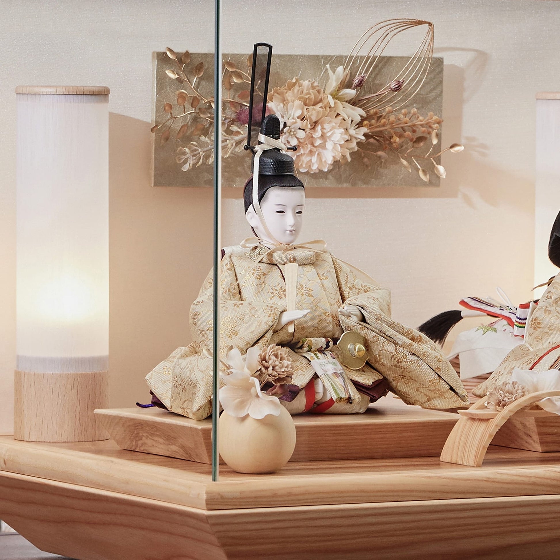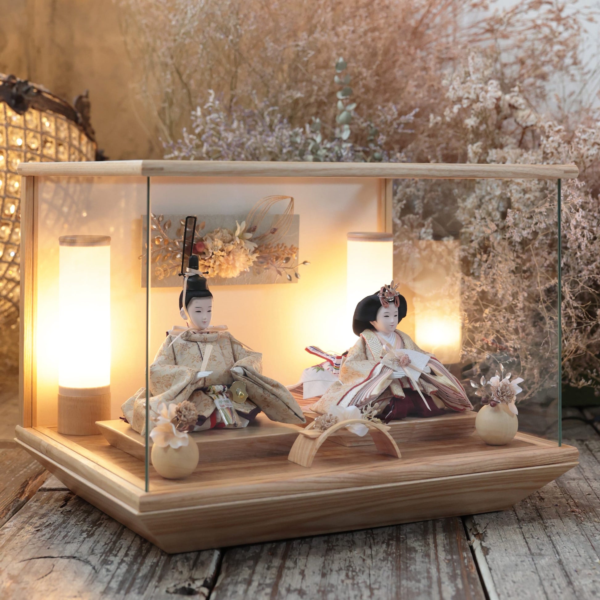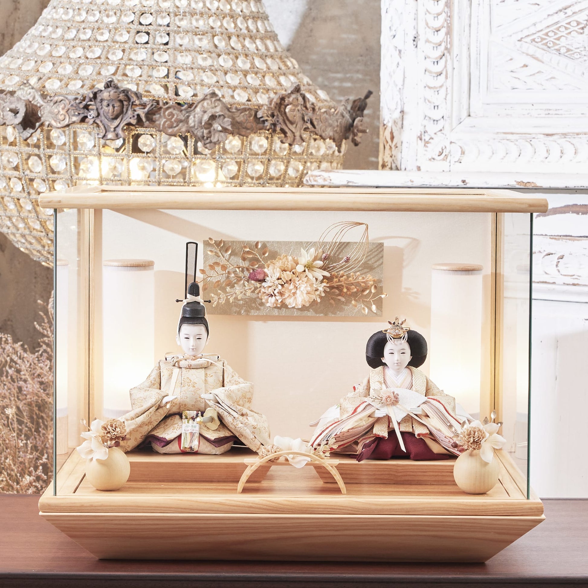 通常2mm厚が一般的な中、当店ではより高品質なAGC製3mmガラスを採用しています。厚みが増すことで強度と安全性が高まり、透明度の高いクリアな美しさを保ちます。大切な雛人形を守りながら、高級感のある見栄えを実現しています。