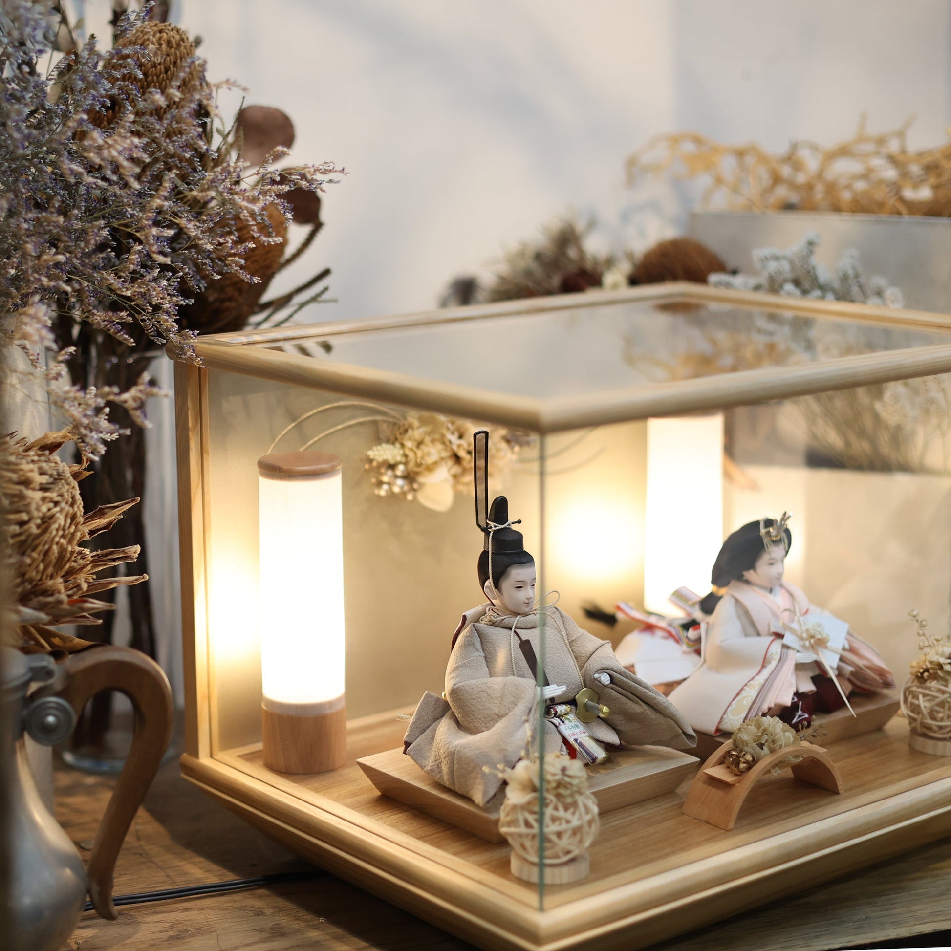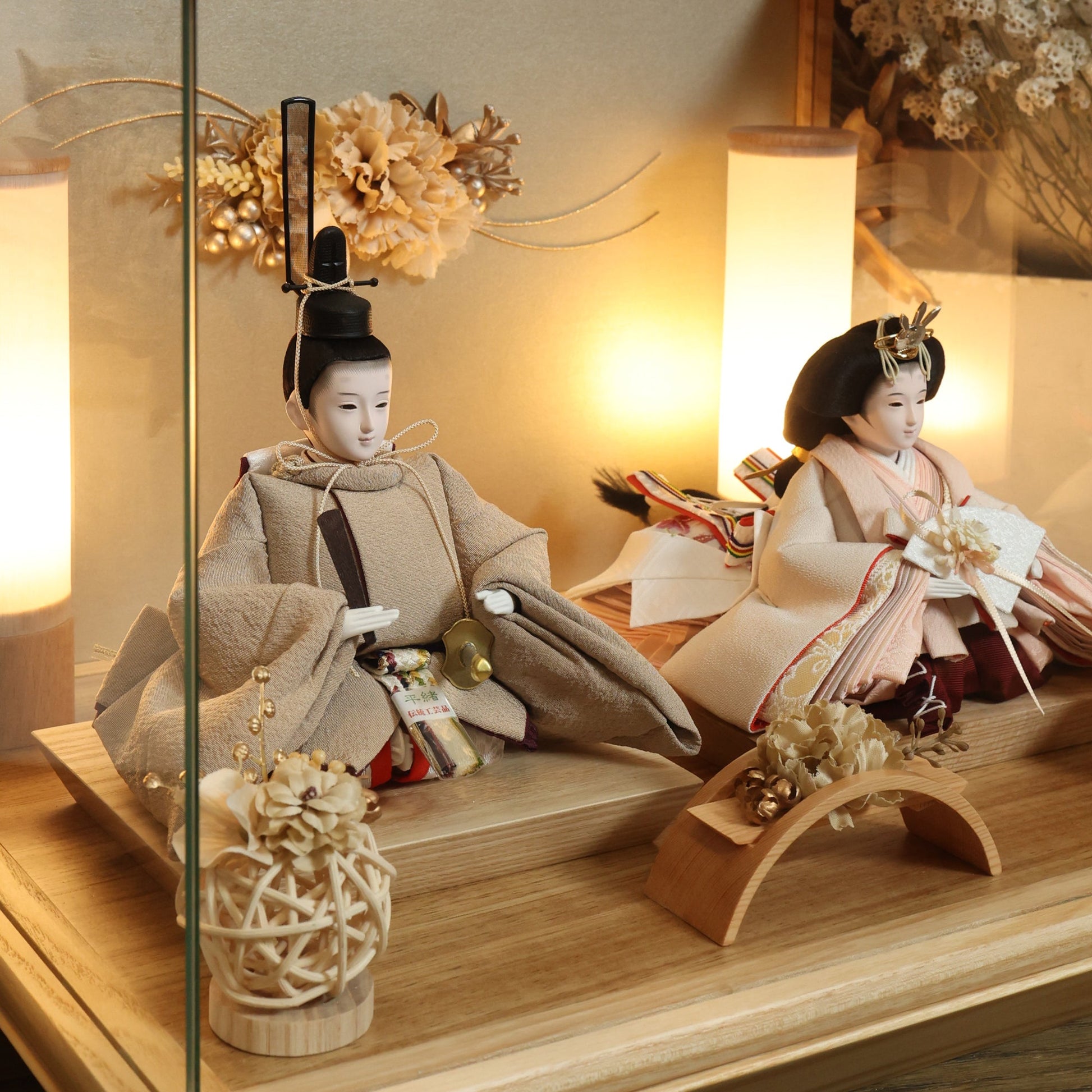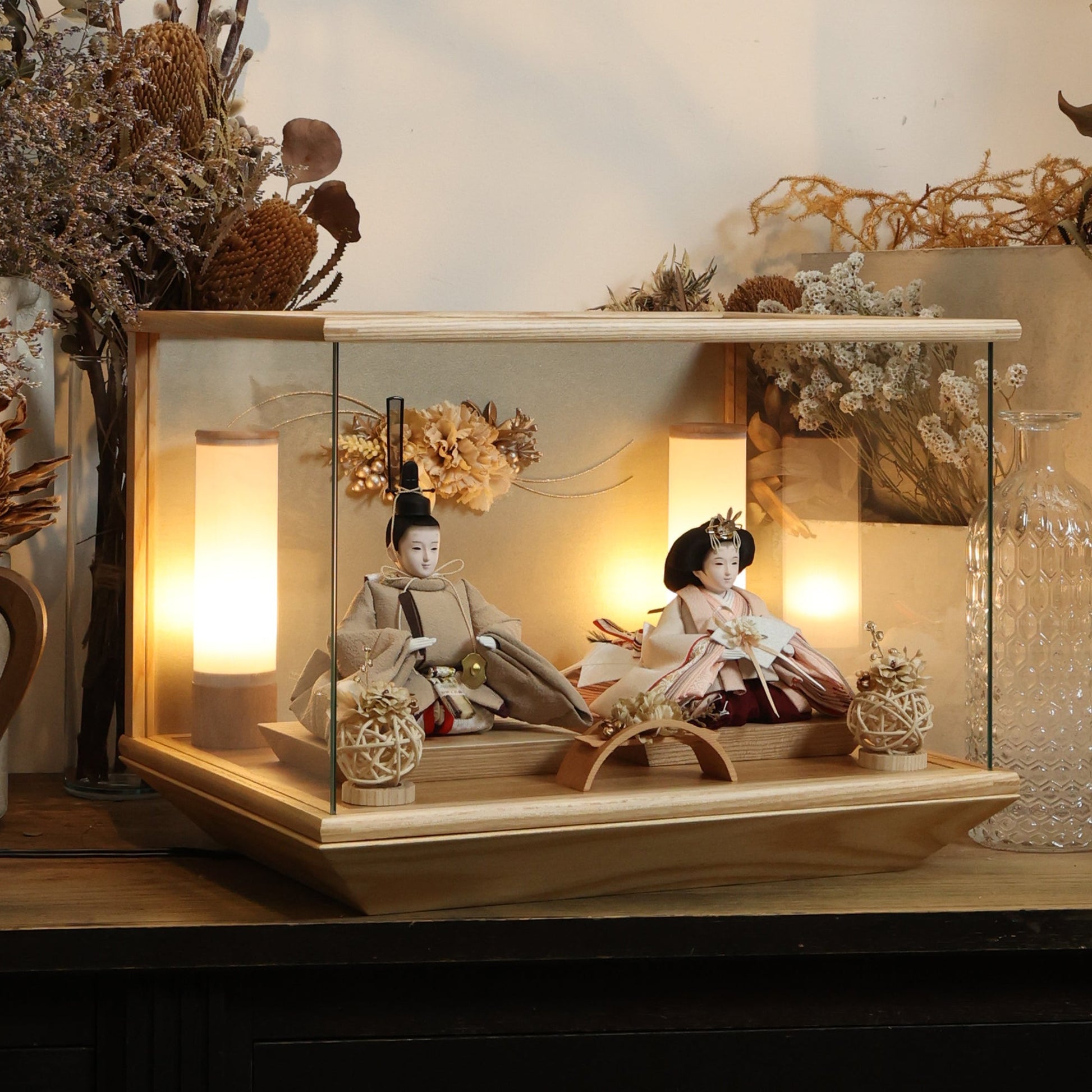 通常2mm厚が一般的な中、当店ではより高品質なAGC製3mmガラスを採用しています。厚みが増すことで強度と安全性が高まり、透明度の高いクリアな美しさを保ちます。大切な雛人形を守りながら、高級感のある見栄えを実現しています。