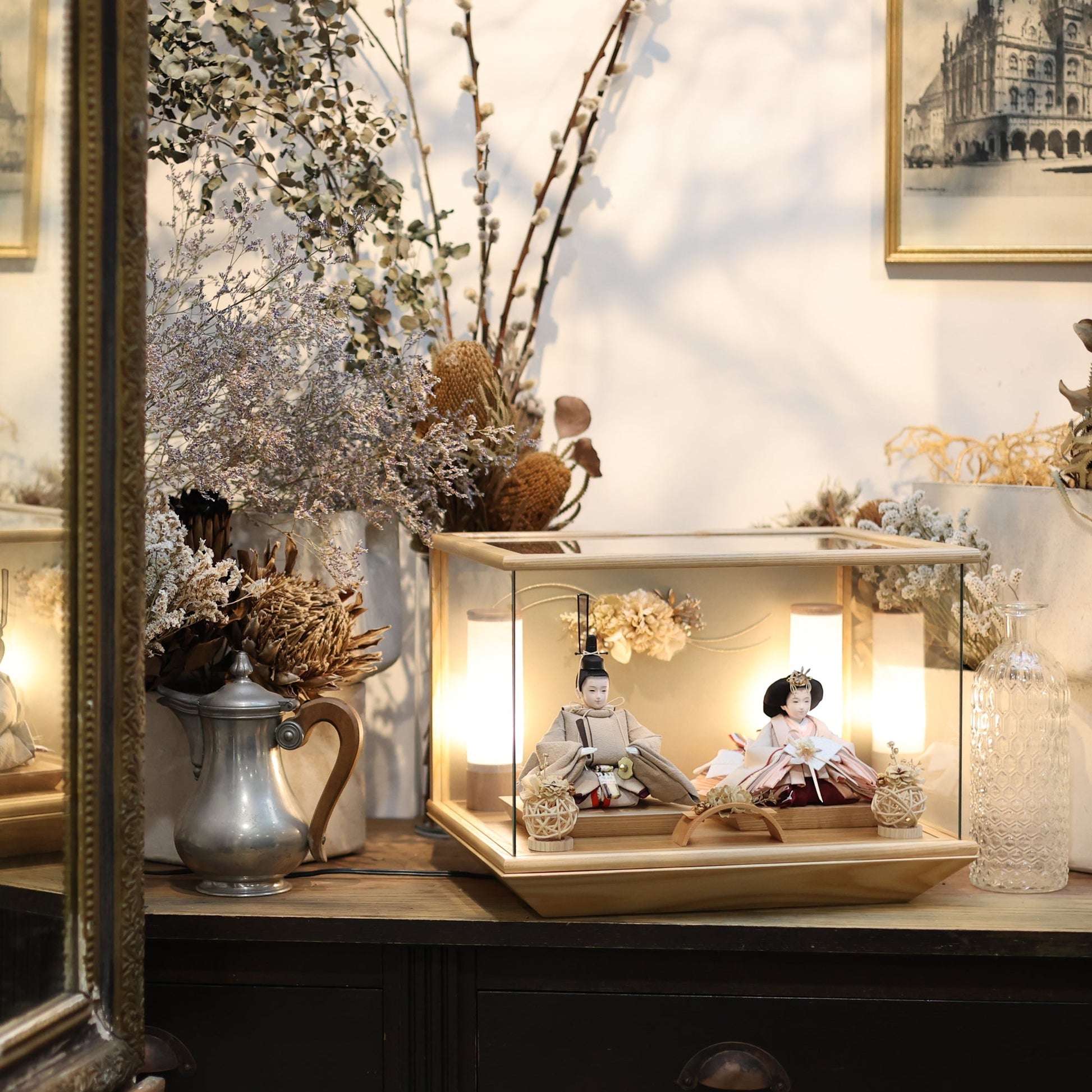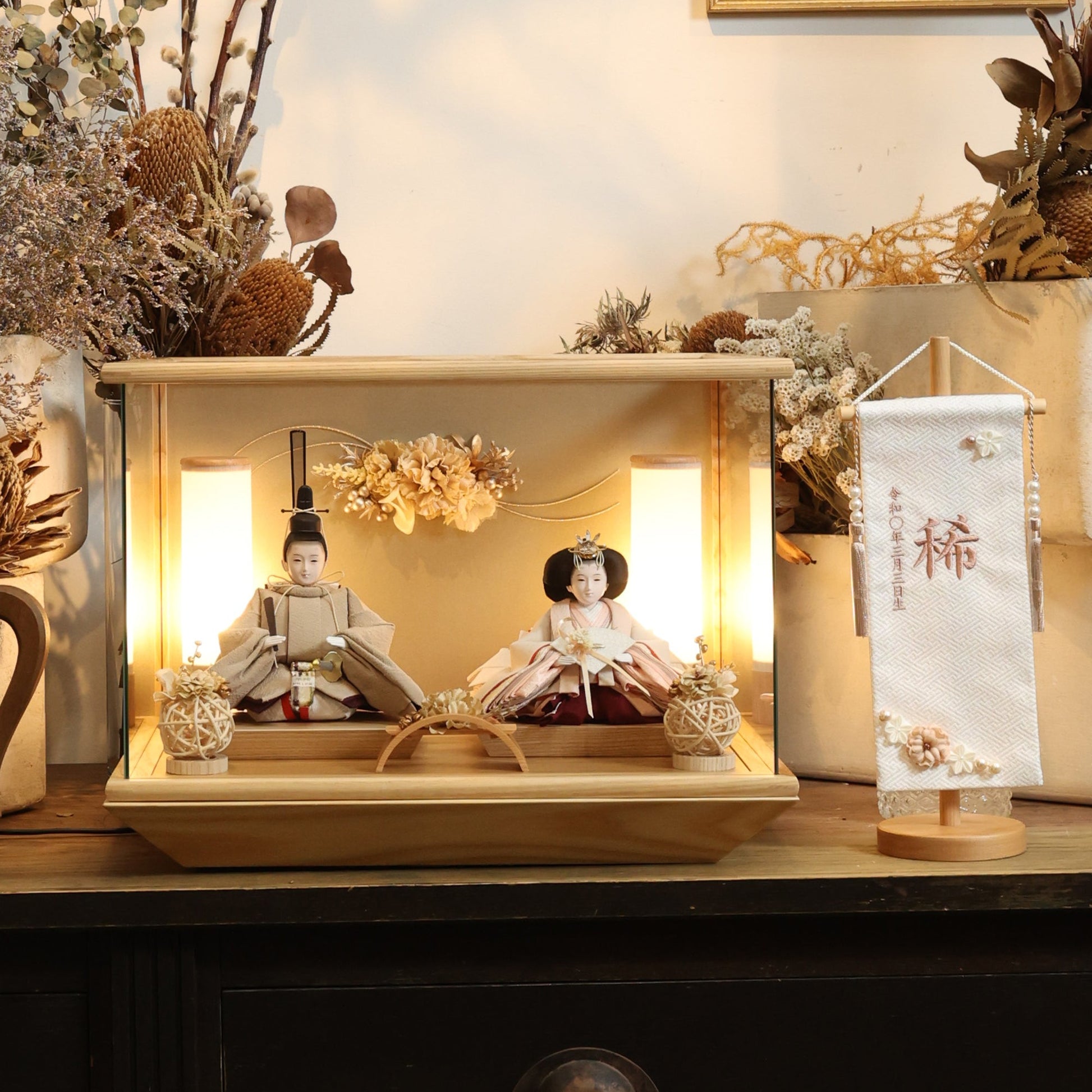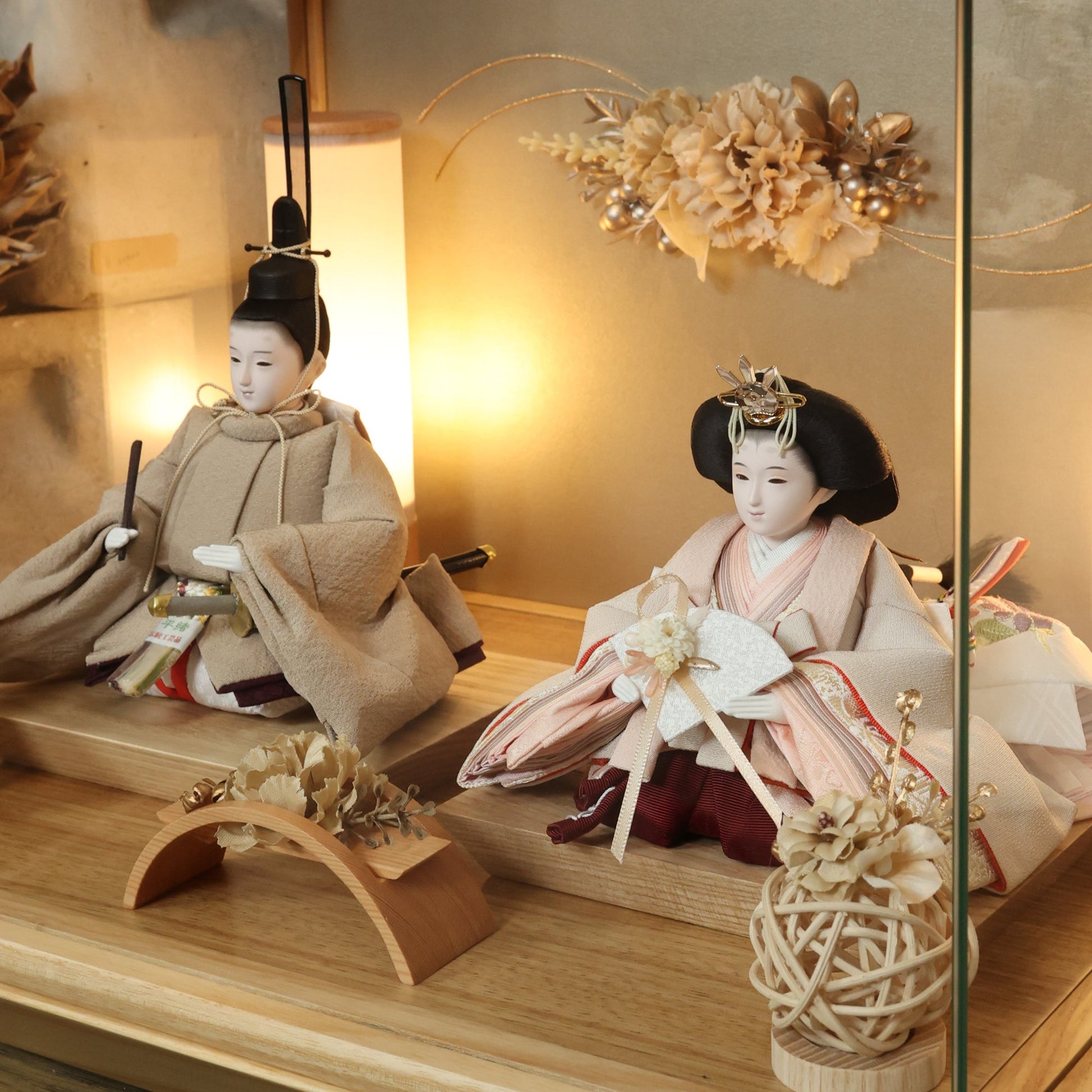 通常2mm厚が一般的な中、当店ではより高品質なAGC製3mmガラスを採用しています。厚みが増すことで強度と安全性が高まり、透明度の高いクリアな美しさを保ちます。大切な雛人形を守りながら、高級感のある見栄えを実現しています。